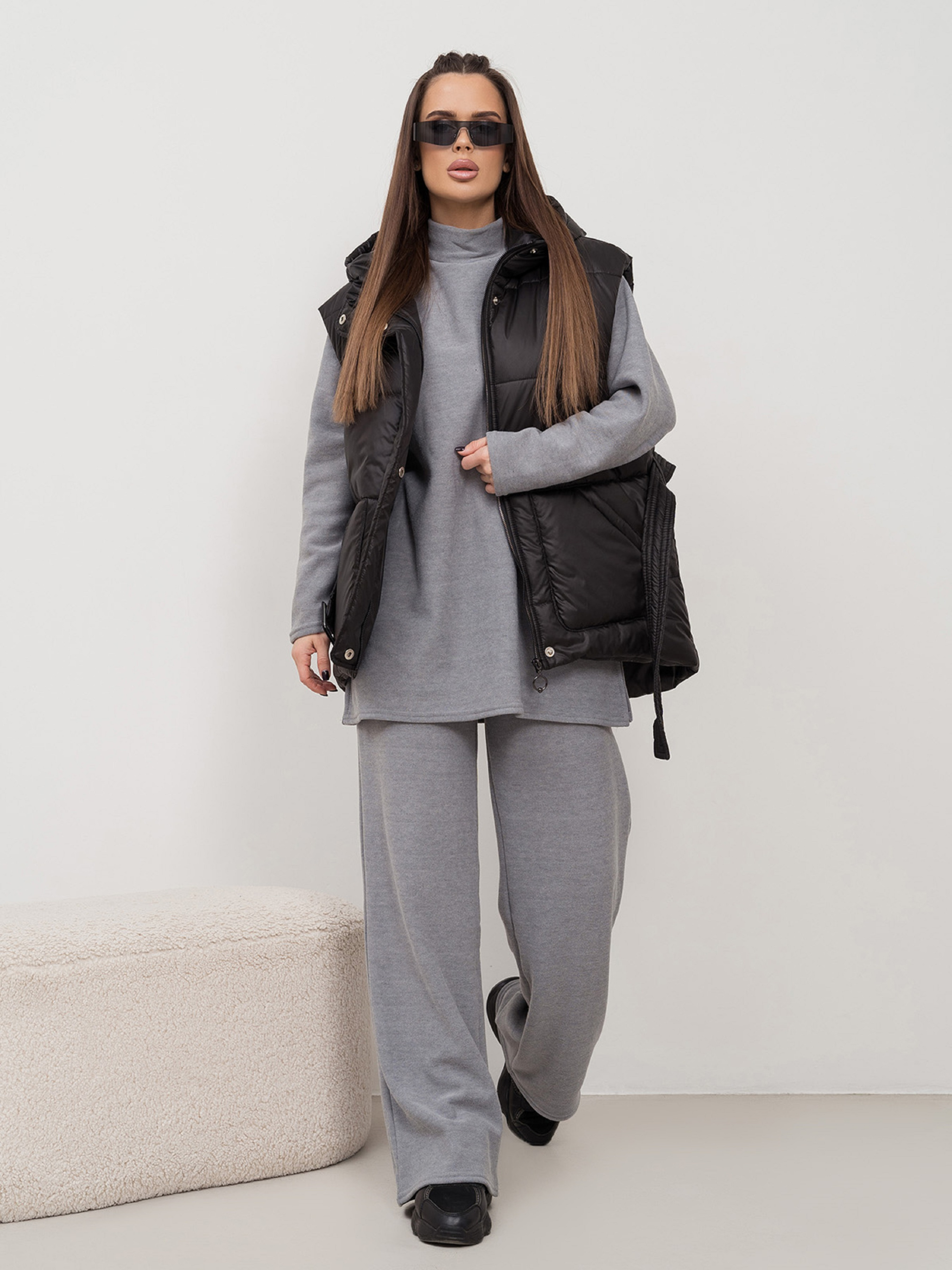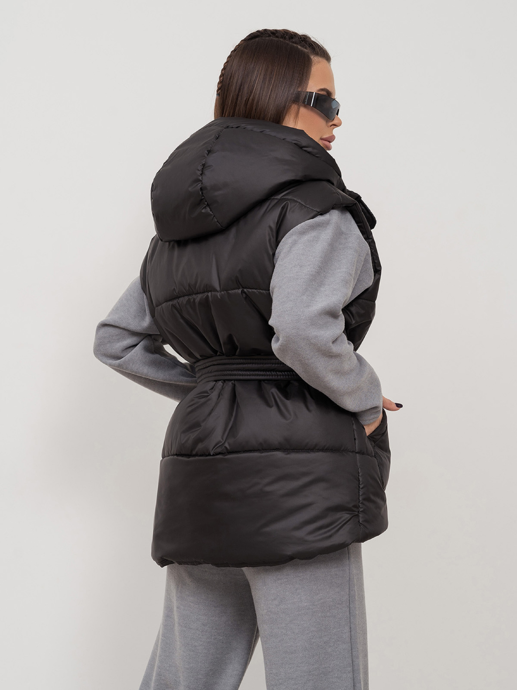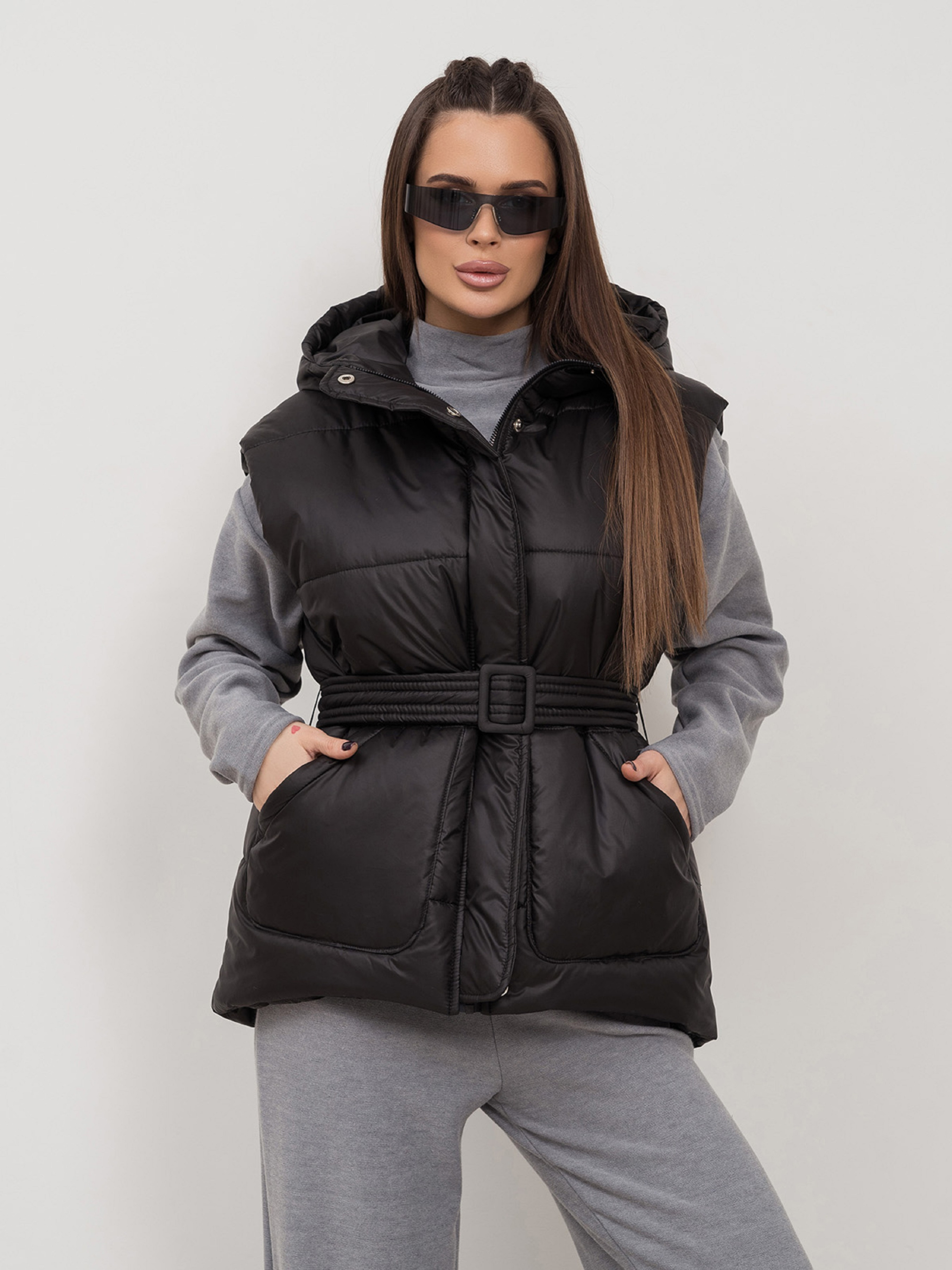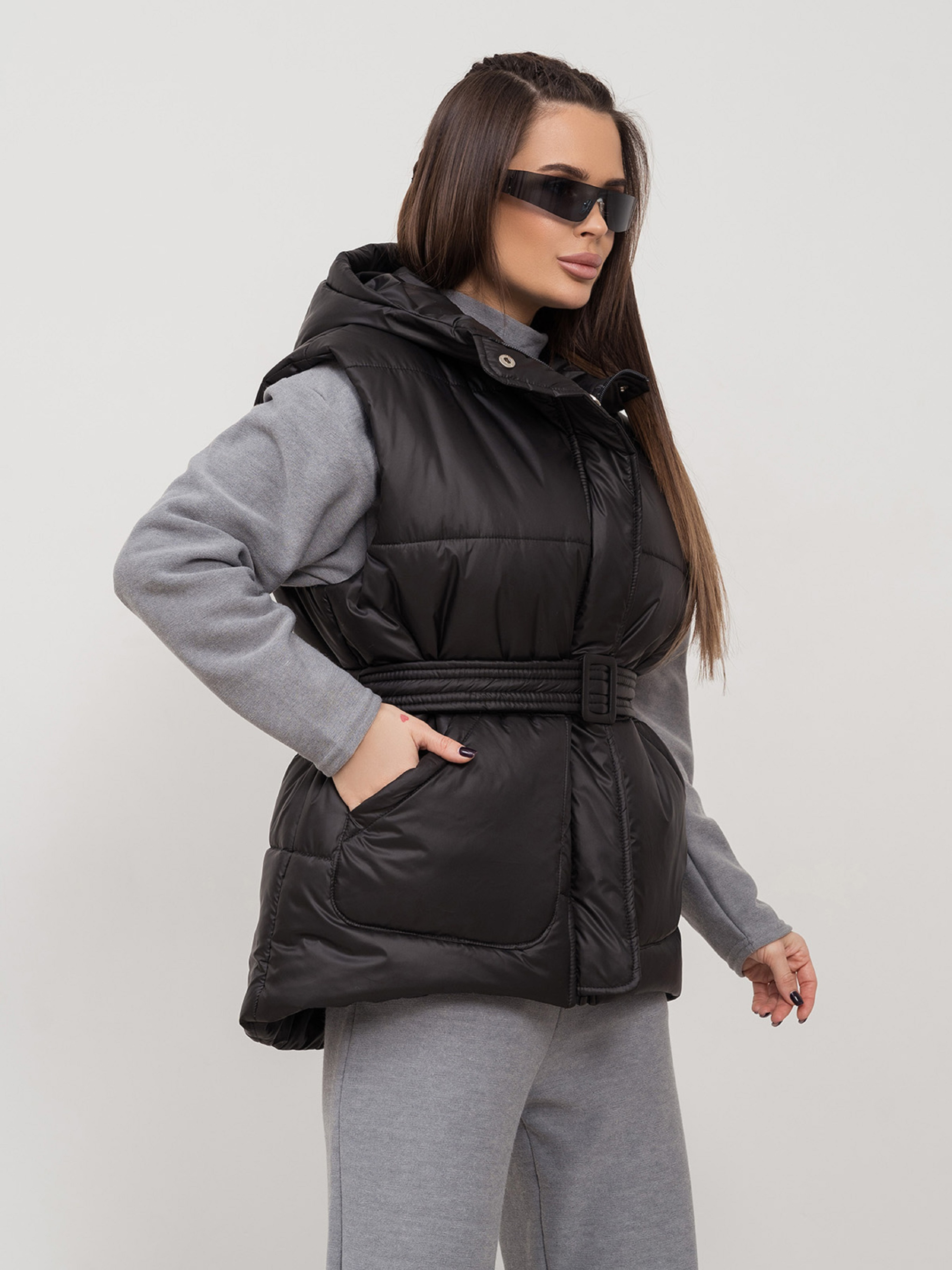 Чорна утеплена жилетка зі знімним поясом, виготовлена з плащової тканини на синтепоні. Модель асиметричного вільного крою з капюшоном та кишенями. Блискавка жилета з клапаном на кнопках.Напівобхват: Груди: S (58), M (60), L (62), XL (64), Довжина виробу - 66-73, Тканина: Низька еластичність.