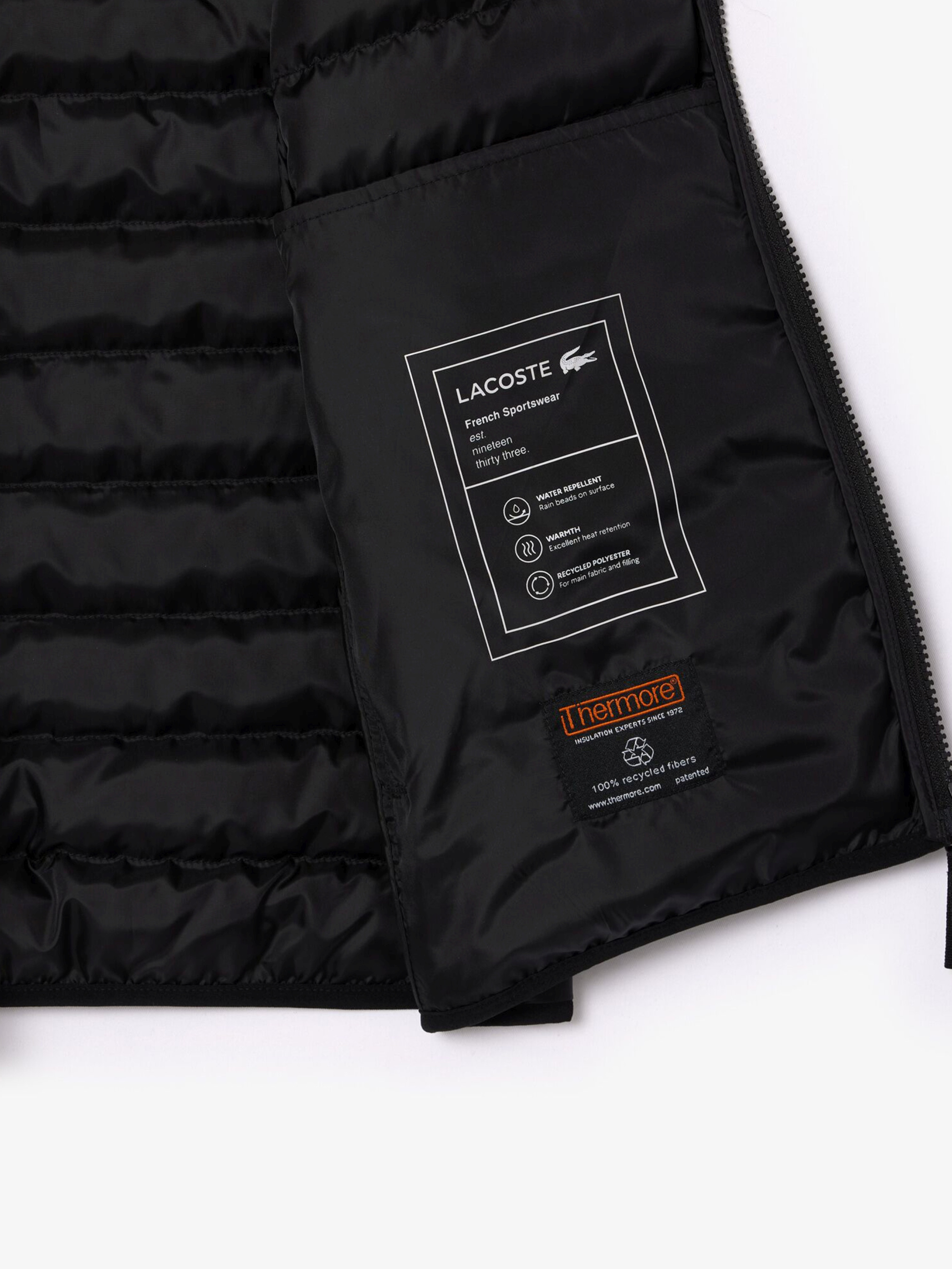 Сучасний водонепроникний жилет від Lacoste, експертів у спортивному одязі з 1933 року. Має високий комір і еластичні пройми, які допомагають зберегти тепло в прохолодні дні. Заповнення Thermore:registered: сертифіковане, забезпечує оптимальне збереження тепла та кращі ізоляційні властивості, ніж класичні заповнювачі. Матеріал: 100% поліестер Водонепроникна таффета Заповнення з переробленого поліестеру Термальна ізоляція Ecodown Fibers Loft