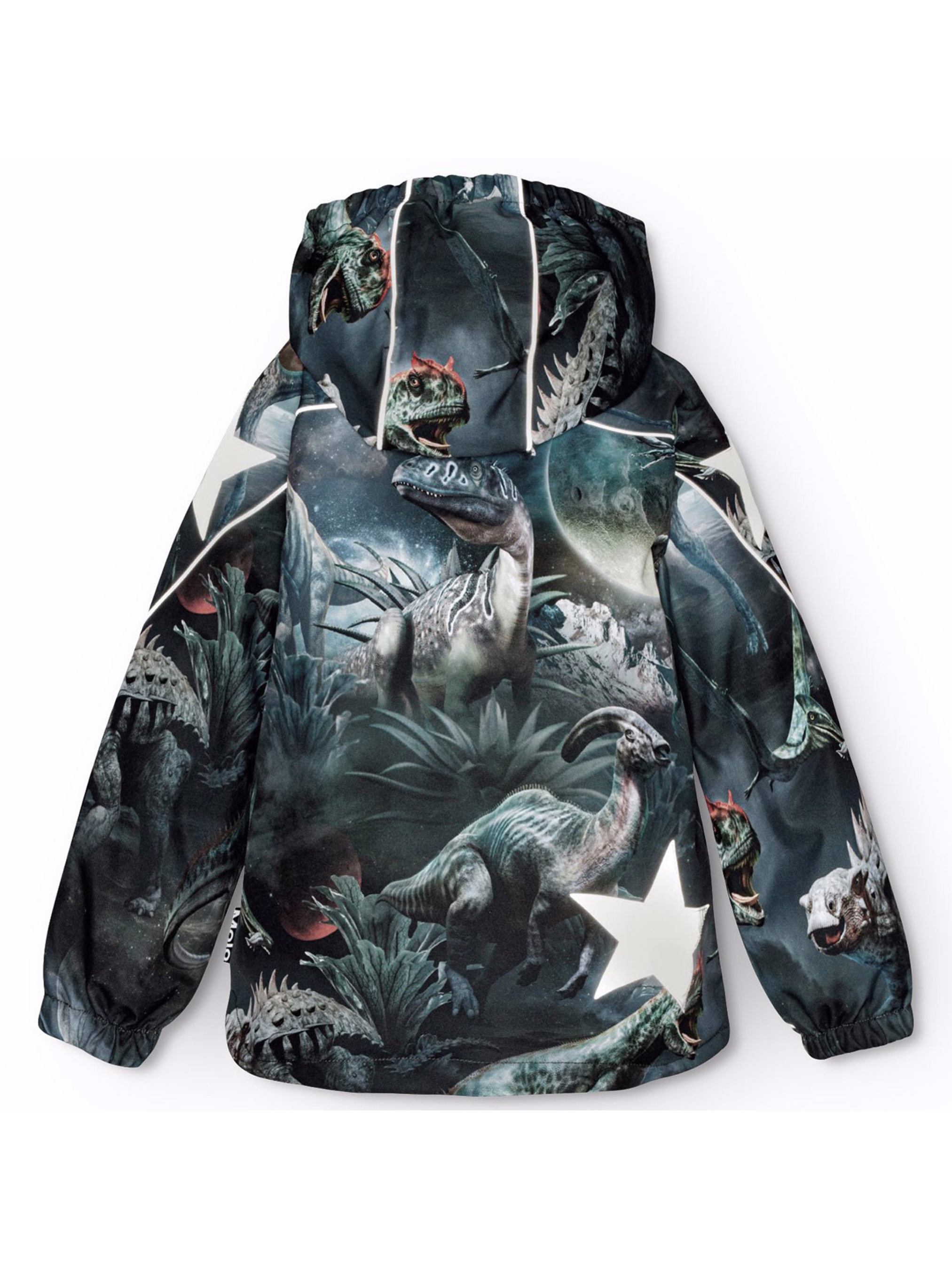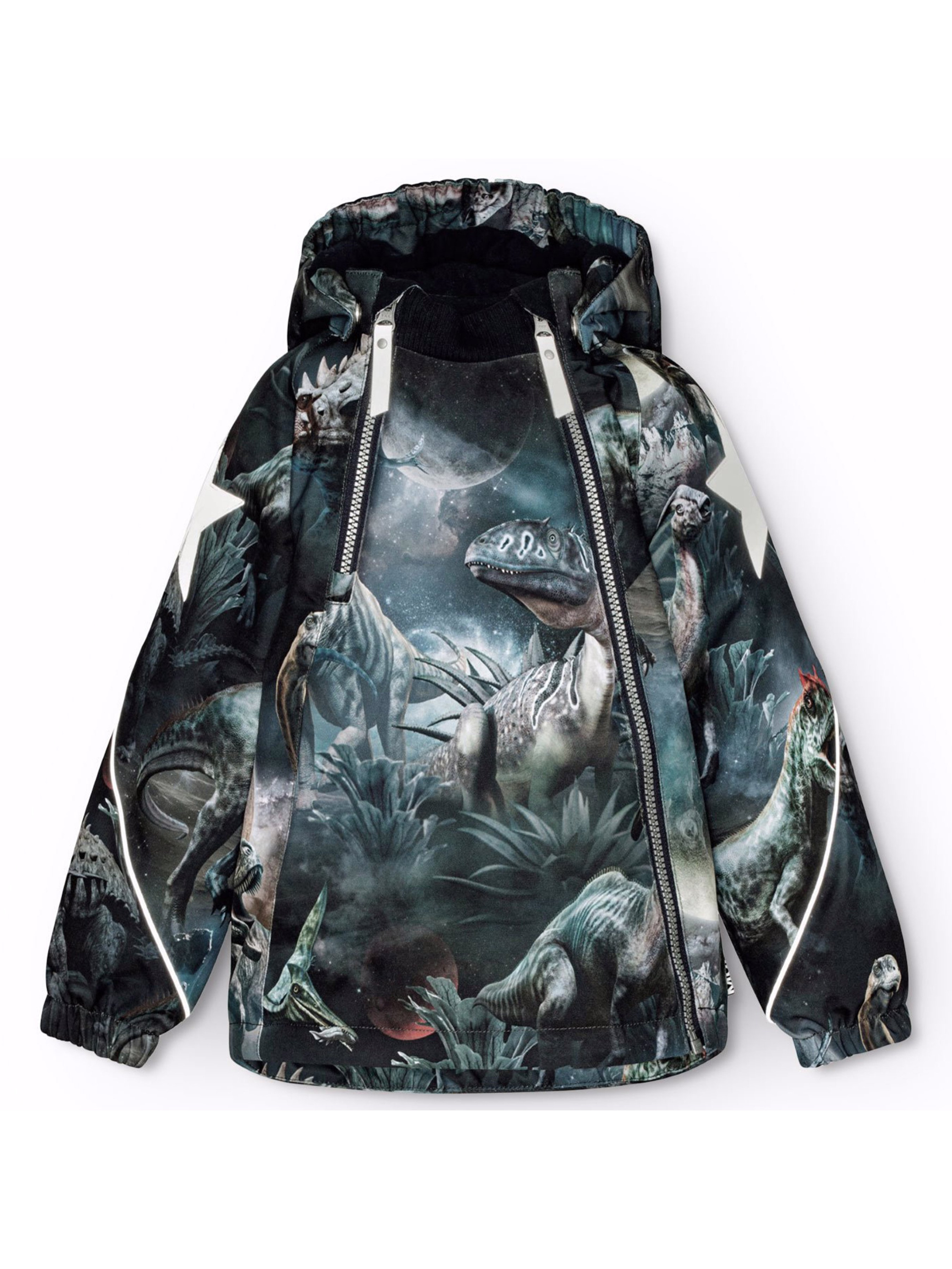 Зимова термокуртка Molo "Hopla Dino in Space" з яскравим принтом динозаврів у космосі. Особливості: водонепроникність – 20 000 мм; паропроникність – 20 000 г/м²/24 год; утеплювач – 3M™ Thinsulate™ Type EC (Advanced) зберігає тепло у зимову погоду до -20°C; основні шви додатково проклеєні; HEIQ eco dry – швейцарське високотехнологічне водостійке просочення (PFC-free); еластичні рукави захищають від попадання снігу; містить не менше 50% поліестеру з перероблених матеріалів, сертифікованого GRS (Global Recycled Standard)*; підкладка з високоякісного м'якого флісу на шиї та в капюшоні; спереду подвійна застібка "блискавка" із захистом підборіддя. Внутрішні клапани на "блискавках" захищають від снігу, вітру та води; знімний капюшон; світловідбивачі на капюшоні і рукавах та великі світловідбивачі-зірки на рукавах та спинці; рекомендований сезон – зима.