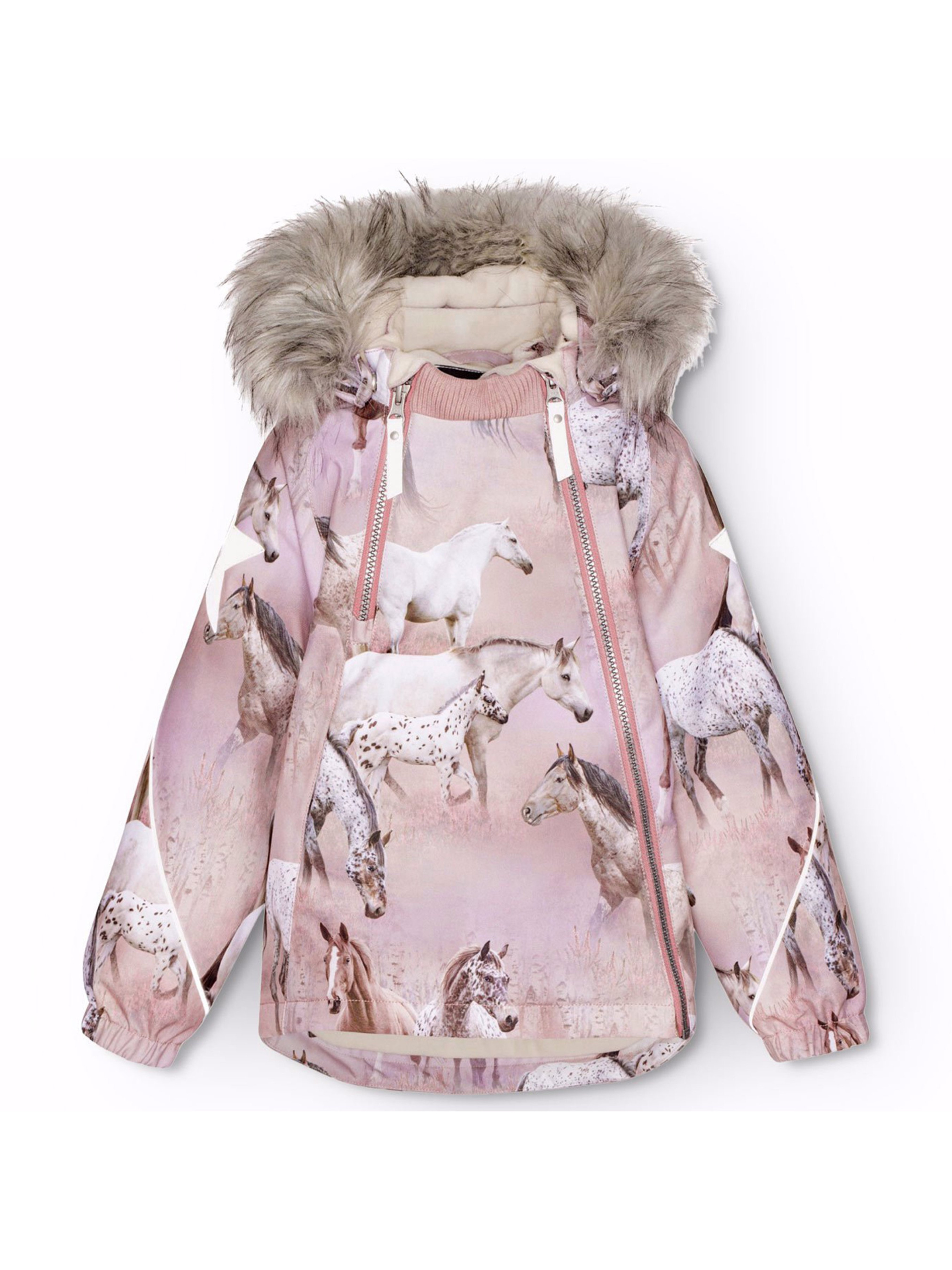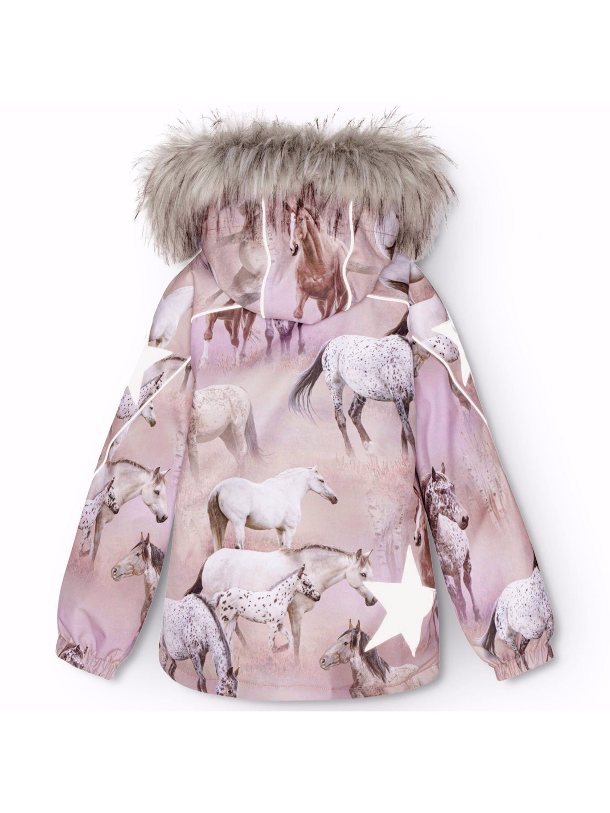 Зимова термокуртка Molo "Hopla Fur Dreamy Horses" з казковим принтом коней в рожевих відтінках. Особливості: водонепроникність – 20 000 мм; паропроникність – 20 000 г/м²/24 год; утеплювач – 3M™ Thinsulate™ Type EC (Advanced) зберігає тепло у зимову погоду до -20°C; основні шви додатково проклеєні; HEIQ eco dry – швейцарське високотехнологічне водостійке просочення (PFC-free); еластичні рукави захищають від попадання снігу; містить не менше 50% поліестеру з перероблених матеріалів, сертифікованого GRS (Global Recycled Standard)*; підкладка з високоякісного м'якого флісу на шиї та в капюшоні; спереду подвійна застібка "блискавка" із захистом підборіддя. Внутрішні клапани на "блискавках" захищають від снігу, вітру та води; знімний капюшон з окантовкою зі штучного хутра (хутро відстібається); світловідбивачі на капюшоні і рукавах та великі світловідбивачі-зірки на рукавах та спинці; рекомендований сезон – зима.