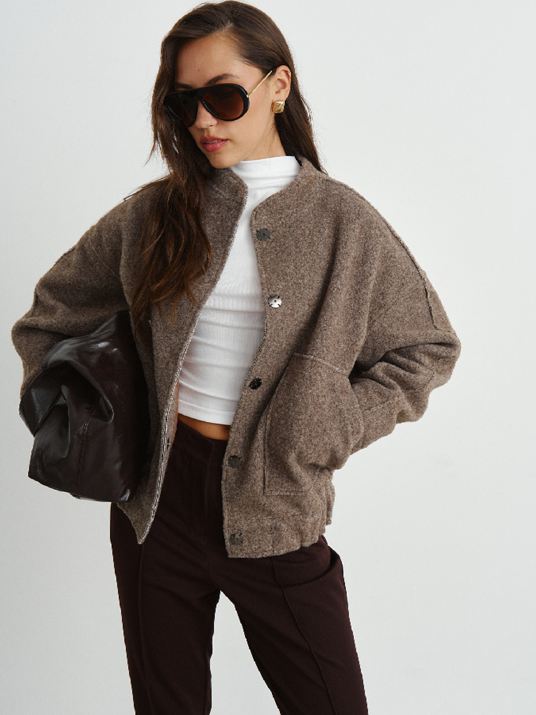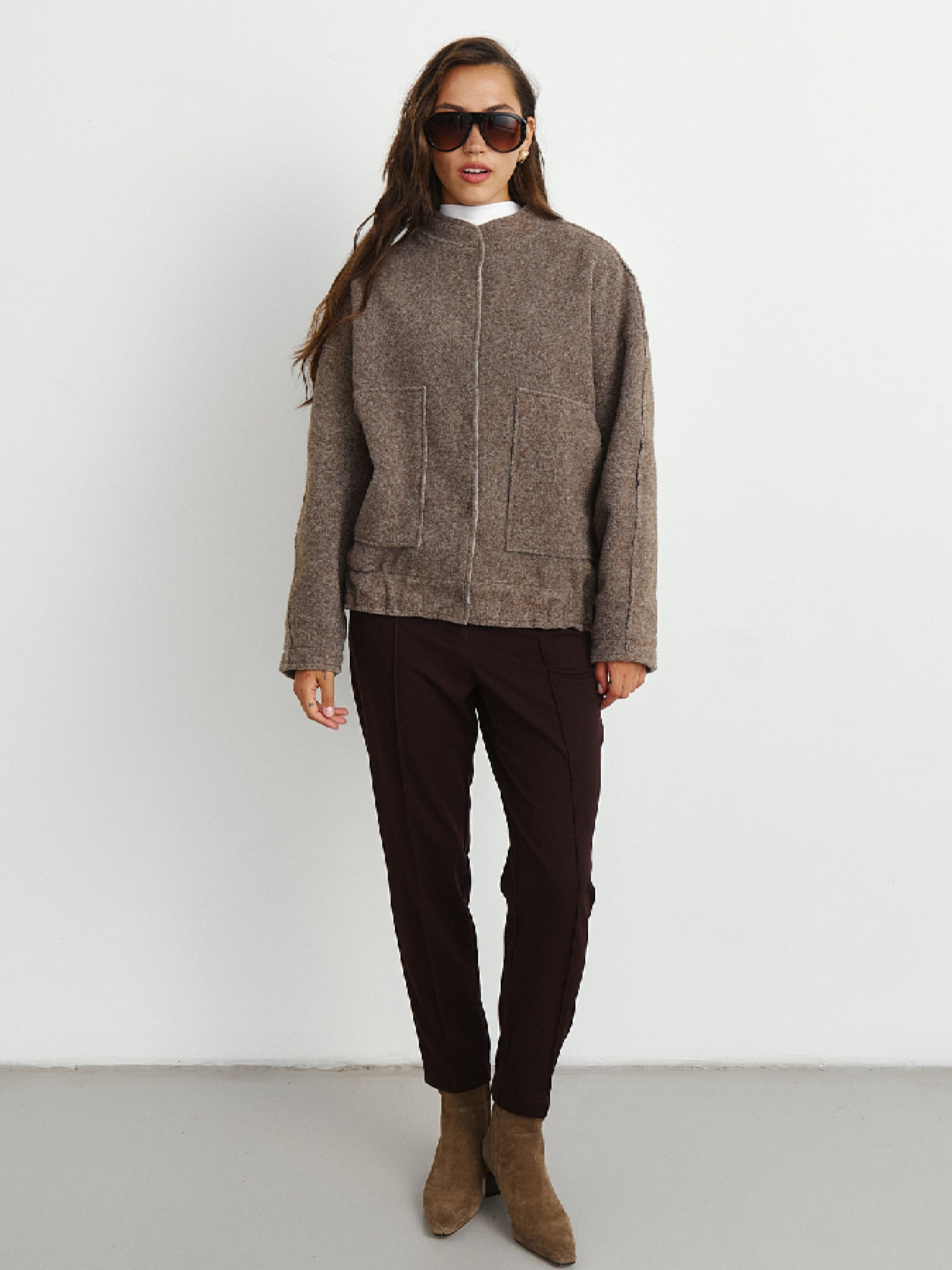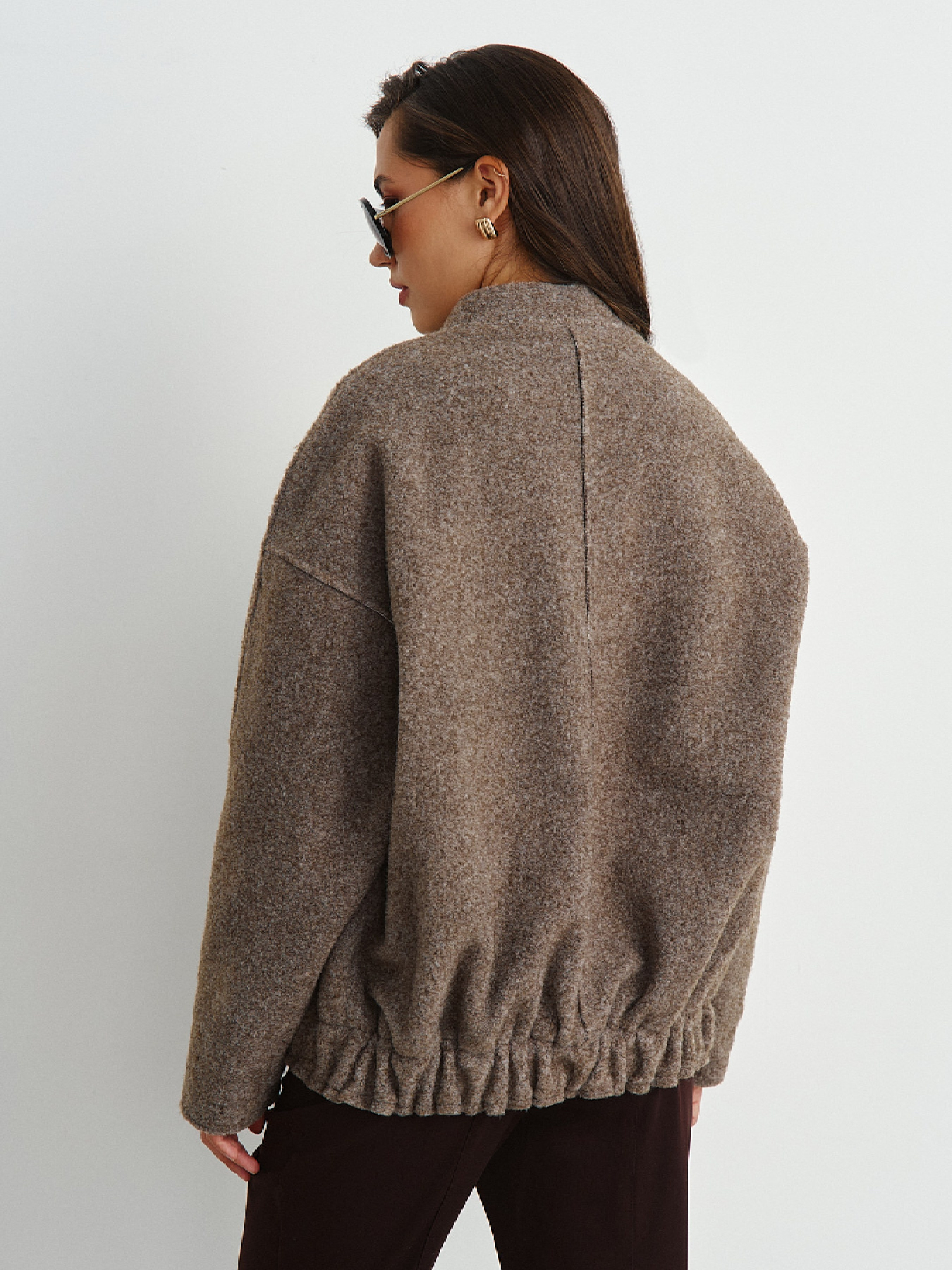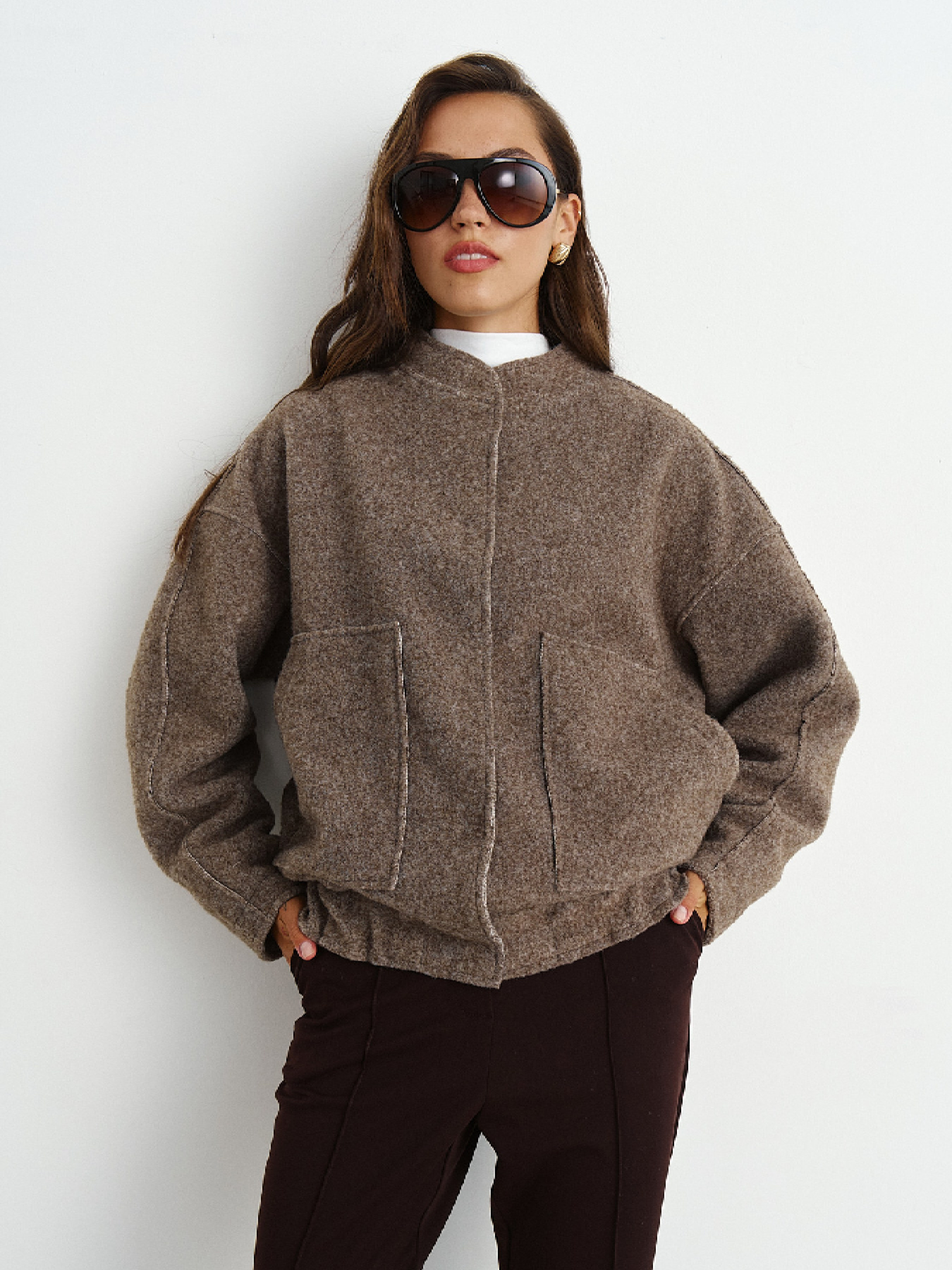 Теплий пальтовий бомбер з фактурної букле. Тканина з великим вмістом вовни, що чудово зігріває у прохолодні осінні дні. Виріб виконано з прийомами деконструктивізму, відкритими необробленими швами, що додає легкості та особливості моделі. Застібка на прихованих кнопках, глибокі кишені, вільна посадка, по низу вироба комфортна резинка. Заміри виробу по грудях: S-M 132 см, L-XL 136 см.
