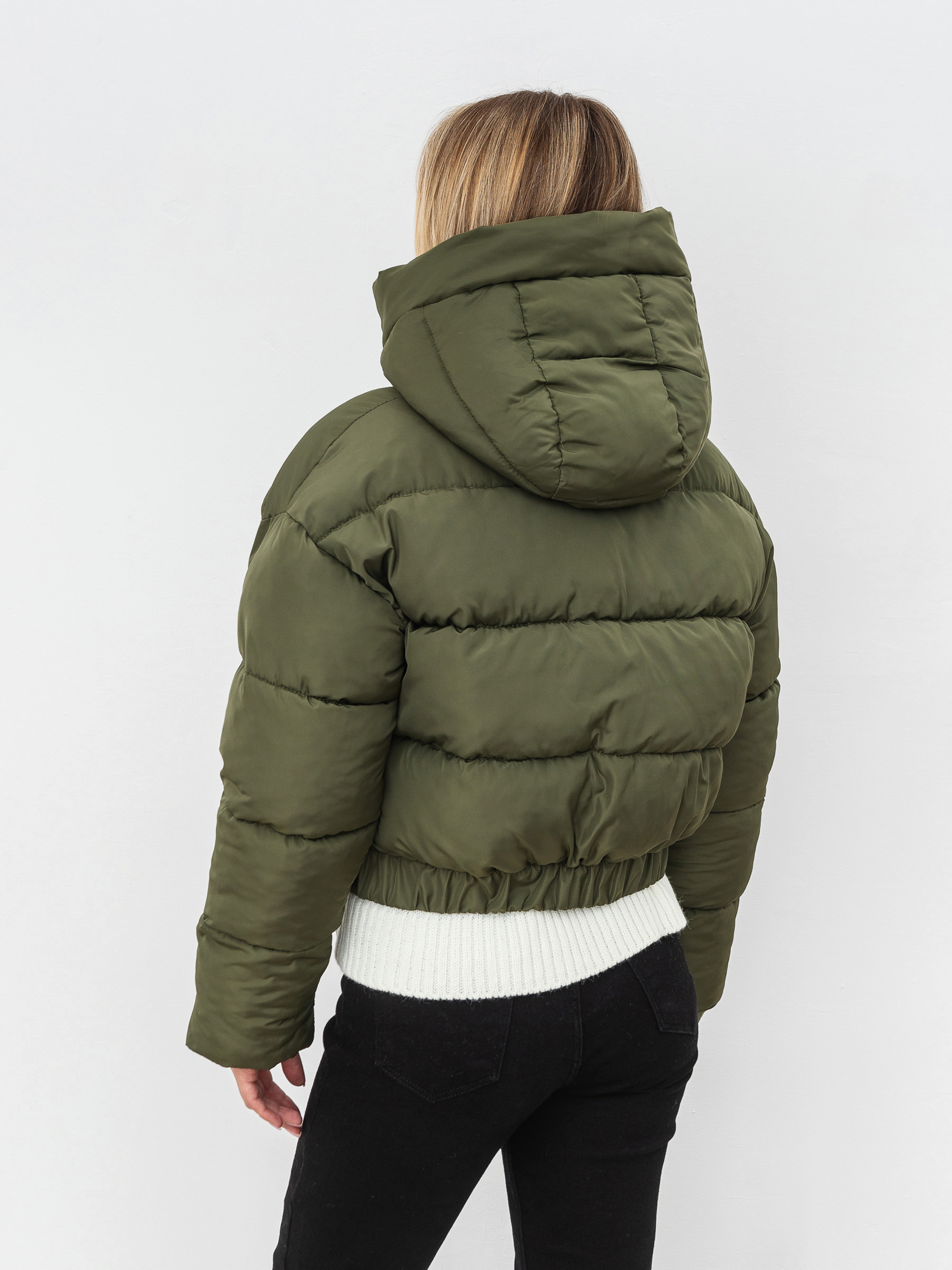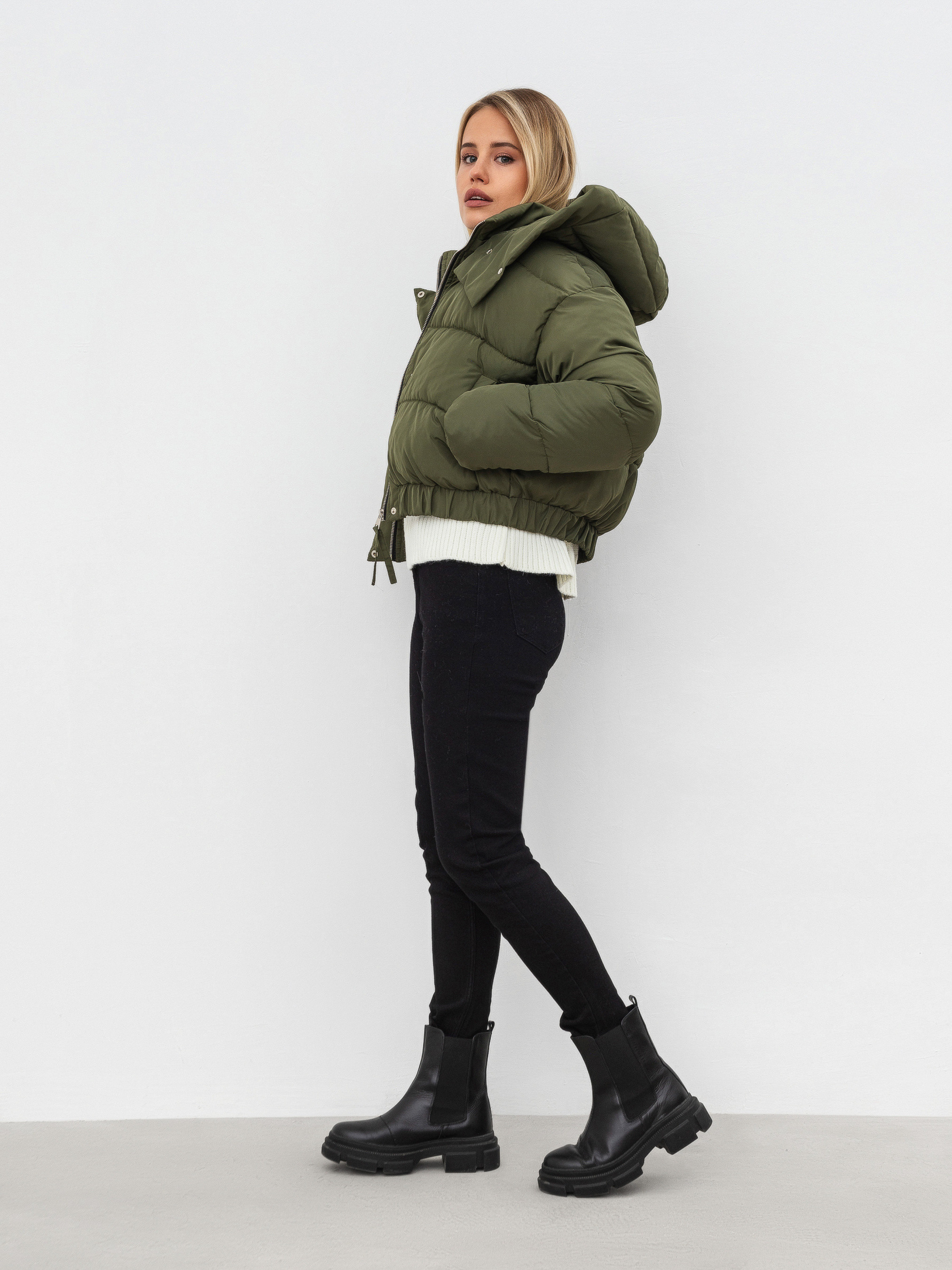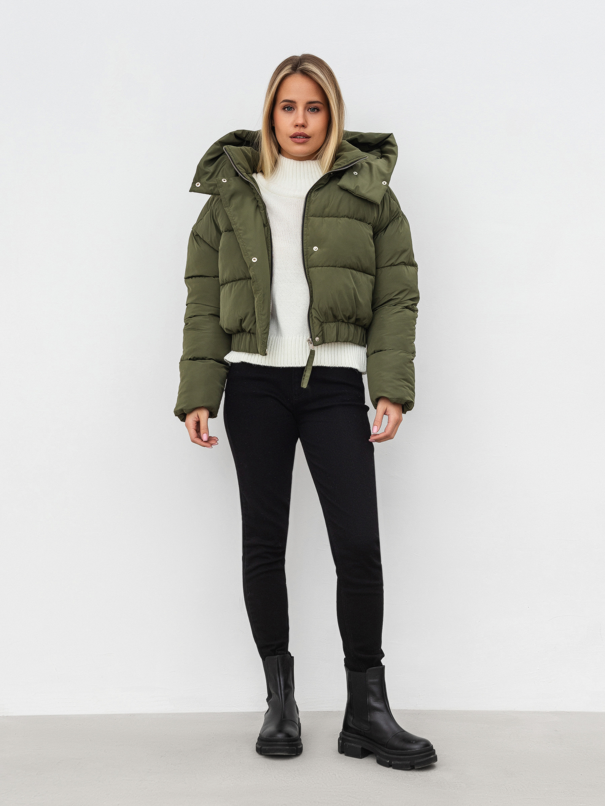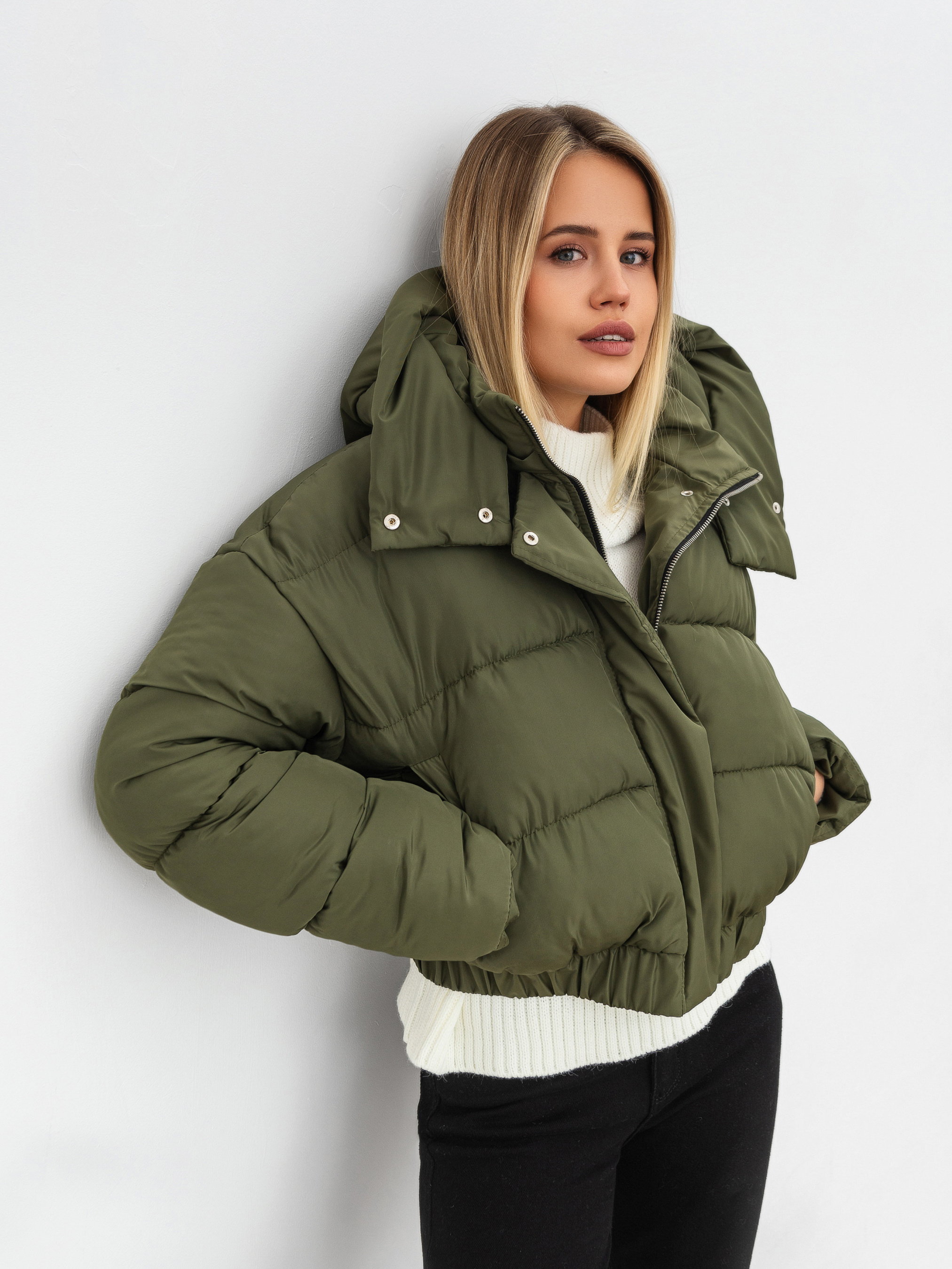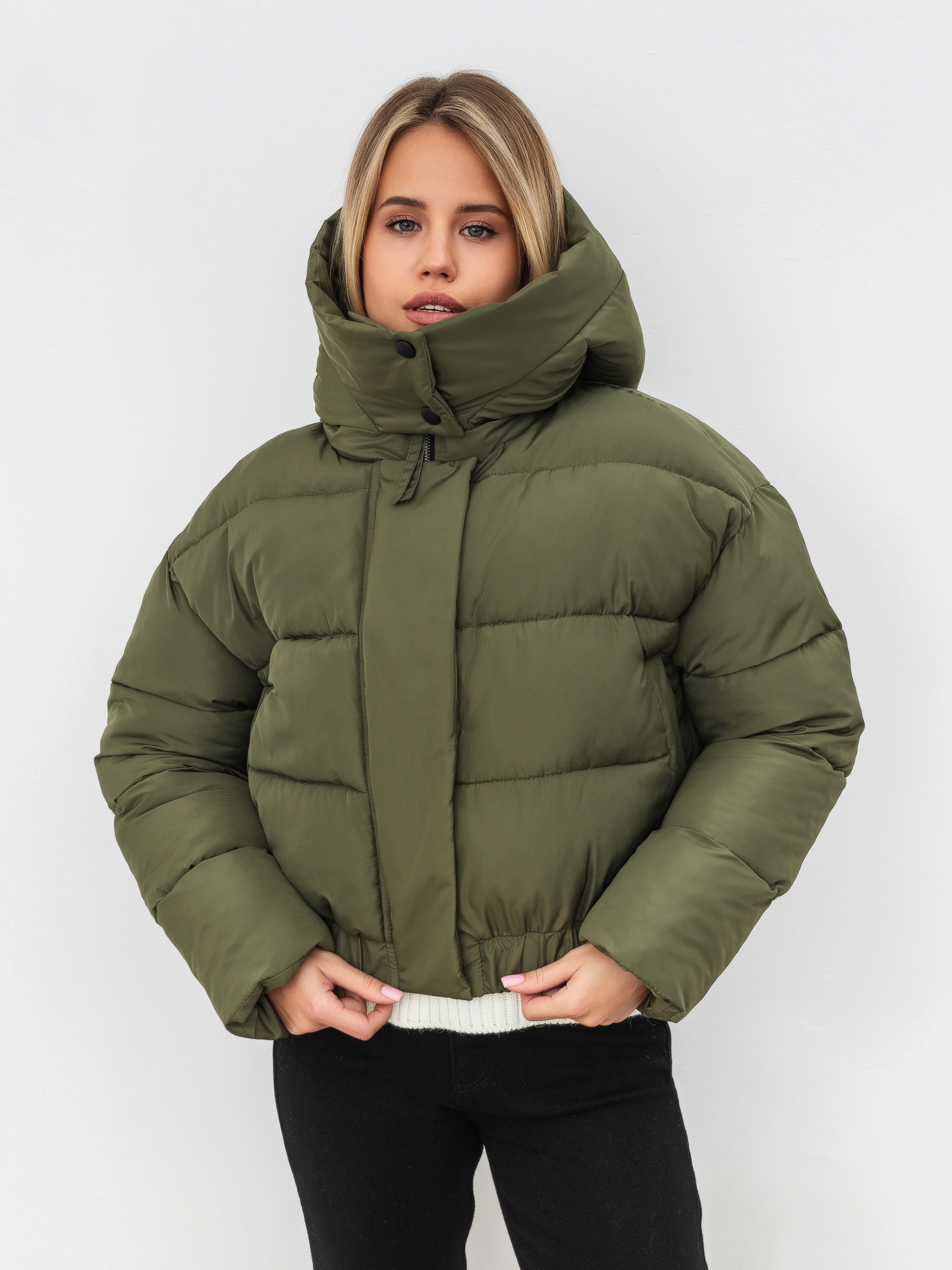 Вкорочена куртка з об'ємним капюшоном. Застібається на блискавку, із планкою на кнопки. Капюшон з'ємний. Кишеньки на флісі. Низ куртки на резинці. Теплий варіант на холод. Підійде під будь-який образ.