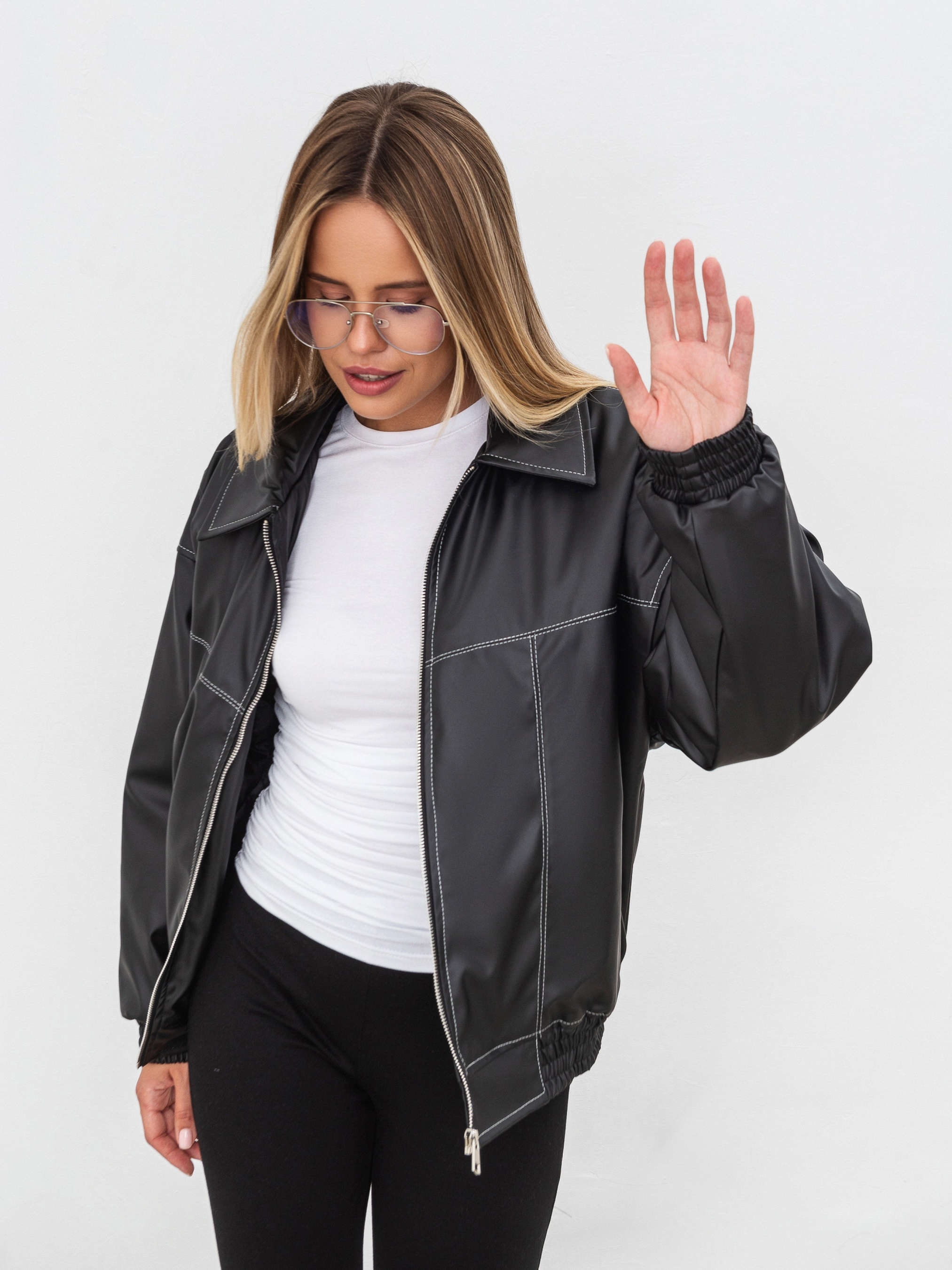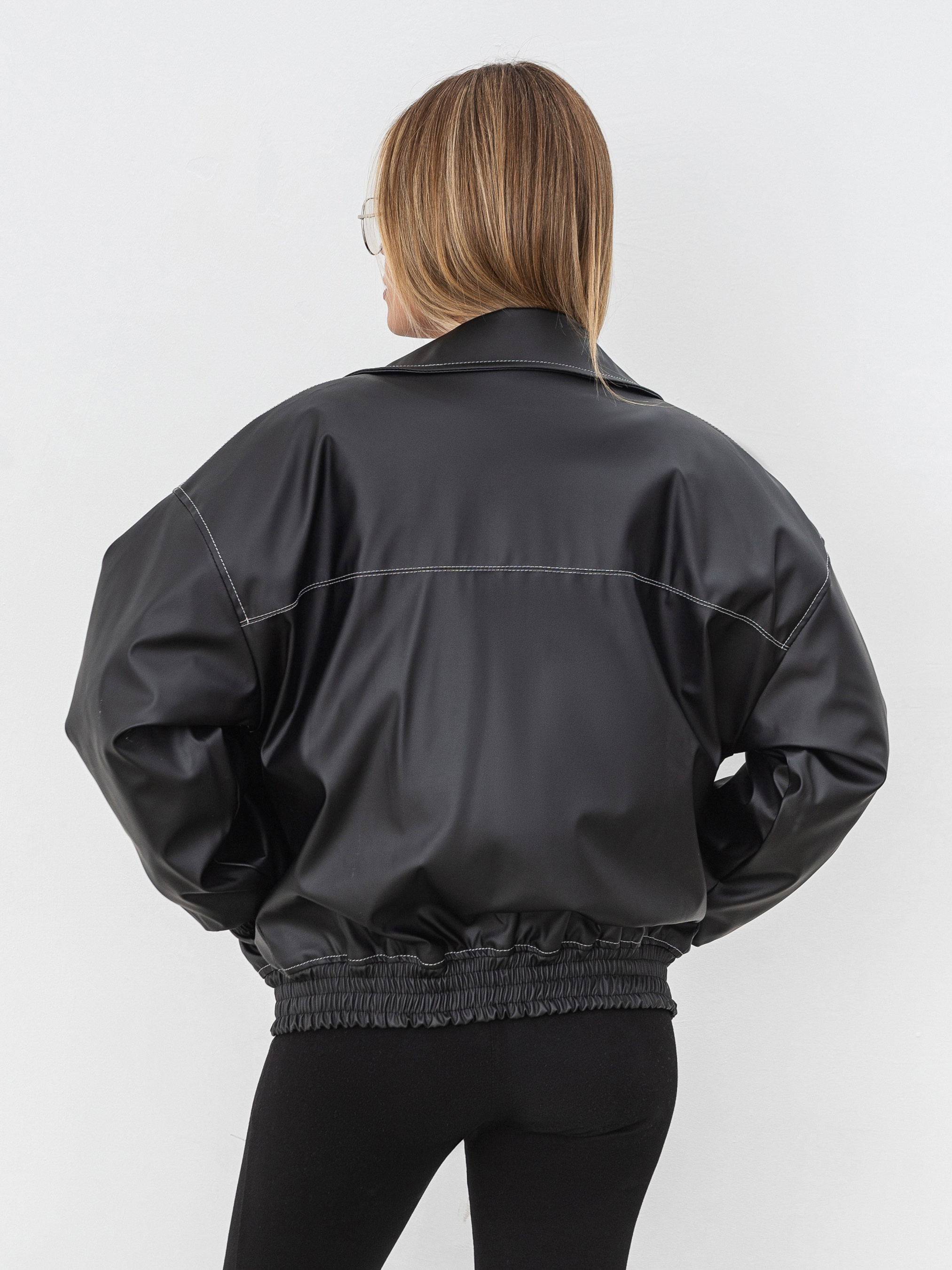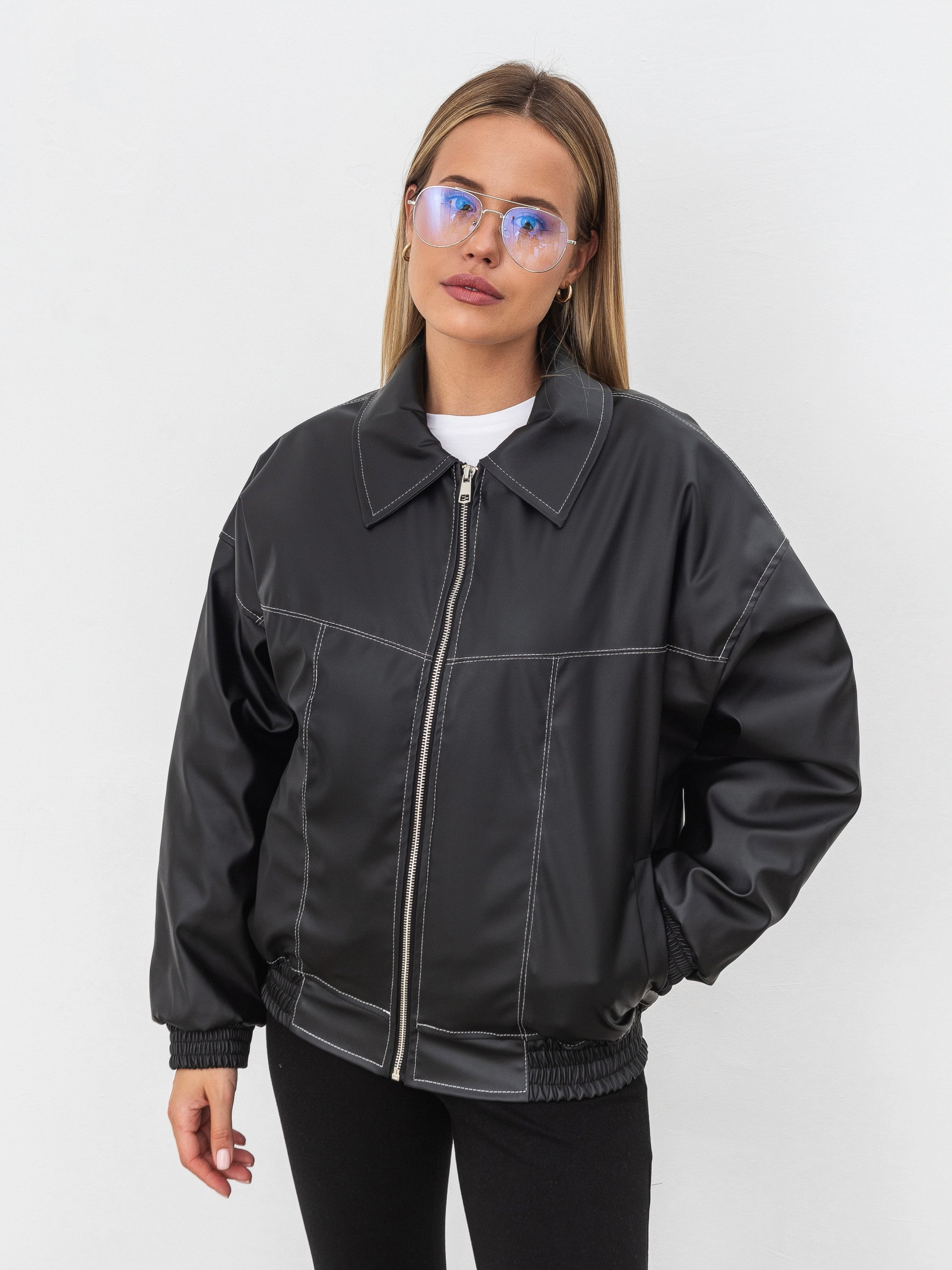 Оверсайз бомбер у вінтажному стилі. Спереду є дві кишеньки. Низ виробу та манжети рукавів мають резинку. У якості акцента є декоративні строчки контрасного кольору. Застібається на блискавку. Виготовлена з якісного замінника шкіри. Модель має утеплювач, тому підійде на холодну, вітряну погоду. Наповнювач Slimtex 100. Стильний бомбер легко комбінуватиметься зі шкіряними речима, брюками та шортами з костюмної тканини.
