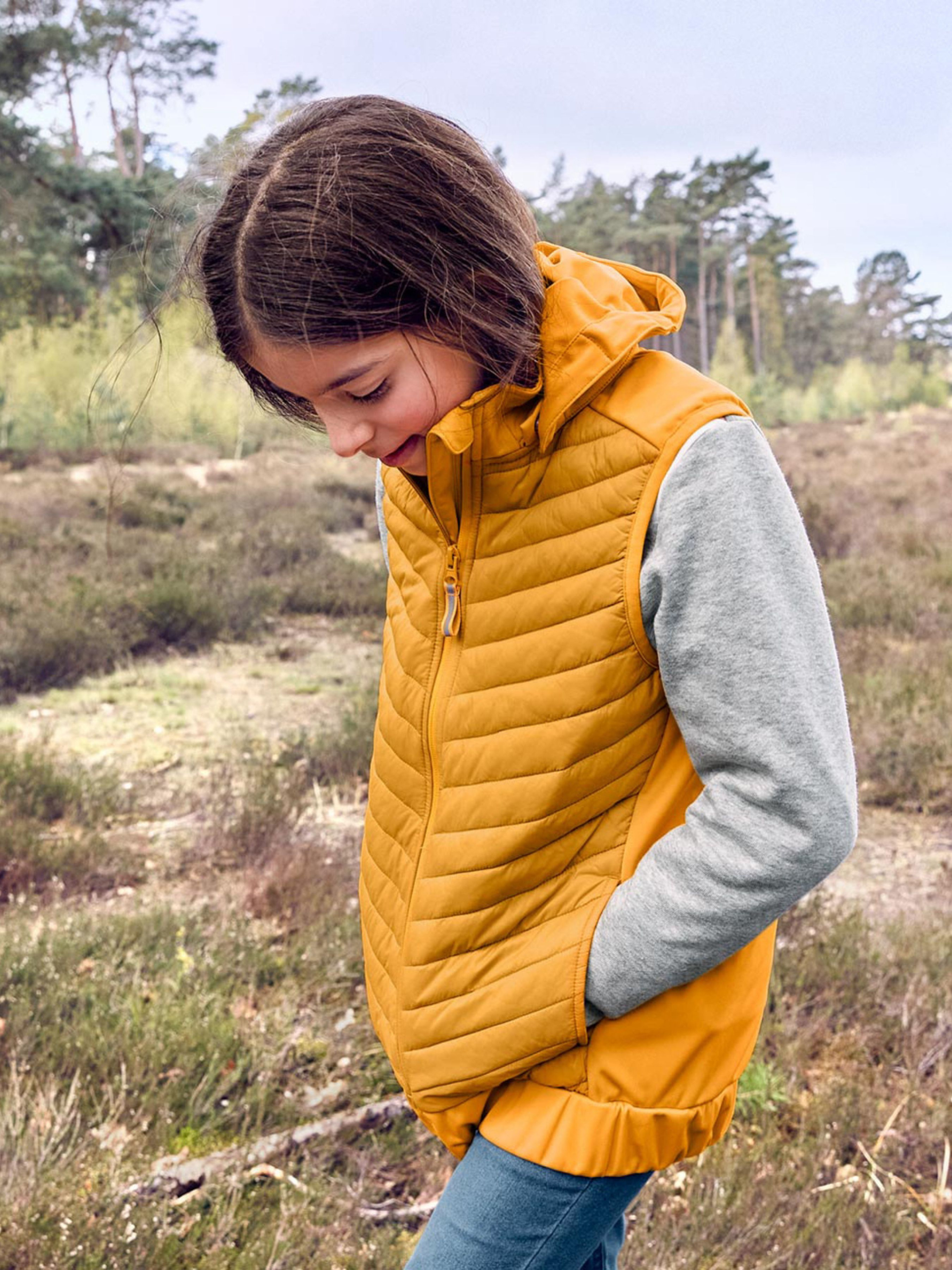 Комбінація вітрозахисного матеріалу софтшелл і теплоізоляційної прокладки спереду. Еластичний верхній матеріал для високого комфорту при носінні та оптимальної свободи рухів. Вітронепроникний, водовідштовхувальний і дихаючий – ідеальний для активного відпочинку. Верхній матеріал і набивка виготовлені з переробленого матеріалу. Дитячий жилет з екологічно чистим просоченням evoPel. Передня блискавка з захистом для підборіддя. Блискавка зі світловідбиваючою стрічкою grosgrain. Знімний капюшон. Тег імені, який можна записувати. Бічні кишені. Перевірено на вміст шкідливих речовин – сторонніми акредитованими інститутами. Зверніть увагу, вказано розміри за Євро шкалою (Український розмір = Євро + 6) Склад: Зовнішній матеріал і набивка 100% поліестер (перероблений). Передня частина 100% поліамід (перероблений). Розмір 170/176 (прибл. 14 – 16 років) ПОГ: 47 см, ПОТ: 51 см, Довжина: 69 см, Одяг бренду TCM Tchibo практично весь без паперових етикеток, за рідкісним винятком, і зі зрізаними частково або повністю внутрішніми бірками і ярликами зі складом тканини та іншими даними.