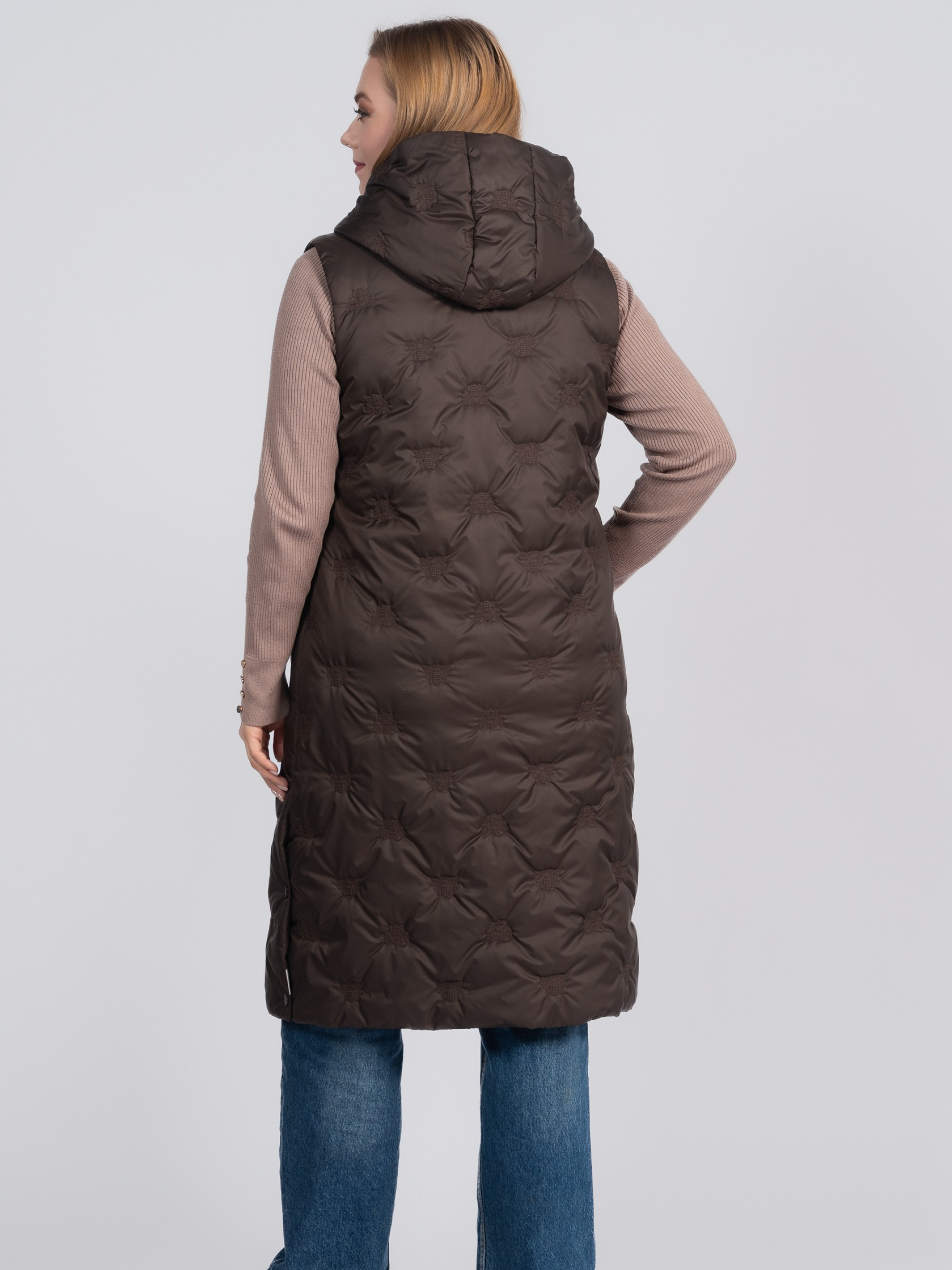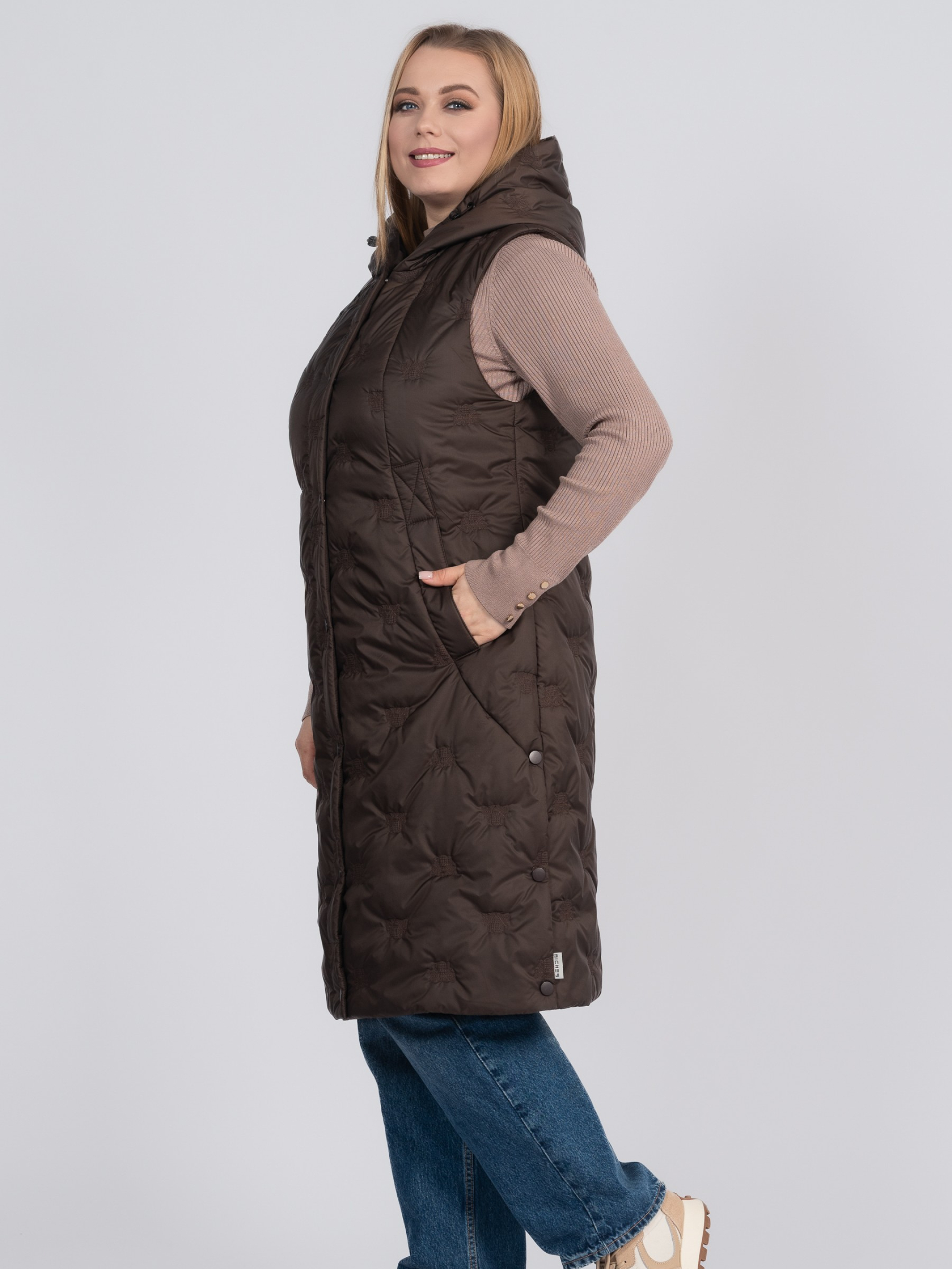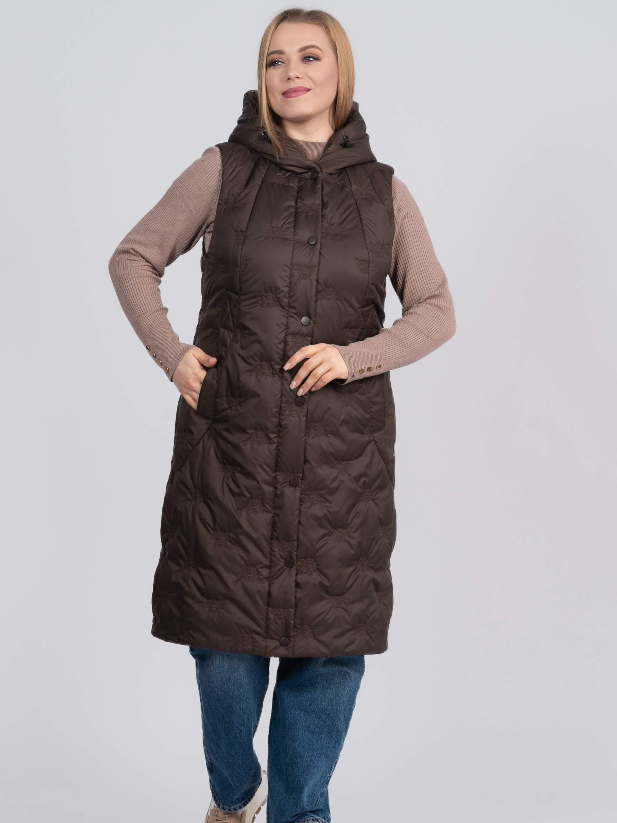 Жіночий довгий утеплений жилет великих розмірів — практична демісезонна модель, створена для комфорту та стильних повсякденних образів. Легкий А-силует м’яко розширюється донизу, забезпечуючи зручну посадку та свободу рухів, а оптимальна довжина до середини стегна додає захисту від прохолоди. По боках виробу передбачені функціональні кнопки для розстібання, що забезпечують більшу свободу рухів та додатковий комфорт під час носіння Жилет виконаний з оригінальним декоративним вишитим візерунком «бджілки», що надає моделі сучасного вигляду та підкреслює індивідуальний стиль. Незнімний каптур у поєднанні з коміром-стійкою надійно захищає від вітру. Застібка представлена блискавкою до низу стегна та додатковою планкою на кнопках. Дві зручні кишені та внутрішня кишеня для необхідних дрібниць. Легкий утеплювач забезпечує комфорт у весняно-осінній період, а універсальний дизайн дозволяє поєднувати жилет як зі спортивним, так і з casual-гардеробом. Розмір 50: ПОГ – 55, ПОС – 61, Довжина виробу – 104,5 Розмір 52: ПОГ – 57, ПОС – 63, Довжина виробу – 105 Розмір 54: ПОГ – 59, ПОС – 65, Довжина виробу – 105,5 Розмір 56: ПОГ – 61, ПОС – 67, Довжина виробу – 106 Розмір 58: ПОГ – 63, ПОС – 69, Довжина виробу – 106,5 Розмір 60: ПОГ – 65, ПОС – 71, Довжина виробу – 107 Розмір 62: ПОГ – 67, ПОС – 73, Довжина виробу – 107,5 Розмір 64: ПОГ – 69, ПОС – 75, Довжина виробу – 108 Розмір 66: ПОГ – 71, ПОС – 77, Довжина виробу – 108,5 Розмір 68: ПОГ – 73, ПОС – 79, Довжина виробу – 109