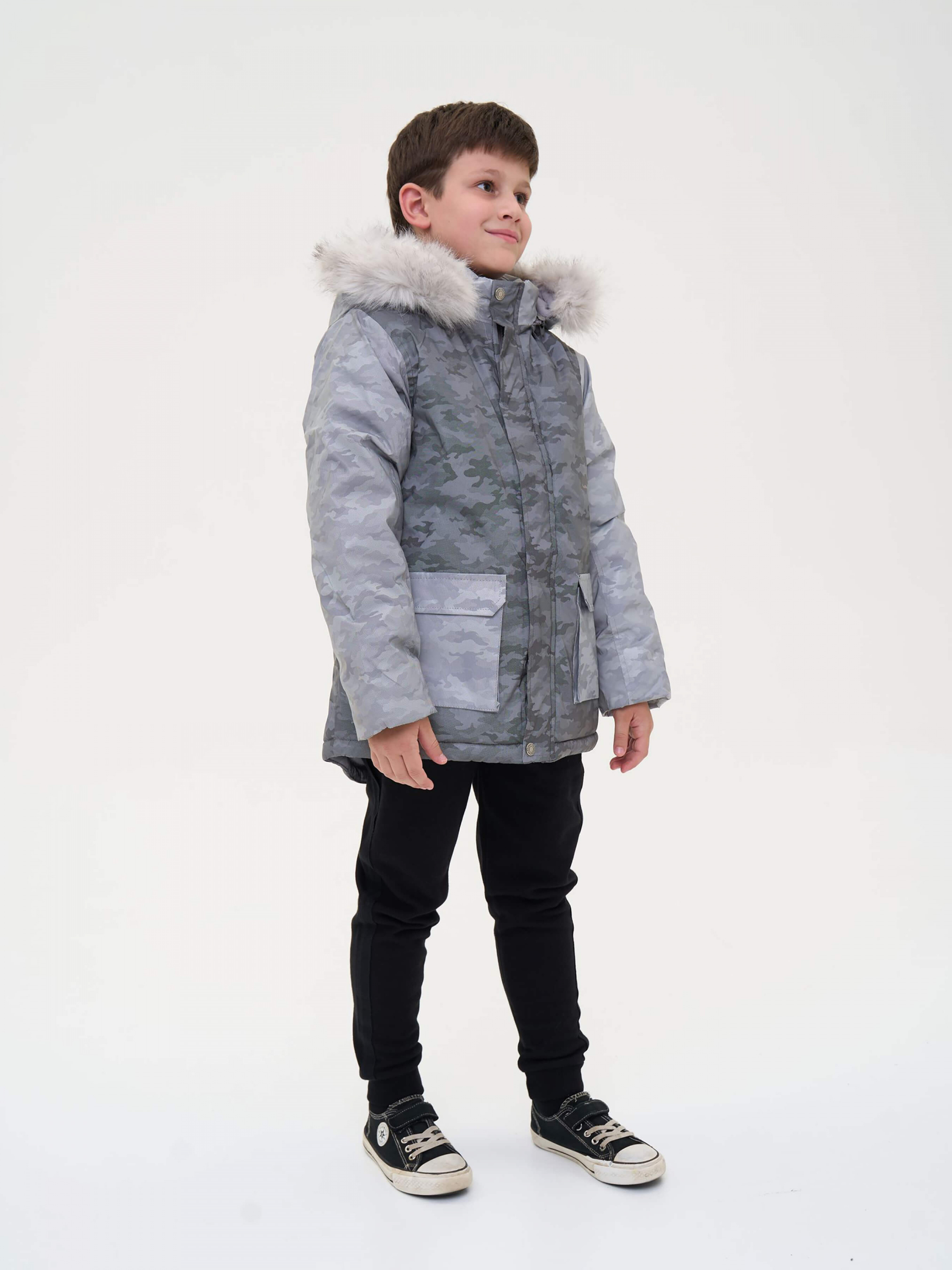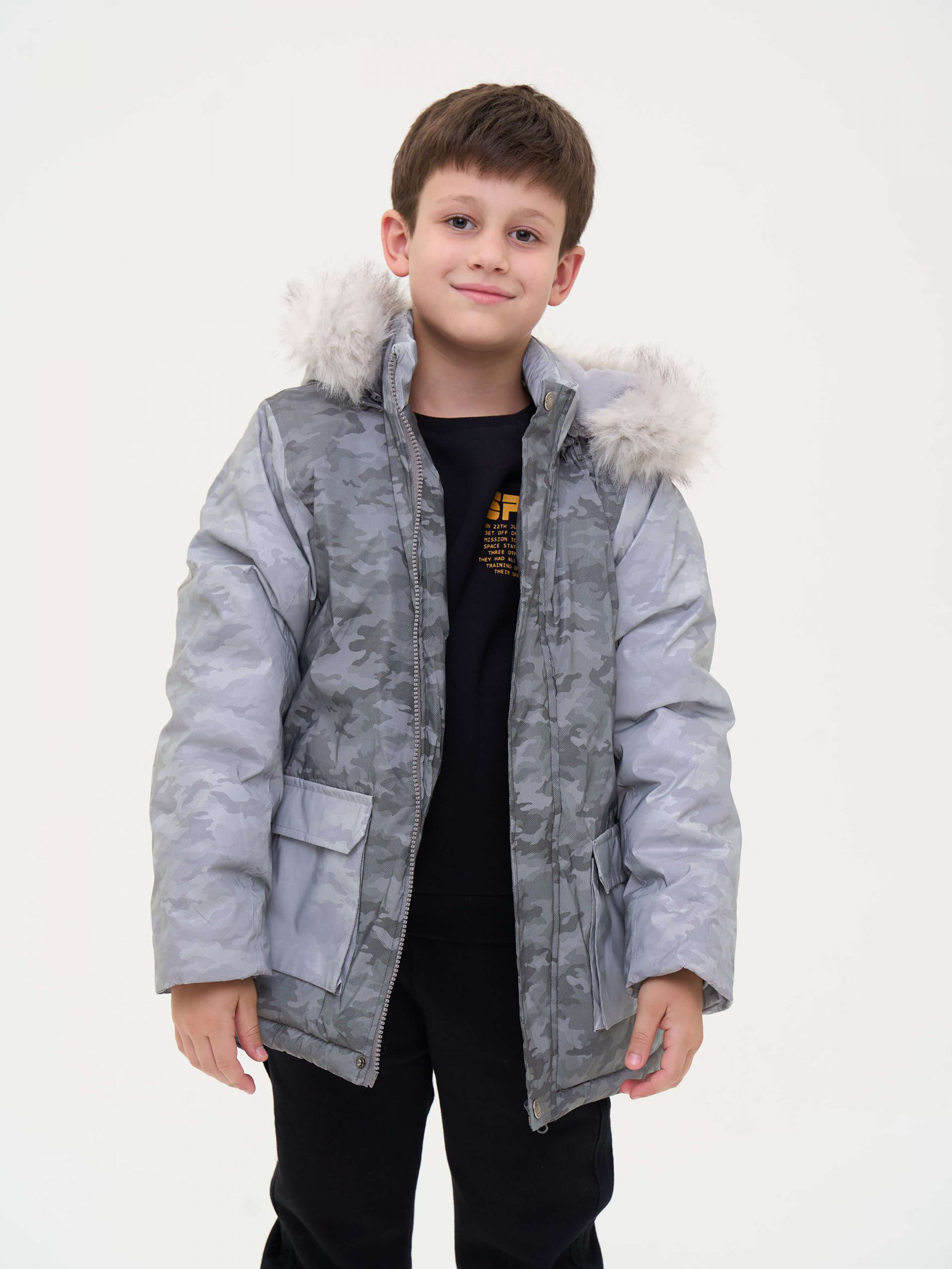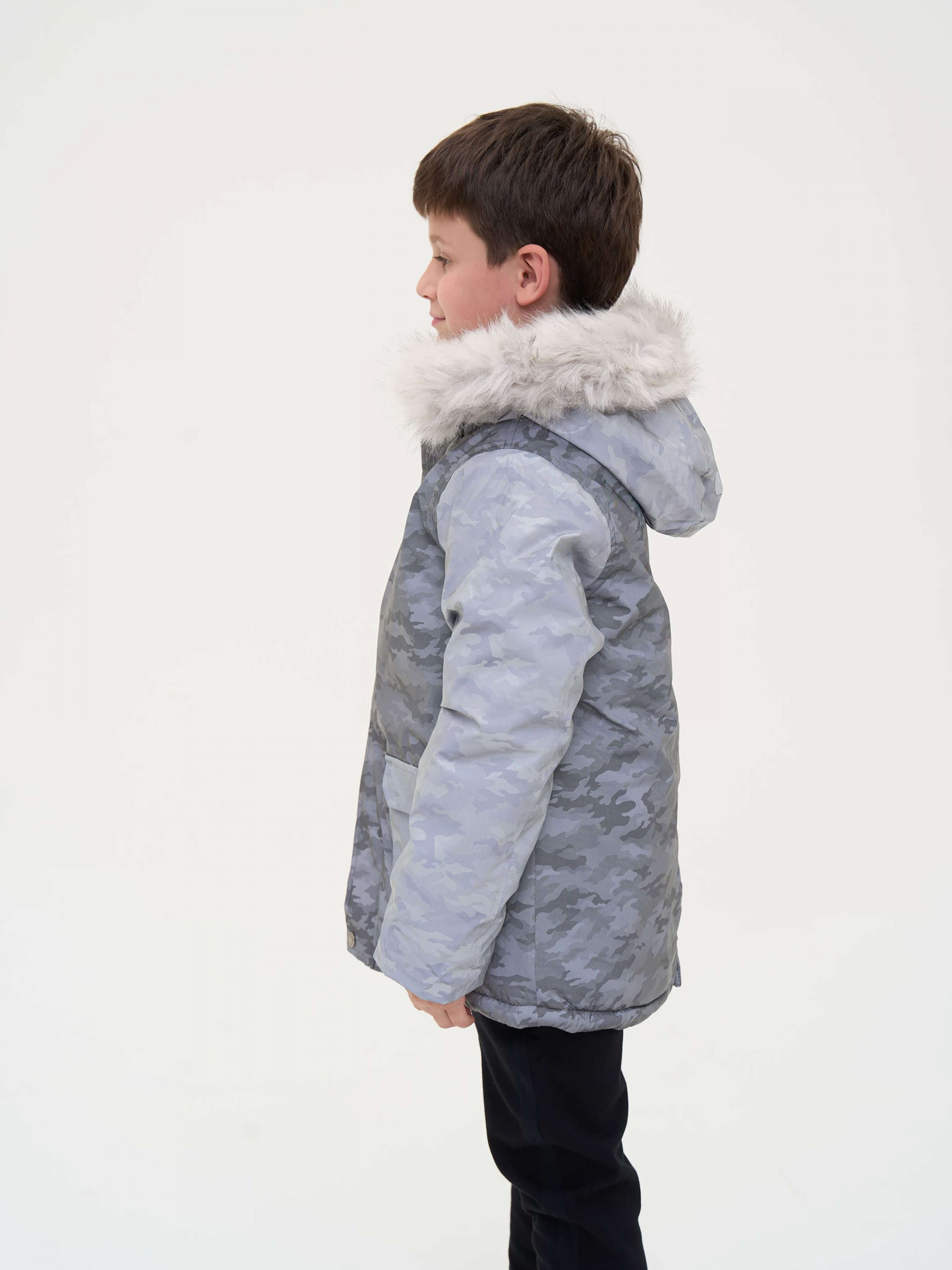 Зустрічайте нову колекцію - колаборація брендів YUMSTER і NEWNESS! Куртка дитяча, тепла з хутряним капюшоном. Стильний дизайн надає образу яскравості. Ідеальний вибір для активних та веселих зимових пригод. Деталі моделі: водонепроникна куртка сірого кольору. Глибокий капюшон із хутром. Капюшон відстібний, на блискавці. Комірець стійка. Застібка на блискавці та кнопки. Накладні кишені. Довжина куртки - нижче за пояс. Прямий крій. Камуфляжний принт. Матеріал верху – мікрофібра. Розмірний ряд: на зріст від 128 см до 164 см Склад: 100% поліестер Рекомендації щодо догляду: машинне прання при температурі 30 градусів. *Увага! Відтінок кольору на фото може трохи відрізнятися від реального