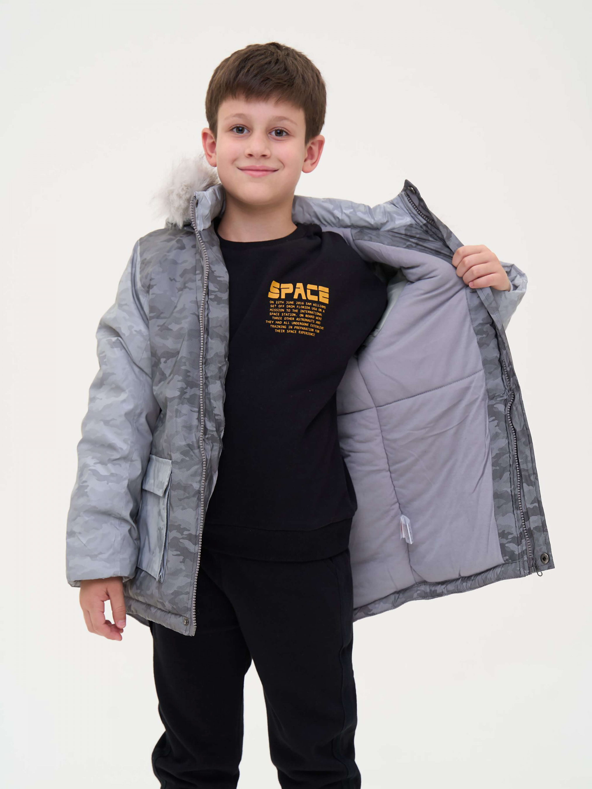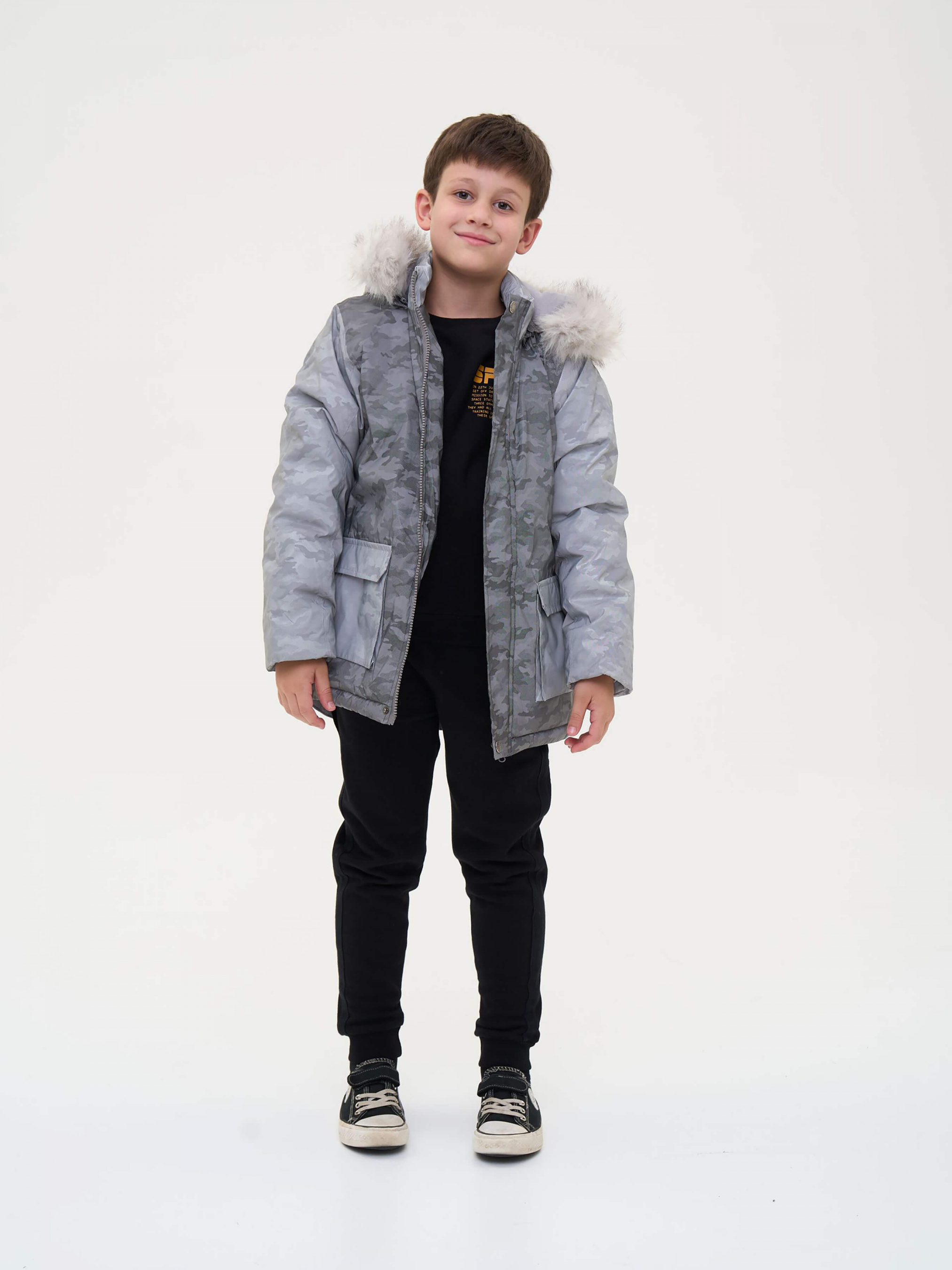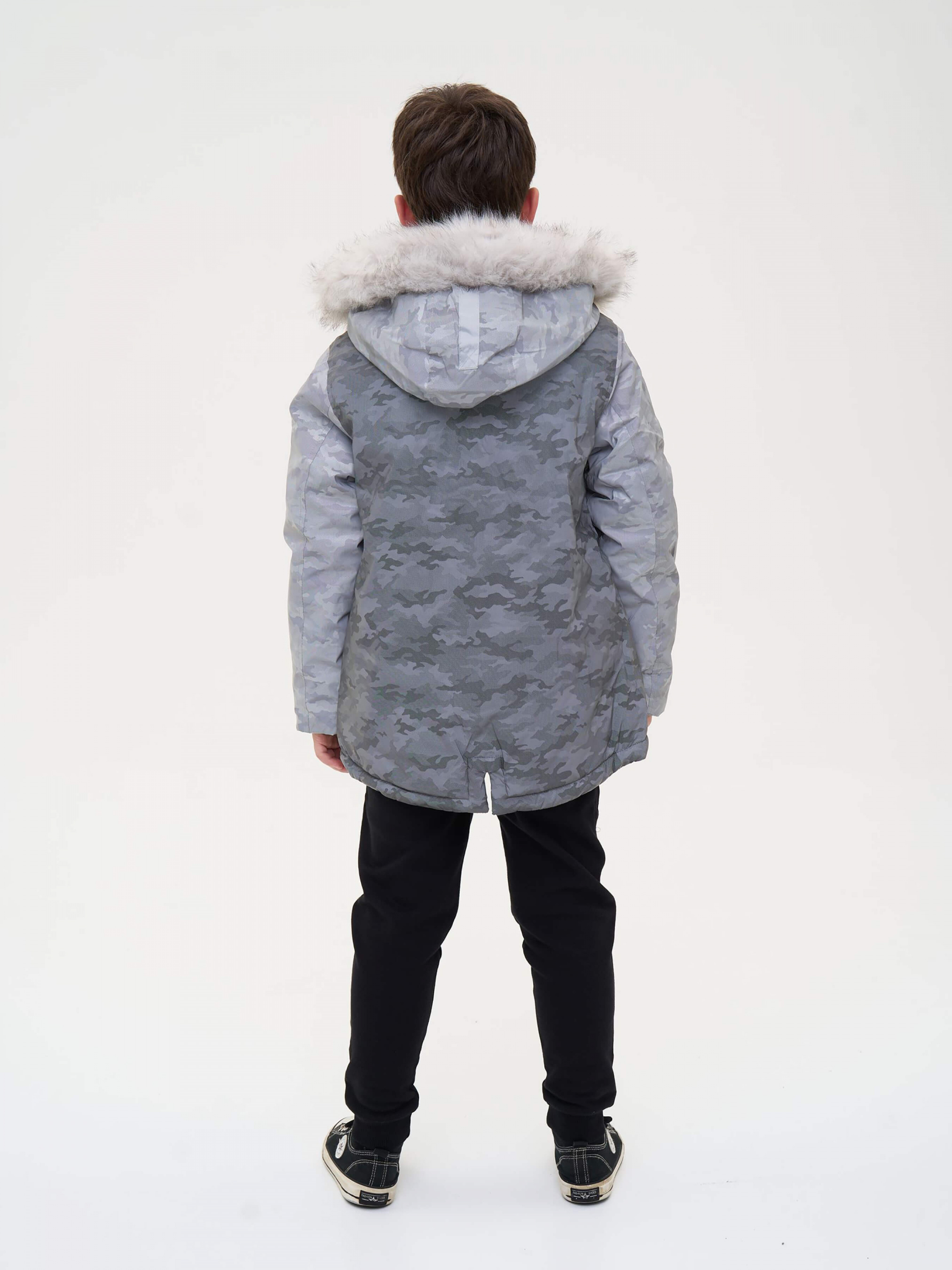 Зустрічайте нову колекцію - колаборація брендів YUMSTER і NEWNESS! Куртка дитяча, тепла з хутряним капюшоном. Стильний дизайн надає образу яскравості. Ідеальний вибір для активних та веселих зимових пригод. Деталі моделі: водонепроникна куртка сірого кольору. Глибокий капюшон із хутром. Капюшон відстібний, на блискавці. Комірець стійка. Застібка на блискавці та кнопки. Накладні кишені. Довжина куртки - нижче за пояс. Прямий крій. Камуфляжний принт. Матеріал верху – мікрофібра. Розмірний ряд: на зріст від 128 см до 164 см Склад: 100% поліестер Рекомендації щодо догляду: машинне прання при температурі 30 градусів. *Увага! Відтінок кольору на фото може трохи відрізнятися від реального