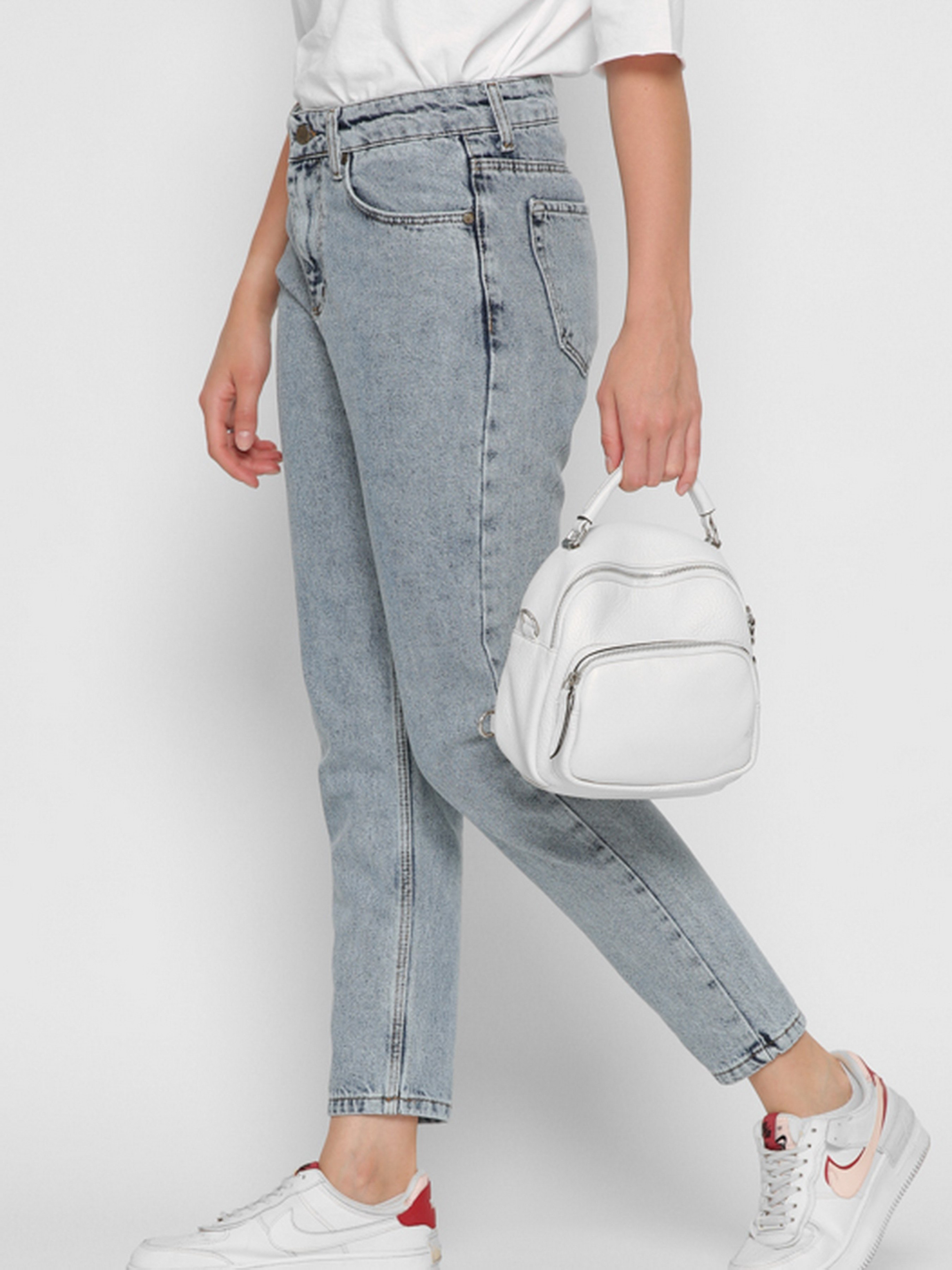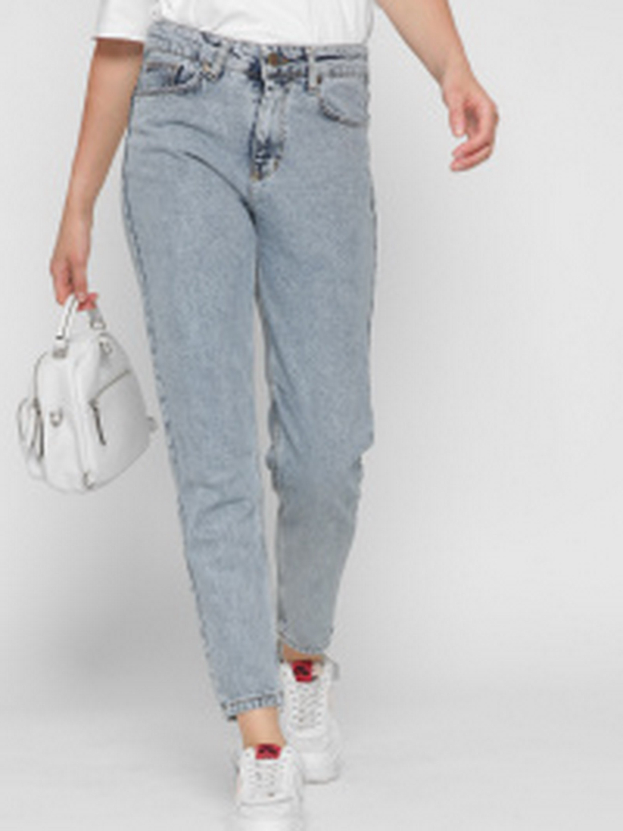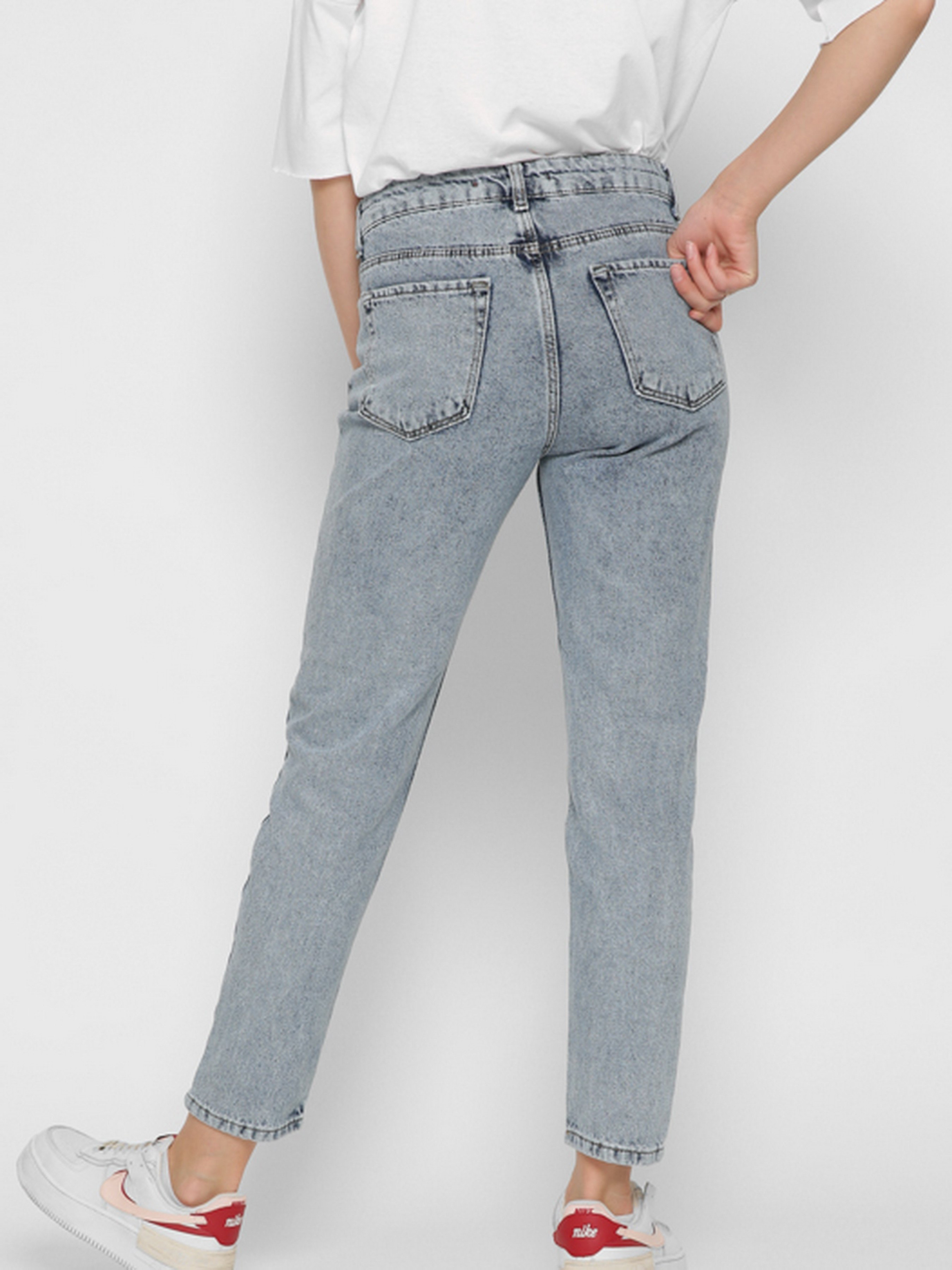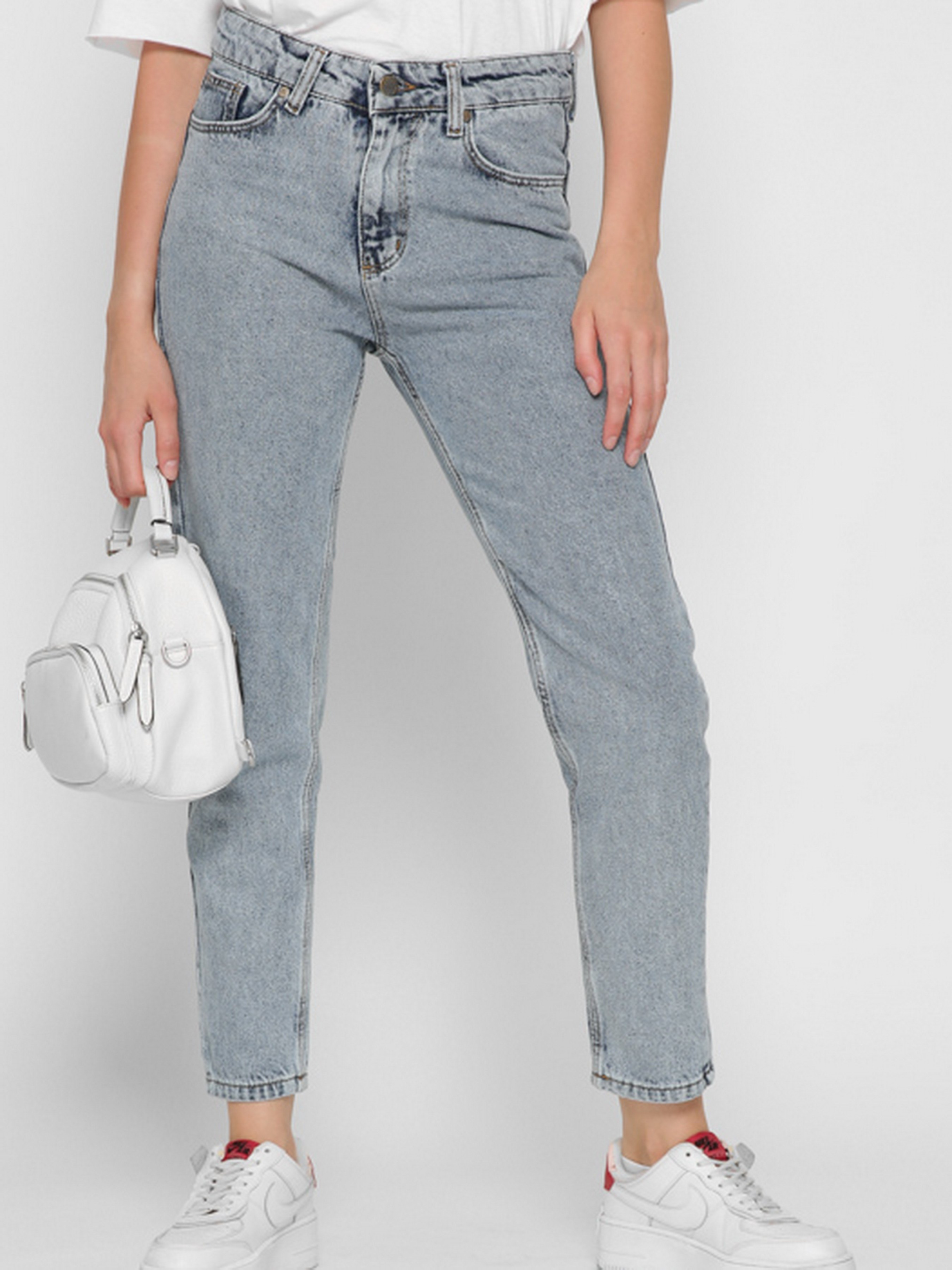 Стильні mom джинси. Модель заужена до низу. Має високу посадку. П'ять кишень: два накладних ззаду, два прорізних спереду, один невеликий watch pocket. На талії спеціальні петлі шлевки для пояса. Застібка на блискавку і металеву гудзик.