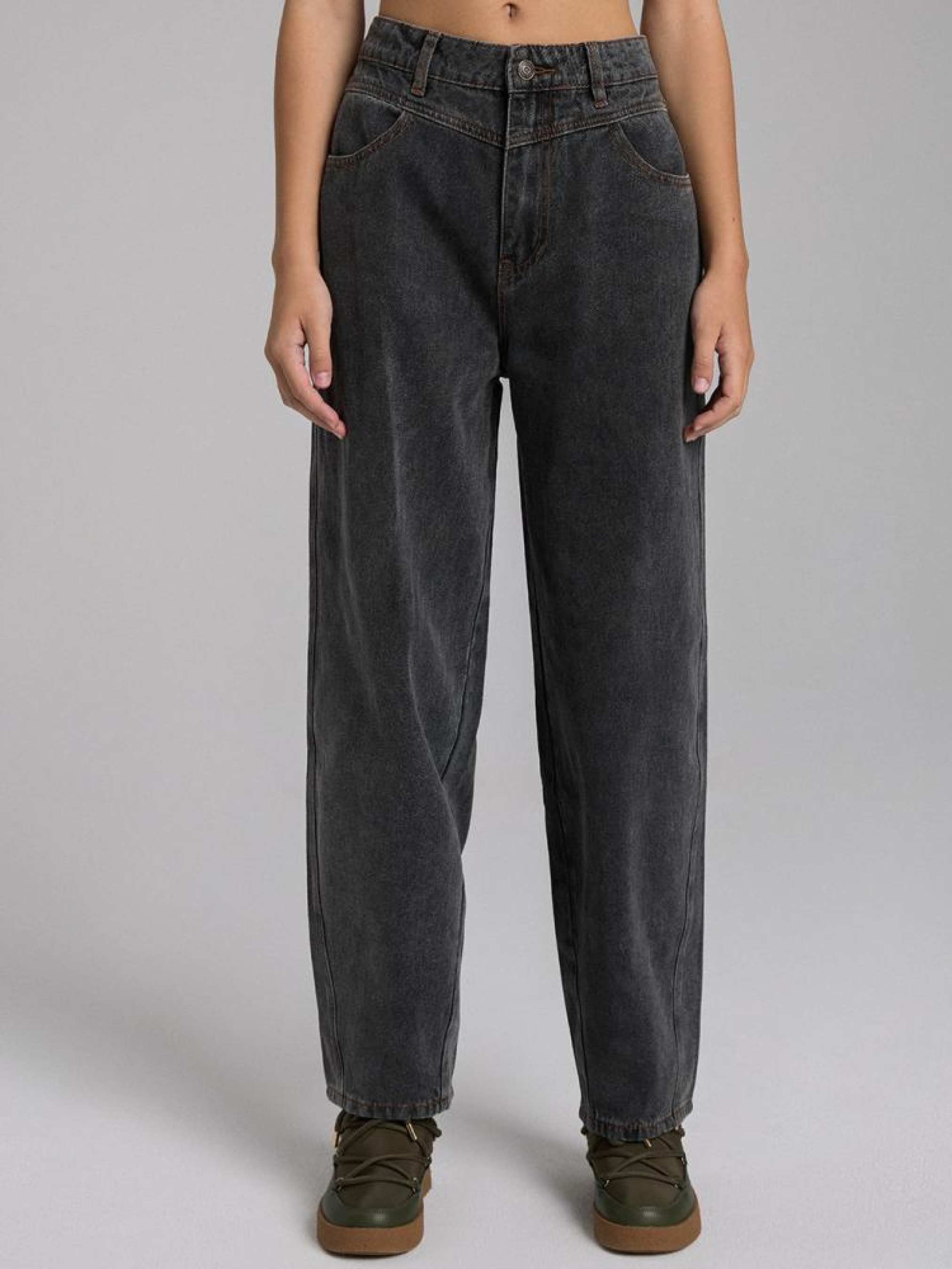 Штани CLTN FITI 10045835 Витерті штани з деніму на кокетці: - висока талія з декоративною кокеткою, - широкі штанини, що звужуються до щиколотки, - вишитий ярлик - аксесуари мідного кольору, - доступні в сірому графіті. Сезон: осінь/зима 2024 Склад: 92% бавовна 8% віскоза Догляд: - прання при максимум 40 °С - не відбілювати - сушіть за низької температури - прасувати максимум при темп. 150°С - не хімчистка Розмір на моделі - 36 Зріст моделі - 175 см РОЗМІР: 34, 36, 38, 40, 42, Довжина по спинці до талії: 33,00 см, 35,00 см, 0,00 см, 39,00 см, 41,00 см, Ширина в проймі: 32,00 см, 33,00 см, 0,00 см, 35,00 см, 36,00 см, Ширина талії: 30,50 см, 31,50 см, 0,10 см, 33,50 см, 34,50 см, Ширина пояса: 35,00 см, 37,00 см, 39,00 см, 41,00 см, 43,00 см, Ширина стегна: 33,00 см, 34,00 см, 35,00 см, 36,00 см, 37,00 см, Ширина ніжки внизу: 19,50 см, 20,50 см, 21,50 см, 22,50 см, 23,50 см,