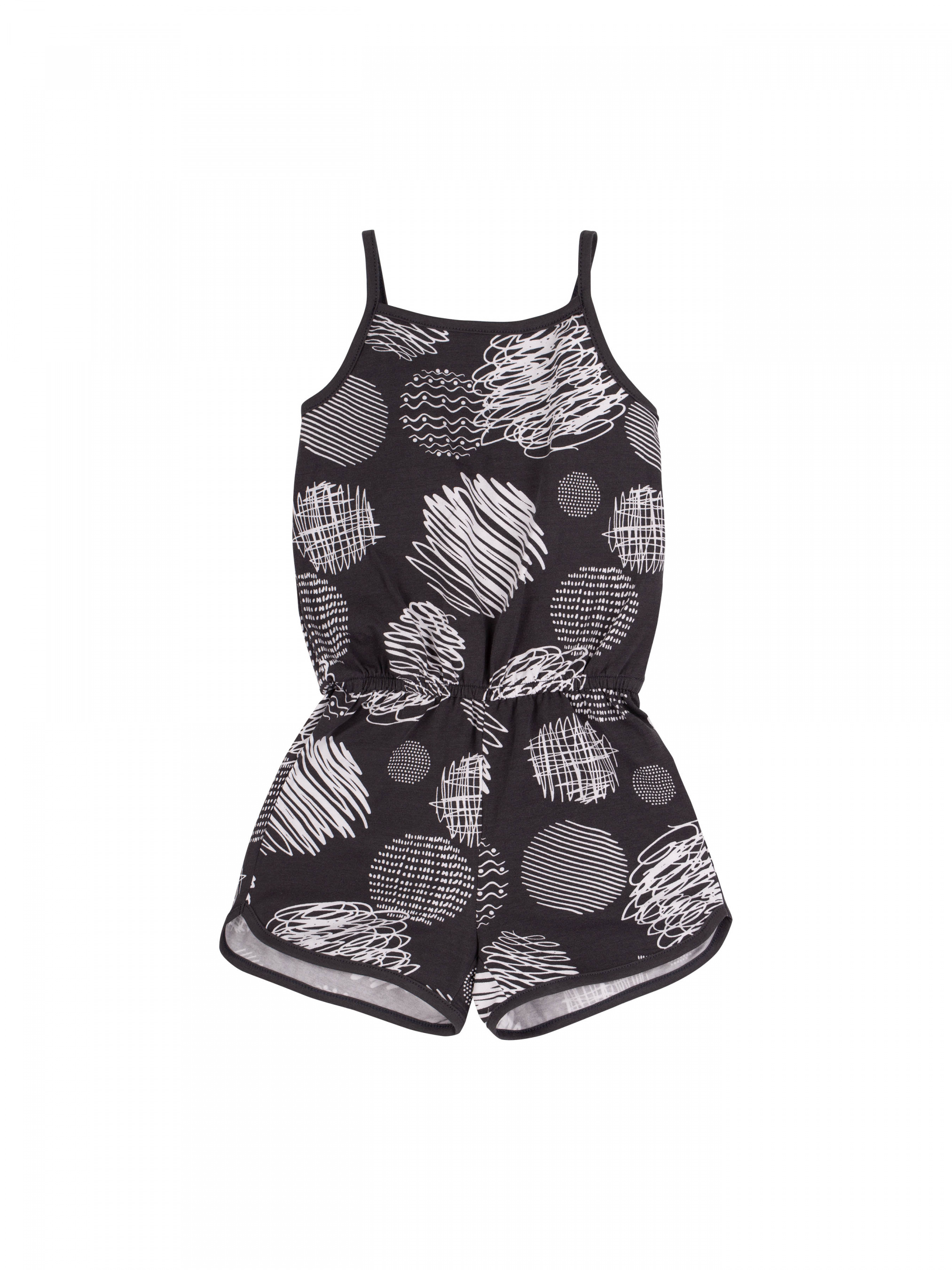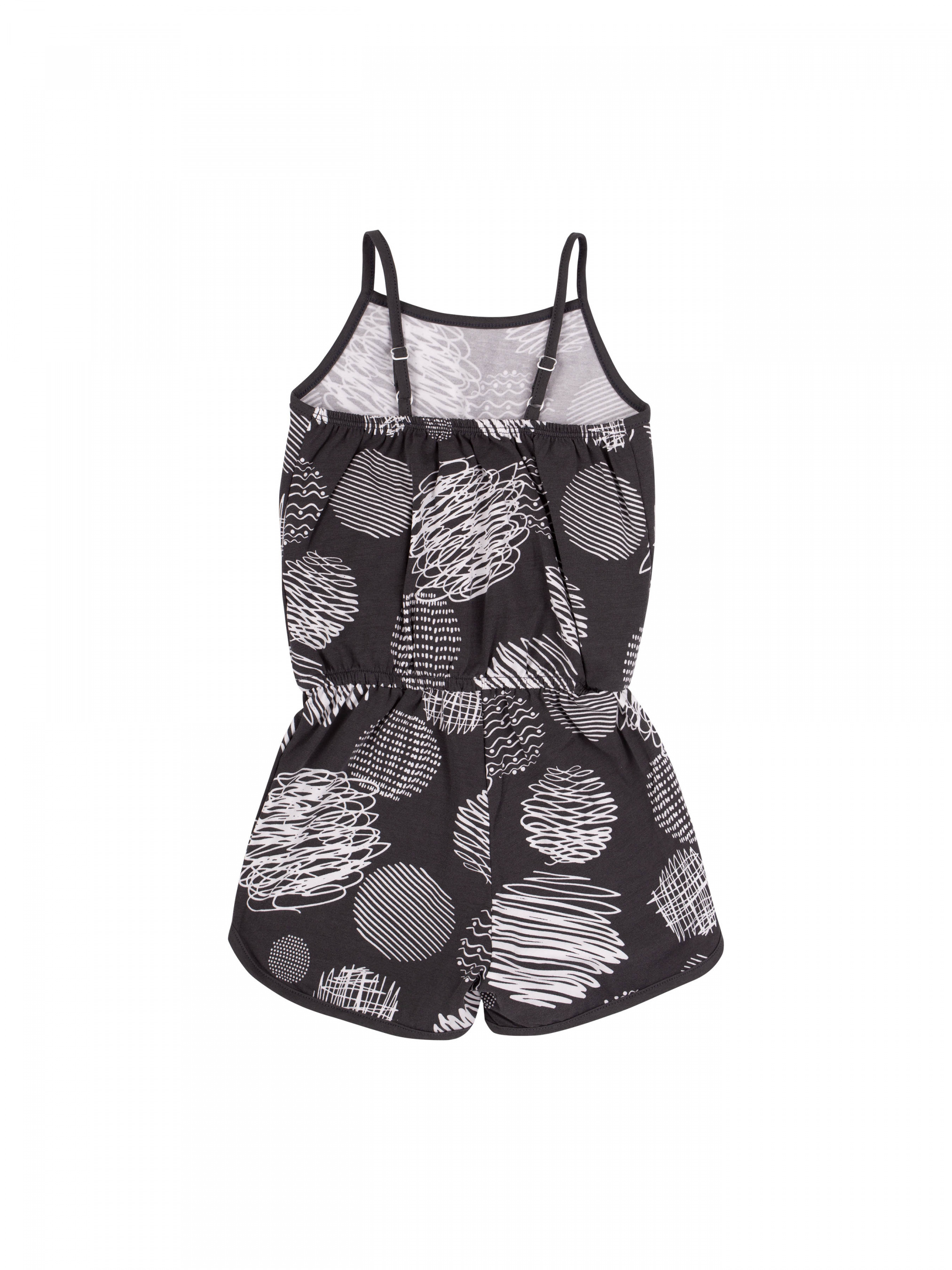 Напівкомбінезон для дівчинки. Модель середньої довжини, на тонких бретелях, по талії резинка. Тканина еластична, в малюнок.
