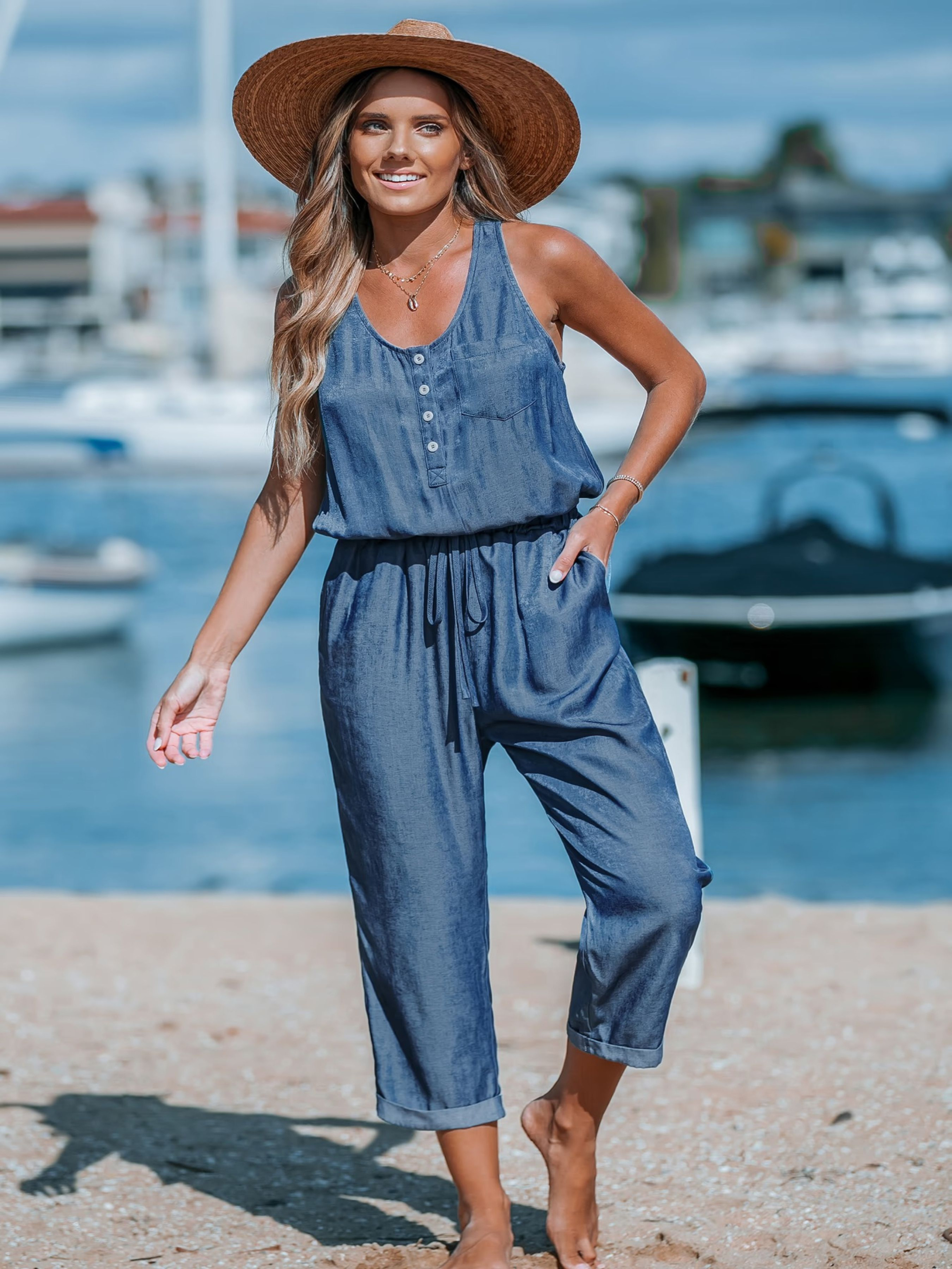 Потрібне універсальне вбрання для вашого щільного графіка? Наш синій комбінезон без рукавів з круглим вирізом та кишенями вам підійде! Від бігу у справах до філіжанки кави з друзями, його зручний стиль і функціональні кишені роблять його обов'язковим. Тканина Круглий виріз Без рукавів Часткові передні гудзики Накладна кишеня Зав'язка на талії Бічні косі кишені Звужені штанини ***Розмір - S Напівобхват пояса - 32,00 см Довжина виробу - 130,00 см Об'єм грудей - 86,00 см Напівобхват стегон - 48,00 см Довжина крокового шву - 52,00 см ***Розмір - M Напівобхват пояса - 34,00 см Довжина виробу - 130,00 см Об'єм грудей - 80,00 см Напівобхват стегон - 51,00 см Довжина крокового шву - 53,00 см Склад: 50% віскоза, 50% поліестер