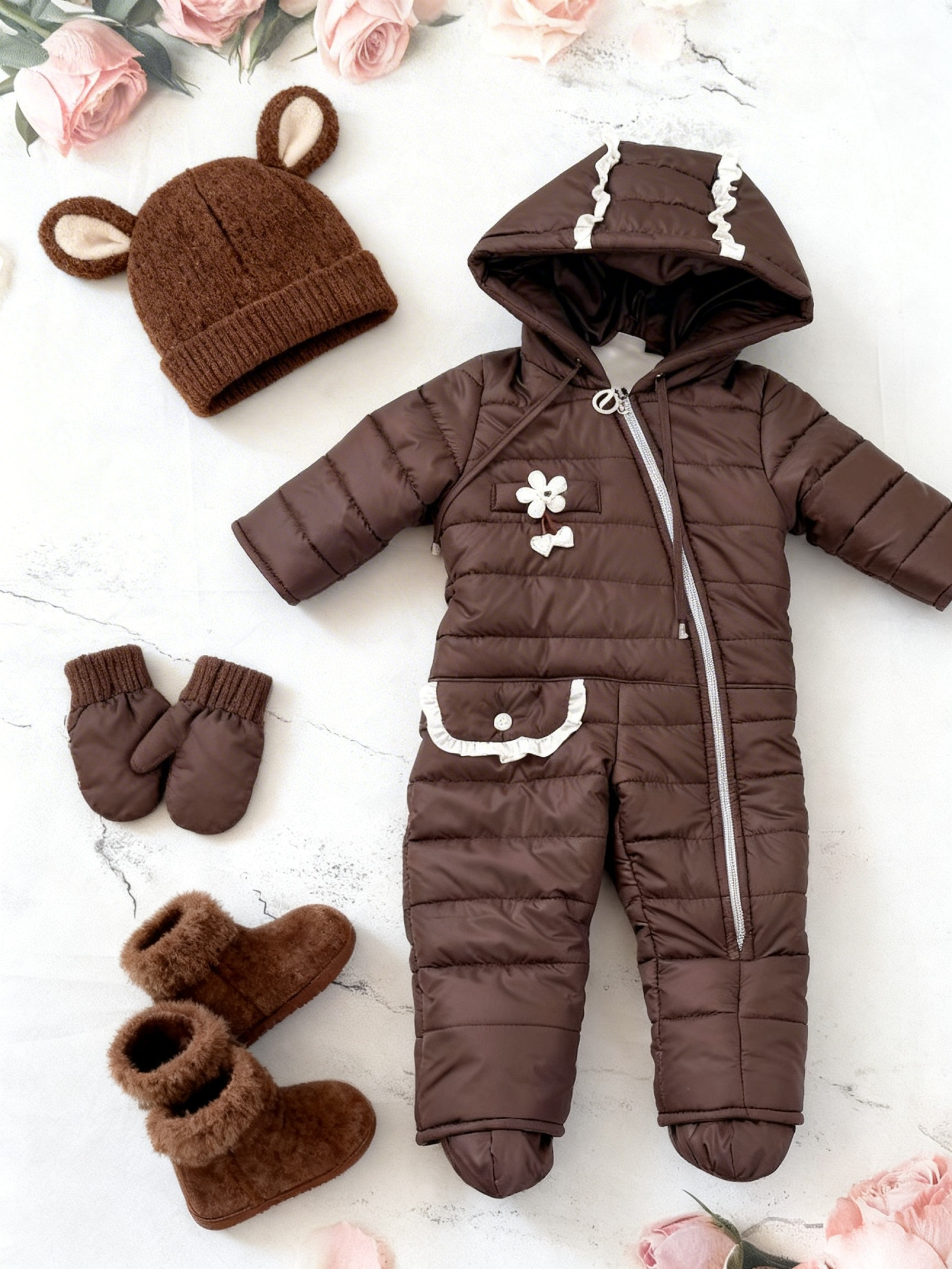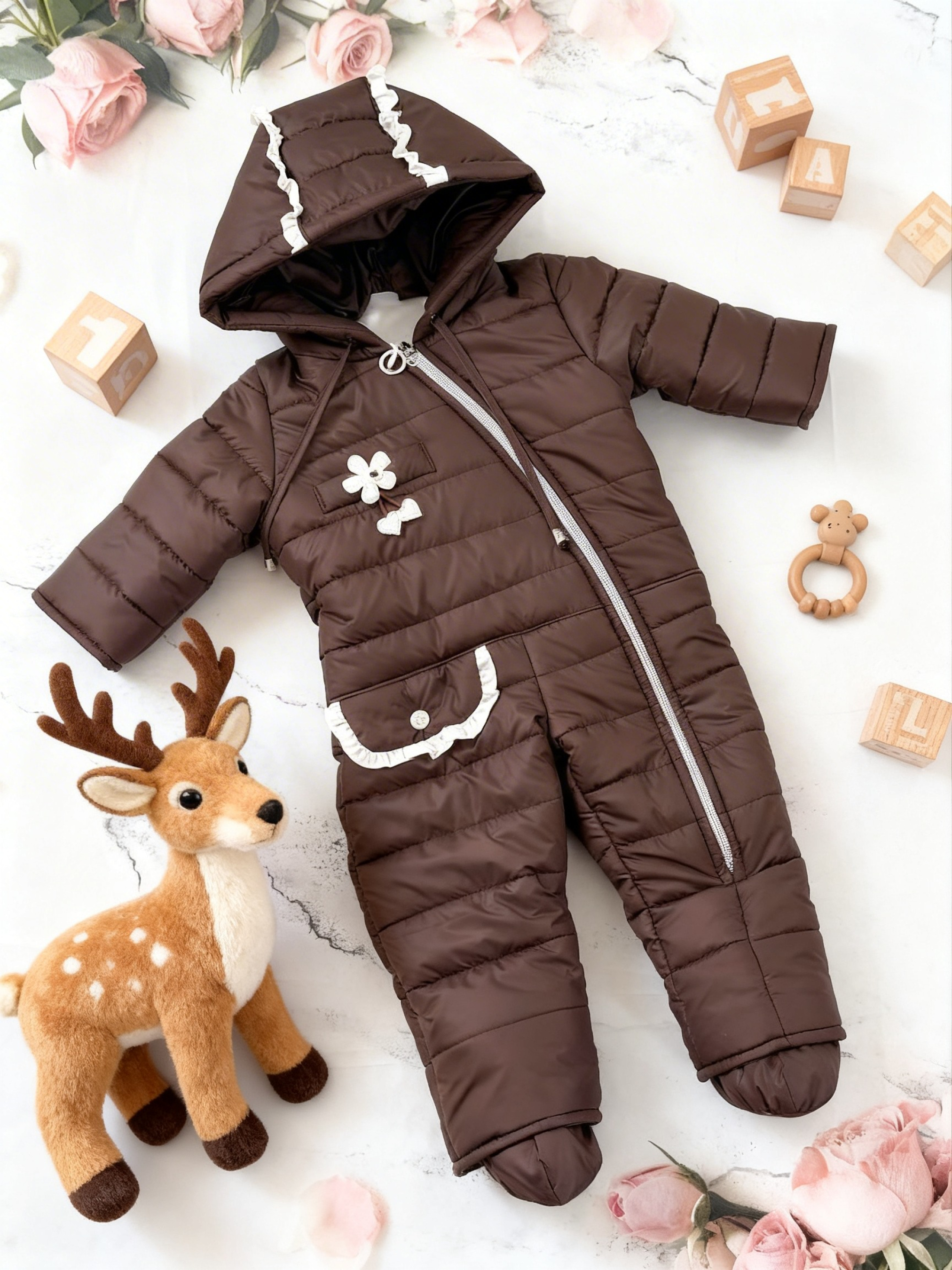 Дитячий демісезонний комбінезон «Анюта» створений для того, щоб перші прогулянки вашої маленької принцеси були сповнені тепла та комфорту. Ця модель поєднує в собі чарівний дизайн і високу функціональність, забезпечуючи надійний захист від мінливої весняної та осінньої погоди. Комбінезон легкий, як хмаринка, тому він не сковує рухів дитини, дозволяючи їй вільно пізнавати світ або спокійно відпочивати на свіжому повітрі. Характеристики Модель: «Анюта» (демісезонна) Утеплювач: Синтепон силіконізований 150 г/м² Підкладка: Фліс (основна частина), трикотаж (рукави) Стать: Для дівчаток Сезон: Весна / Осінь Особливості: Легкий, дихаючий, гіпоалергенний Країна виробник: Україна Матеріали та утеплення: Ніжність у кожній деталі Теплий наповнювач (Синтепон силіконізований 150 г/м²): Сучасний силіконізований синтепон забезпечує чудову теплоізоляцію при мінімальній вазі. Він гіпоалергенний, не вбирає сторонні запахи та швидко відновлює об’єм після прання. Комбінована система підкладки: Ніжний фліс (корпус та капюшон): Створює додатковий теплий шар, дуже приємний на дотик і здатний утримувати тепло тіла малюка. М’який трикотаж (у рукавах): Натуральна підкладка в рукавах дозволяє легко вдягати комбінезон, не подразнюючи ручки дитини, та забезпечує чудову повітропроникність. Захист від вітру: Зовнішній шар надійно захищає від продування, зберігаючи всередині ідеальний мікроклімат. Зручність для батьків: Продумана конструкція застібки дозволяє максимально швидко переодягнути малечу, що особливо важливо під час прогулянок. Рекомендації з догляду Прання: Рекомендовано делікатне машинне прання при температурі не вище 30-40°C. Засоби: Використовуйте лише рідкі гелі для дитячих речей. Уникайте агресивних засобів та відбілювачів. Віджим: На низьких обертах (до 600), щоб не пошкодити структуру утеплювача. Сушіння: Сушити у розправленому вигляді на вішалці або горизонтальній поверхні. Не сушіть безпосередньо на гарячих джерелах тепла (батареях).