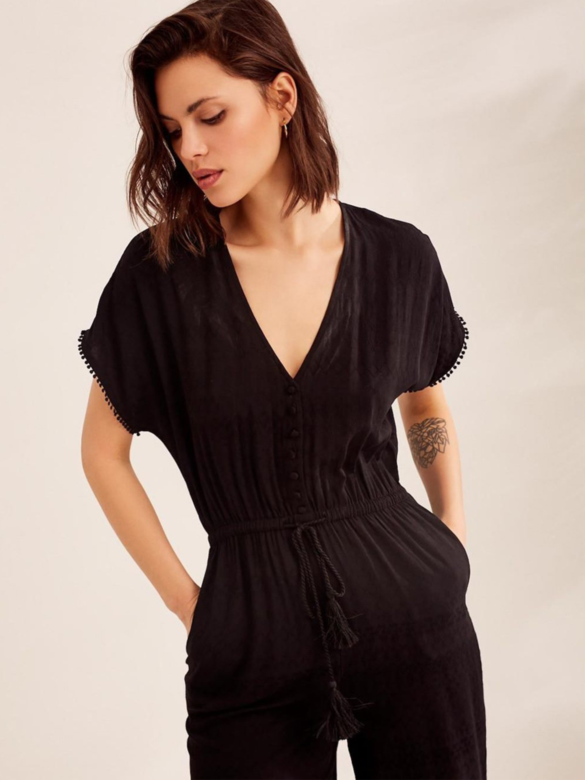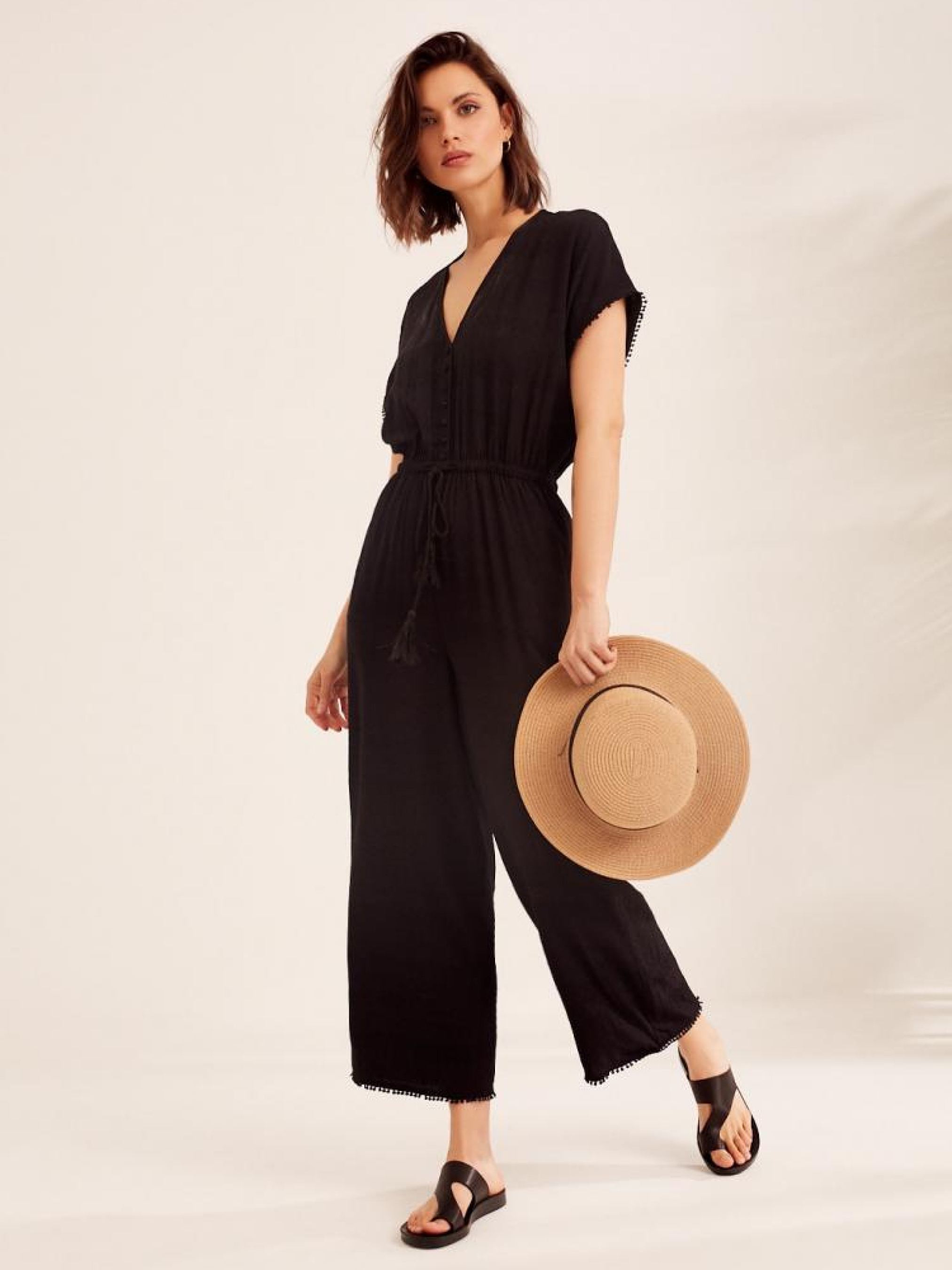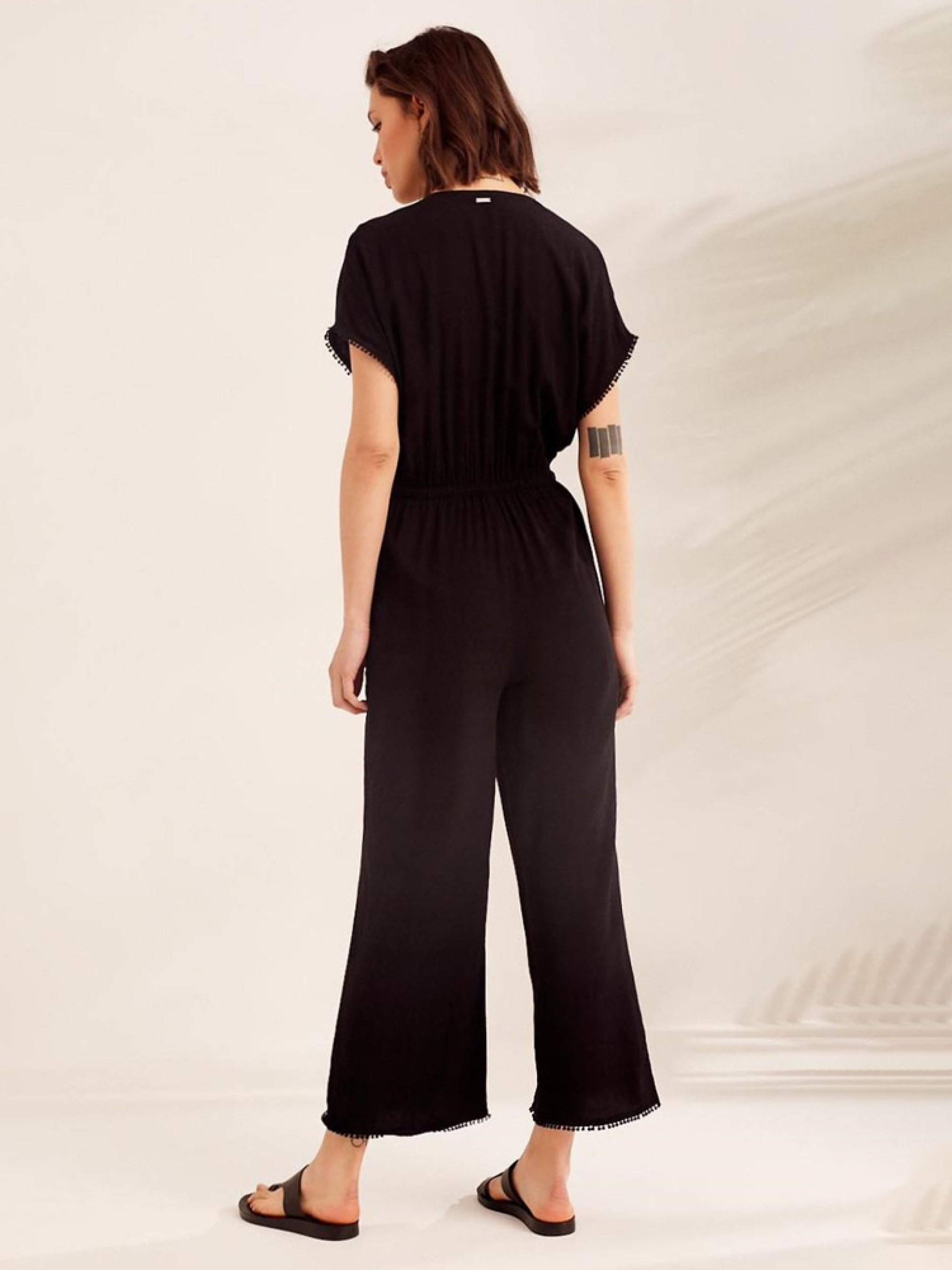 Літній жіночий комбінезон DANIELA вільного крою з куліскою на талії. Основні характеристики: - чорний колір, - віскозно-жакардова тканина з мерехтливим малюнком, - вільний крій з широкою штаниною, - регульована кулиска на талії, - довжина штанини до щиколотки. Сезон: Весна / Літо. Склад: 100% віскоза Розмір на моделі - S Зріст моделі - 177 см РОЗМІР: XS, S, М, L, XL, ДОВЖИНА СПИНИ ДО ПОЯСА, 42 см, 44 см, 46 см, 48 см, 50 см, ДОВЖИНА ВНУТРІШНЬОЇ НОГИ, 65 см, 65 см, 66 см, 67 см, 69 см, ШИРИНА ГРУДЕЙ:60 см, 62 см, 64 см, 66 см, 68 см, ШИРИНА ТАЛІЇ, 52 см, 54 см, 56 см, 58 см, 60 см, ДОВЖИНА РУКАВА, 38 см, 39 см, 40 см, 41 см, 42 см, ШИРИНА СТЕГНА, 32 см, 33 см, 34 см, 35 см, 36 см, ШИРИНА НИЗУ ШТАНИНИ, 29 см, 30 см, 31 см, 32 см, 33 см