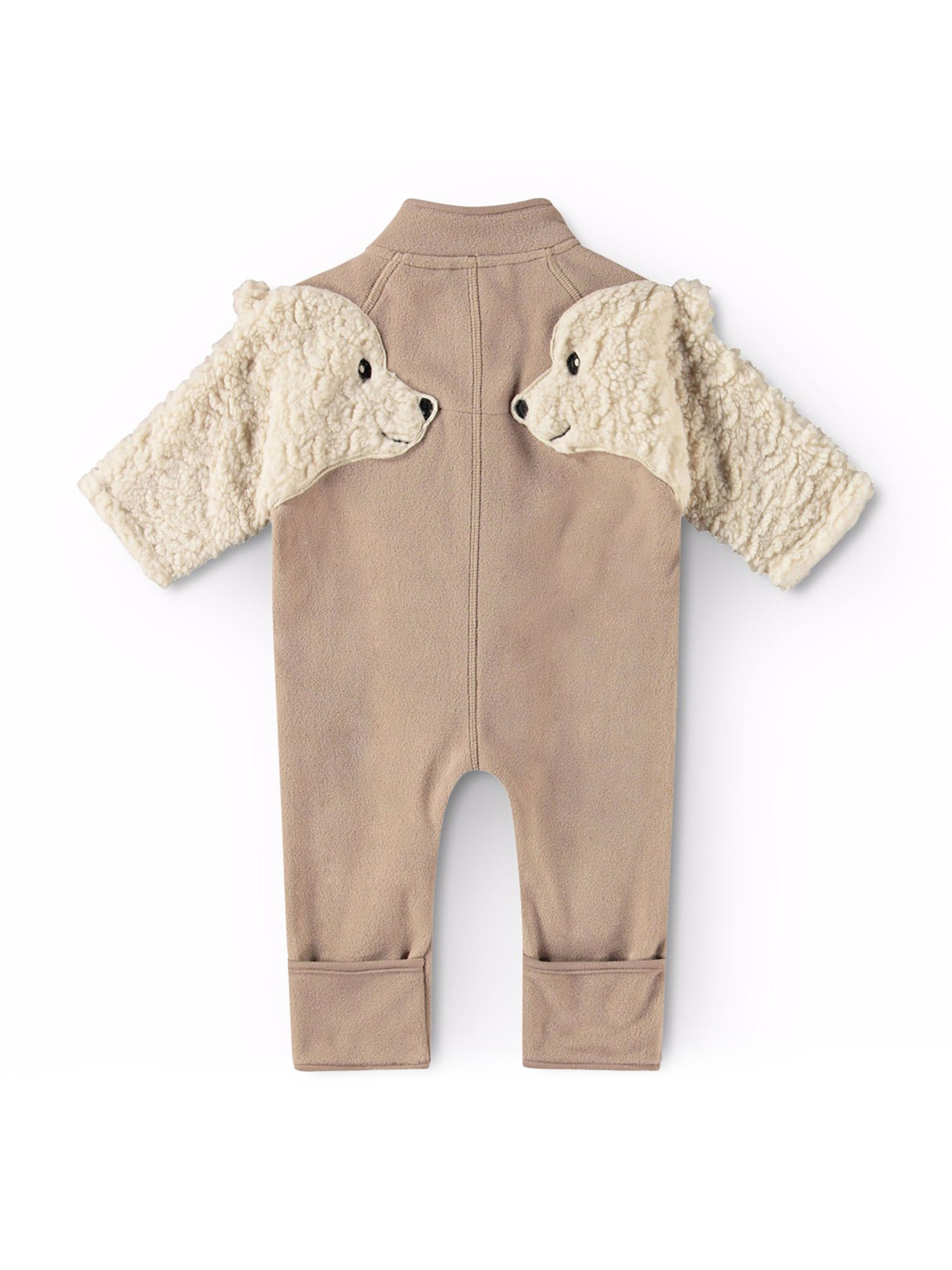 Флісовий комбінезон з відкритими ніжками Molo "Udo Mocha". Особливості: містить не менше 50% поліестеру з перероблених матеріалів, сертифікованого GRS (Global Recycled Standard)*; спереду застібається на гудзики; високий комір; рукави декоровано 3D деталями з Teddy флісу у вигляді білого ведмедя; у розмірі 68-74 закриті ніжки, у розмірі 80 відкриті ніжки; окантовка на комірі, спереду та на ніжках з ребристої тканини.