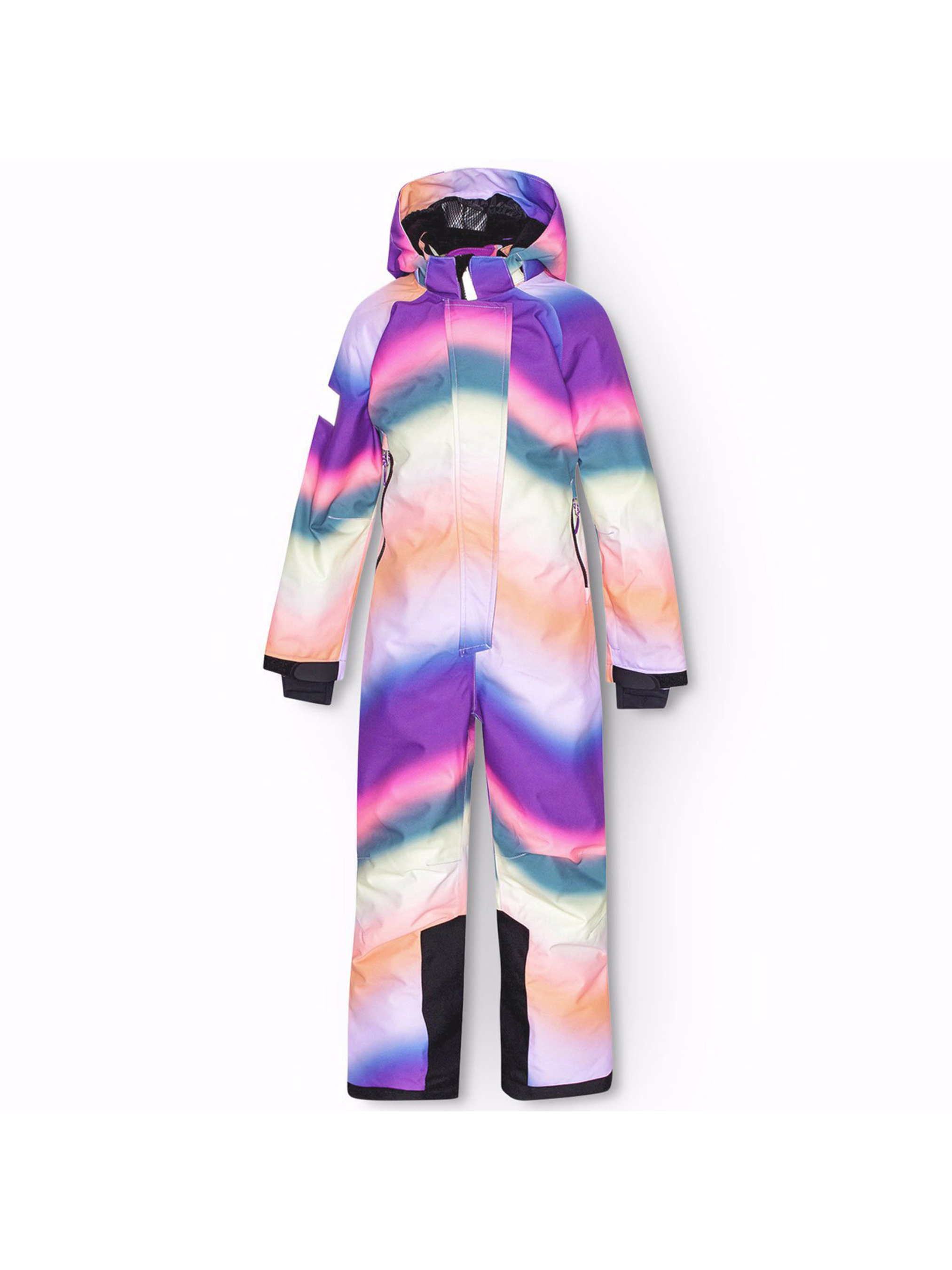 Зимовий гірськолижний термокомбінезон Molo "Hux Wavy Rainbow" з різнобарвним принтом графіті. Особливості: водонепроникність – 20 000 мм; паропроникність – 20 000 г/м²/24 год; утеплювач – 3M™ Thinsulate™ Type EP (Elite) зберігає тепло у зимову погоду до -25°C; основні шви додатково проклеєні; HEIQ eco dry – швейцарське високотехнологічне водостійке просочення (PFC-free); зовнішня тканина, утеплювач та підкладка виготовлені з частково переробленого поліестеру*; підкладка з високоякісного м'якого флісу в області шиї, капюшоні і на спинці; спеціальні клапани, що захищають від попадання снігу в штанини і рукава; спереду застібка "блискавка" з асиметричною вітрозахисною планкою; знімний капюшон на липучці; передні кишені на застібці "блискавка" і кишеня для ski-pass на одному рукаві. Усі застібки водонепроникні; світловідбивачі на рукаві і штанині; внутрішня кишеня для телефону; знімні силіконові петлі-штрипки для черевиків; рекомендований сезон – зима.