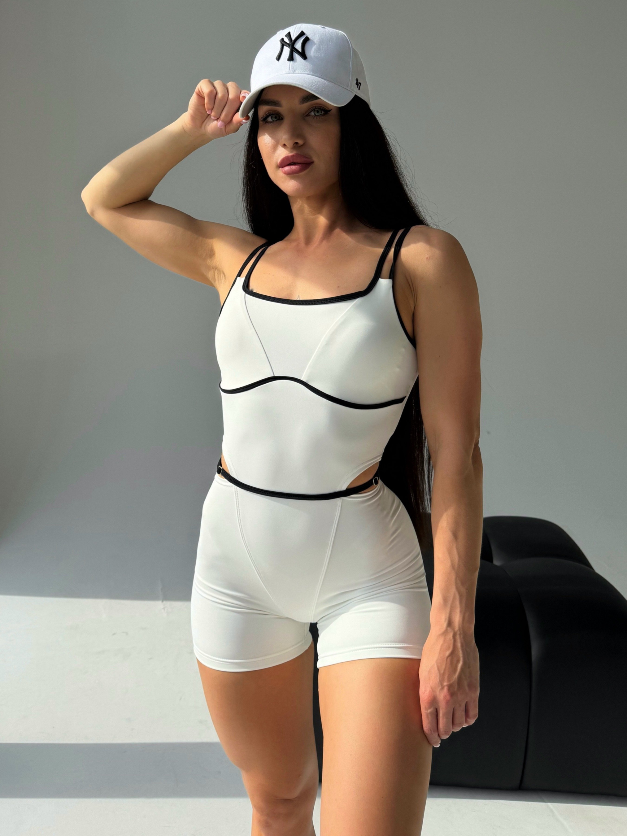Жіночий комбінезон Nova Vega. Модель з вирізами на талії та тонким поясом ненав'язливо підкреслить вашу фігуру. Пояс оформлений у вигляді бретелі, що дозволяє легко регулювати охоплення талії. Виріб пошитий з біфлексу, якісного та еластичного матеріалу. Біфлекс не линяє, стійкий до численних прань, приємний до тіла і не просвічується під час присідань. Комбінезон має кишені для чашок вкладишів. Самі чашки у комплекті не йдуть.