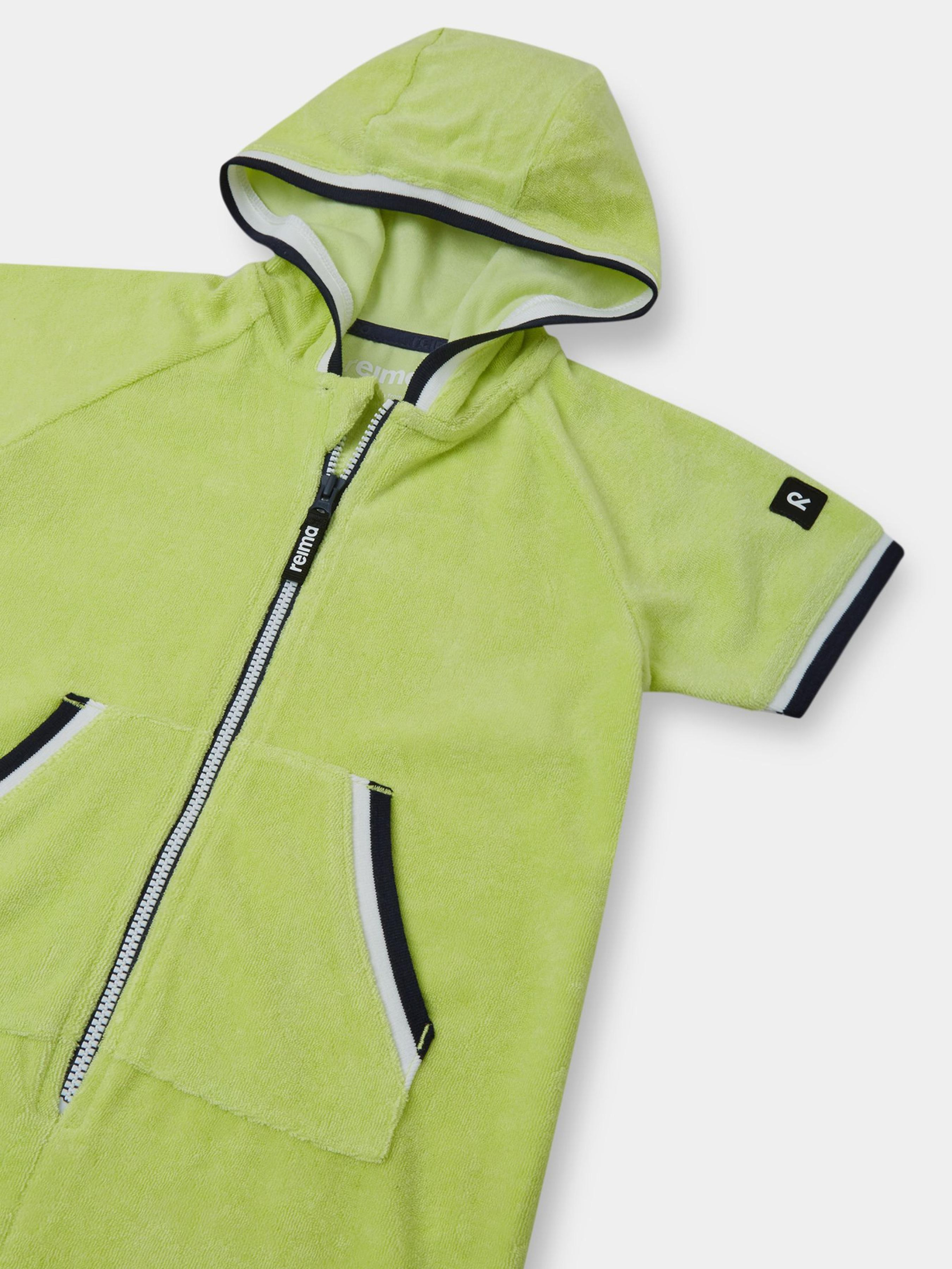 Склад: SunProof organic terry: 56% віскоза, 24% бавовна, 20% поліестер Повітрепровідність основного матеріалу: >7000 Матеріал: Light Tencel® terry УФ захист 50+ Еластичний матеріал Органічна бавовна М'який, еластичний махровий матеріал|Бавовна в цьому продукті сертифікована як органічна|Фактор захисту від ультрафіолету 50+|Модель довжиною до коліна з великими кишенями|Резинка на капюшоні й рукавах|Довга блискавка для легкого одягання|Резинка на отворі кишень Догляд: Прати та прасувати, вивернувши навиворіт. Прати з білизною однакового кольору. Застебнути блискавки. Прати миючим засобом, що не містить відбілюючих речовин. Надати початкову форму у вологому вигляді. М'яка, повітряна махра – чудовий матеріал влітку, який зігріє та подарує затишок після купання. З високим фактором захисту від ультрафіолету.