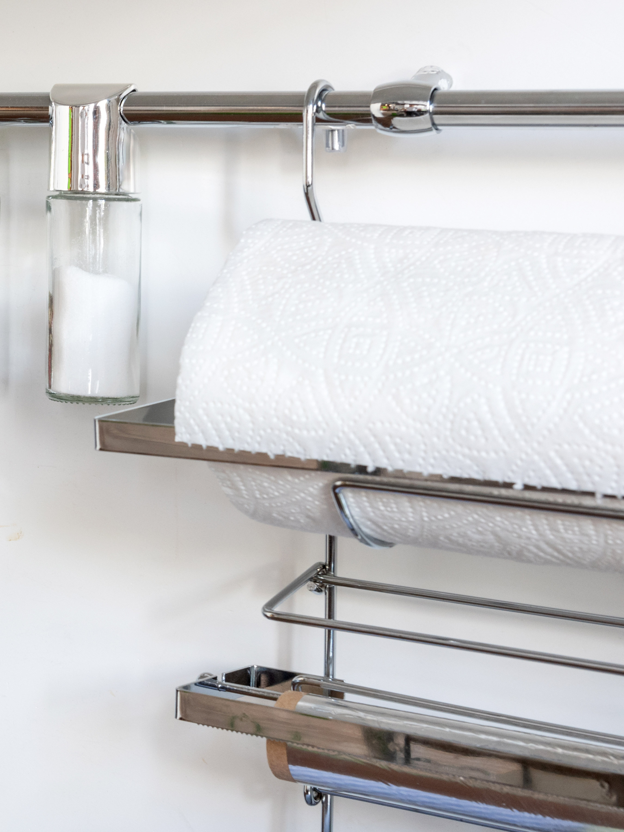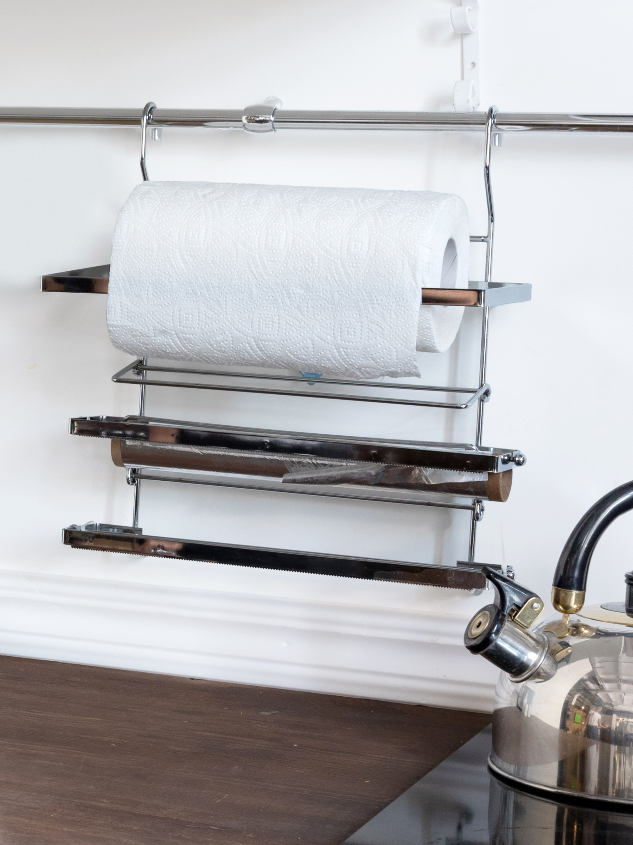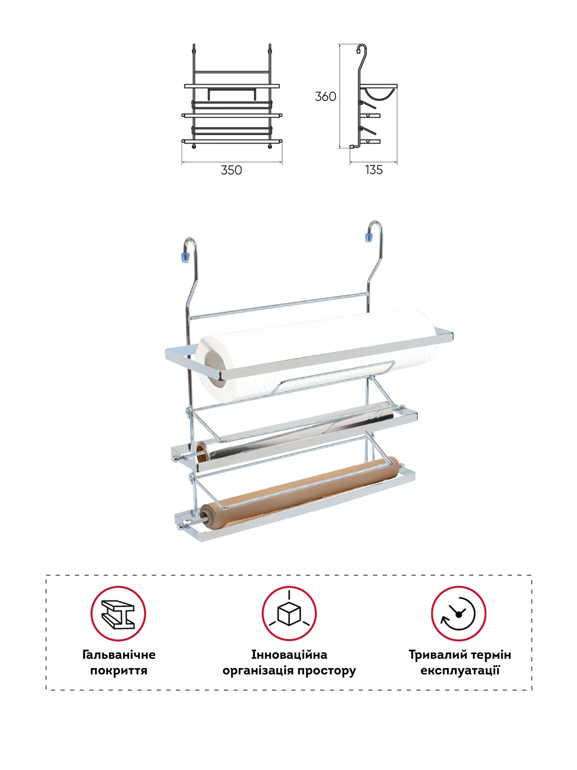 Металевий тримач для паперових рушників, фольги і плівки Lemax відрізняється чудовою якістю і сучасним оригінальним дизайном.Тримач виготовлений з високоякісного металу і прекрасно поєднує в собі високу міцність, надійність і стильний зовнішній вигляд. Підходить для всіх видів рулонних паперових рушників, фольги і харчової плівки.Варто відзначити, що за допомогою тримача для харчової плівки, фольги і паперових рушників можна звільнити простір на стільниці, підвісивши його на рейлінг.Простий і надійний тримач для фольги, плівки та паперових рушників MX-428 буде гармонійним доповненням до будь-якого інтер'єру, а кухонне приладдя буде завжди поруч і в акуратному вигляді, що додасть кухні привабливого зовнішнього вигляду. Якщо ви хочете купити тримач для фольги, харчової плівки і паперових рушників - обирайте ТМ Lemax. У нас в наявності широкий асортимент аксесуарів для кухні, універсальний дизайн яких гармонійно поєднується з більшістю дизайнерських рішень.