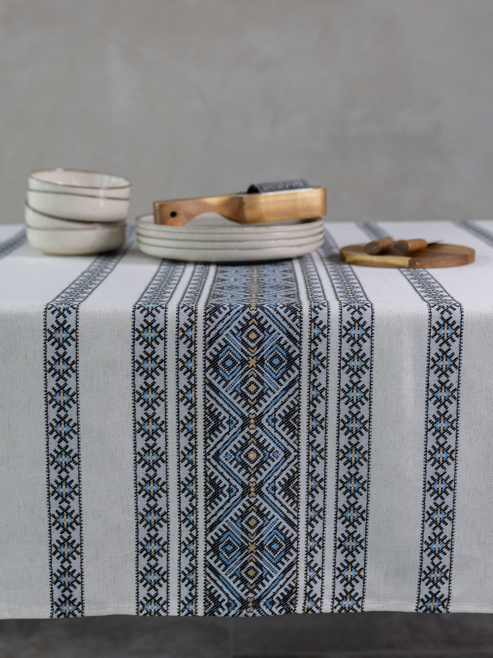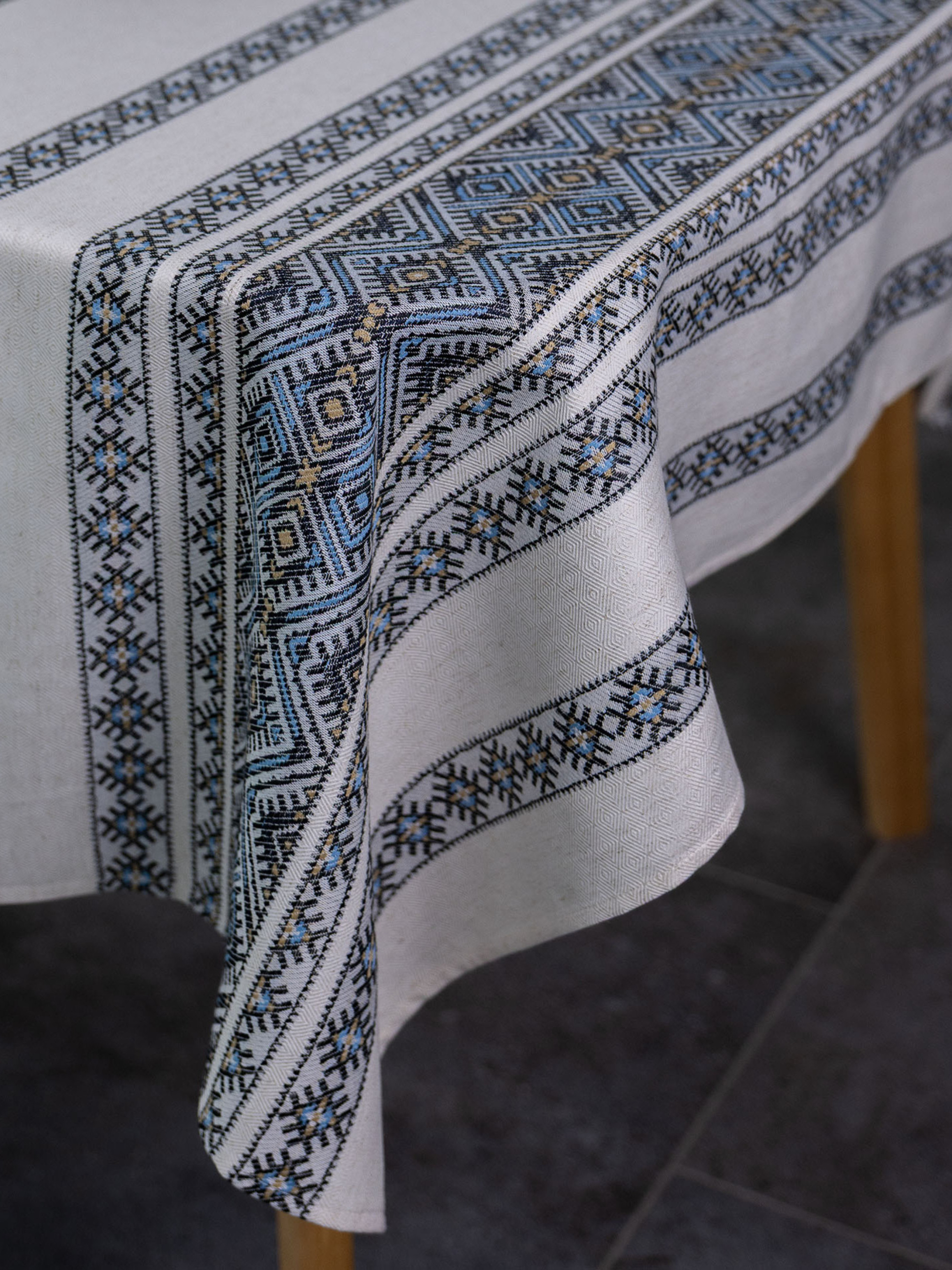 Скатертина жакардова «Кузьма» — це вишуканий елемент інтер’єру, що поєднує традиційний український орнамент із сучасною якістю. Виготовлена з практичних та зносостійких матеріалів: поліестер 42%, акрил 30%, бавовна 25% і льон 3%. Такий склад забезпечує міцність, довгий термін служби та приємну текстуру на дотик. Завдяки розміру 2,34 × 1,60 метри скатертина чудово підходить для великих столів — як для щоденного використання, так і для прийому гостей у родинному колі. Вона створює затишну атмосферу й додає інтер’єру глибини та характеру. Геометричні візерунки в поєднанні чорного, світло-блакитного та бежевого кольорів виглядають елегантно та стримано. Скатертина «Кузьма» гармонійно поєднується зі стилями етно, кантрі, сканди чи мінімалізм, пасуючи як до дерев’яних, так і до сучасних меблів.