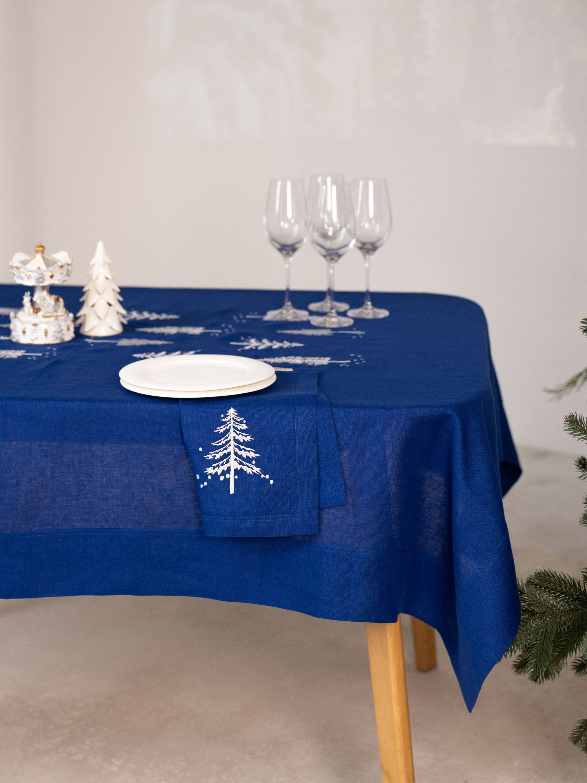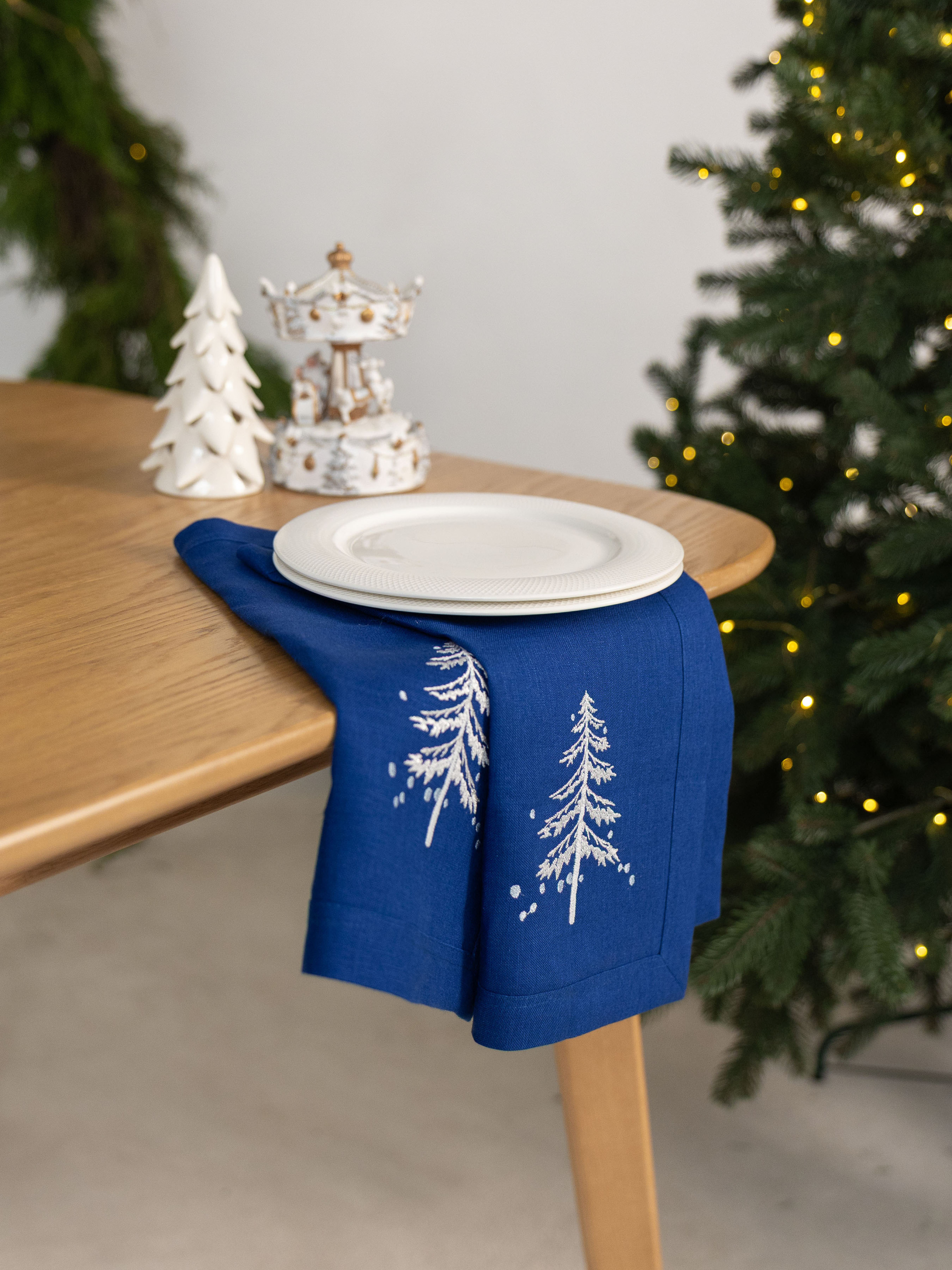 Комплект із двох лляних серветок — це поєднання простоти та вишуканості, яке додасть святкового шарму вашому столу. Глибокий синій колір із білим візерунком ялинки створює зимову атмосферу та робить сервірування особливим. Такі серветки легко поєднати з білим чи дерев’яним посудом, скатертиною або доріжкою з цієї ж колекції, створюючи гармонійний ансамбль для святкових зустрічей і повсякденних вечерь. Розмір кожної серветки зручний для сервірування тарілок та декоративного оформлення столу. Вони стануть практичним і стильним акцентом, який допоможе підкреслити вашу увагу до деталей. Склад — 100% льон. Натуральний матеріал відомий своєю міцністю, довговічністю та екологічністю. Серветки не лише прикрашають інтер’єр, а й роблять атмосферу домашніх свят затишною та теплою.