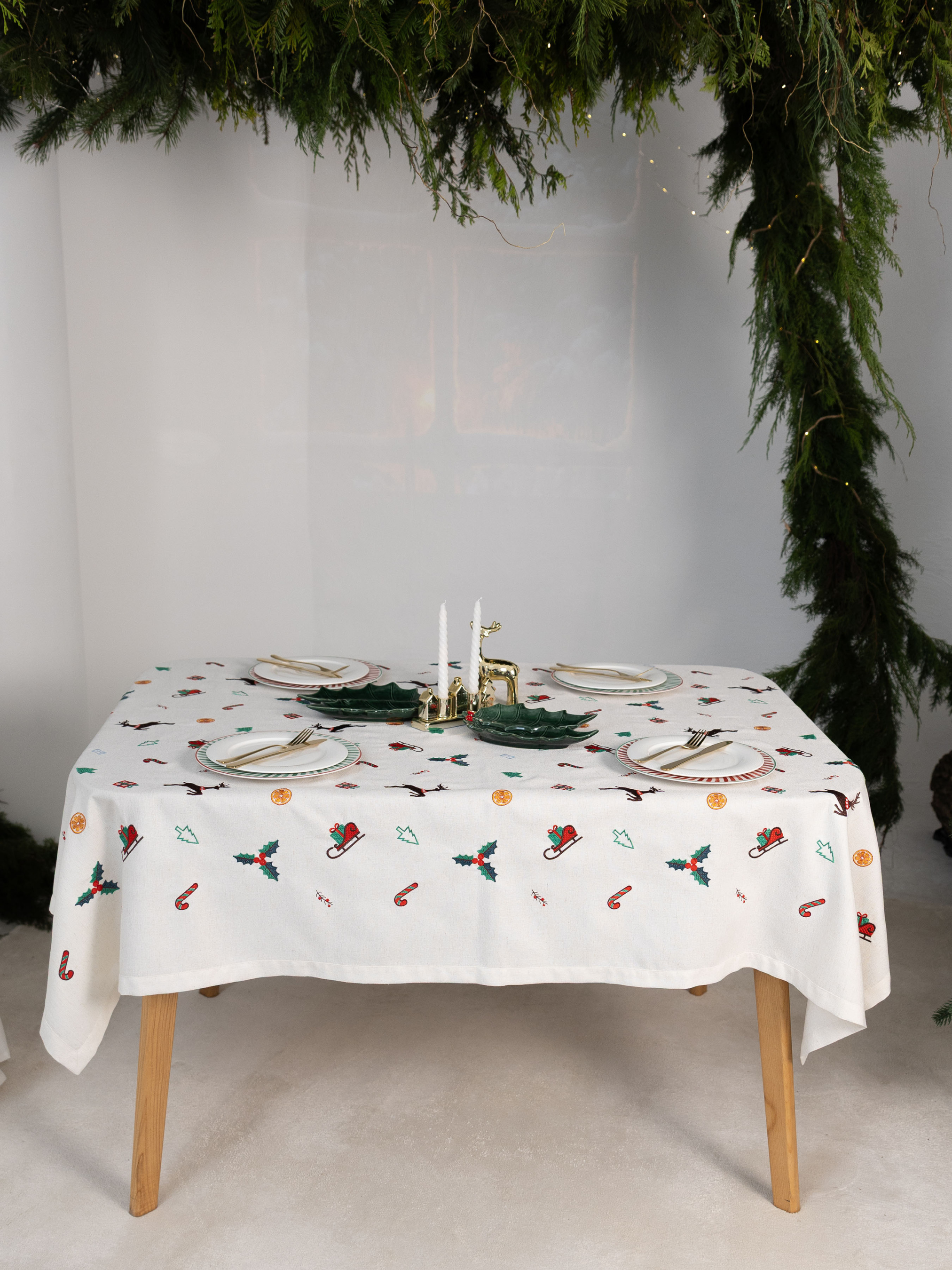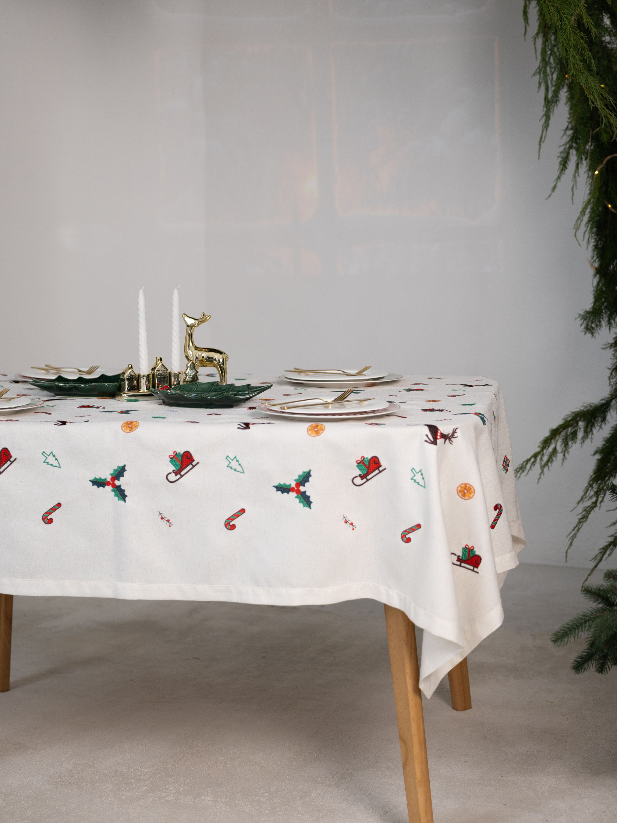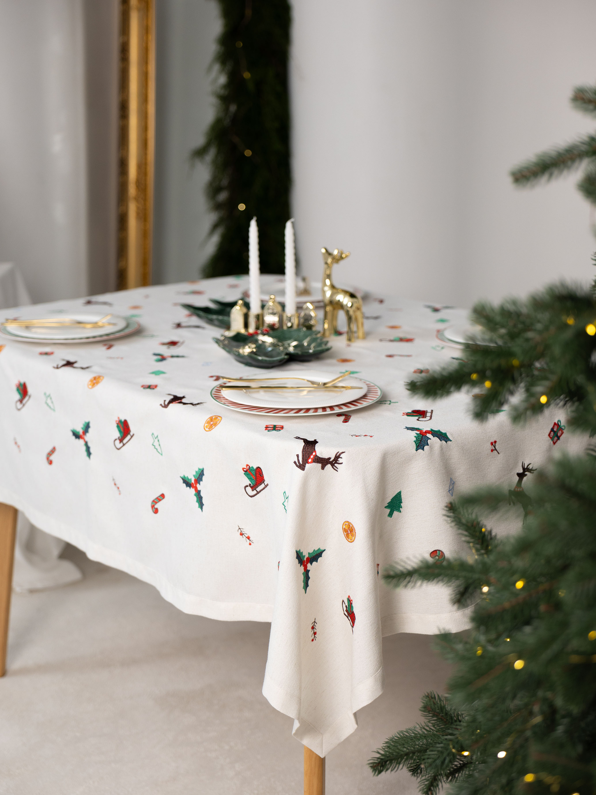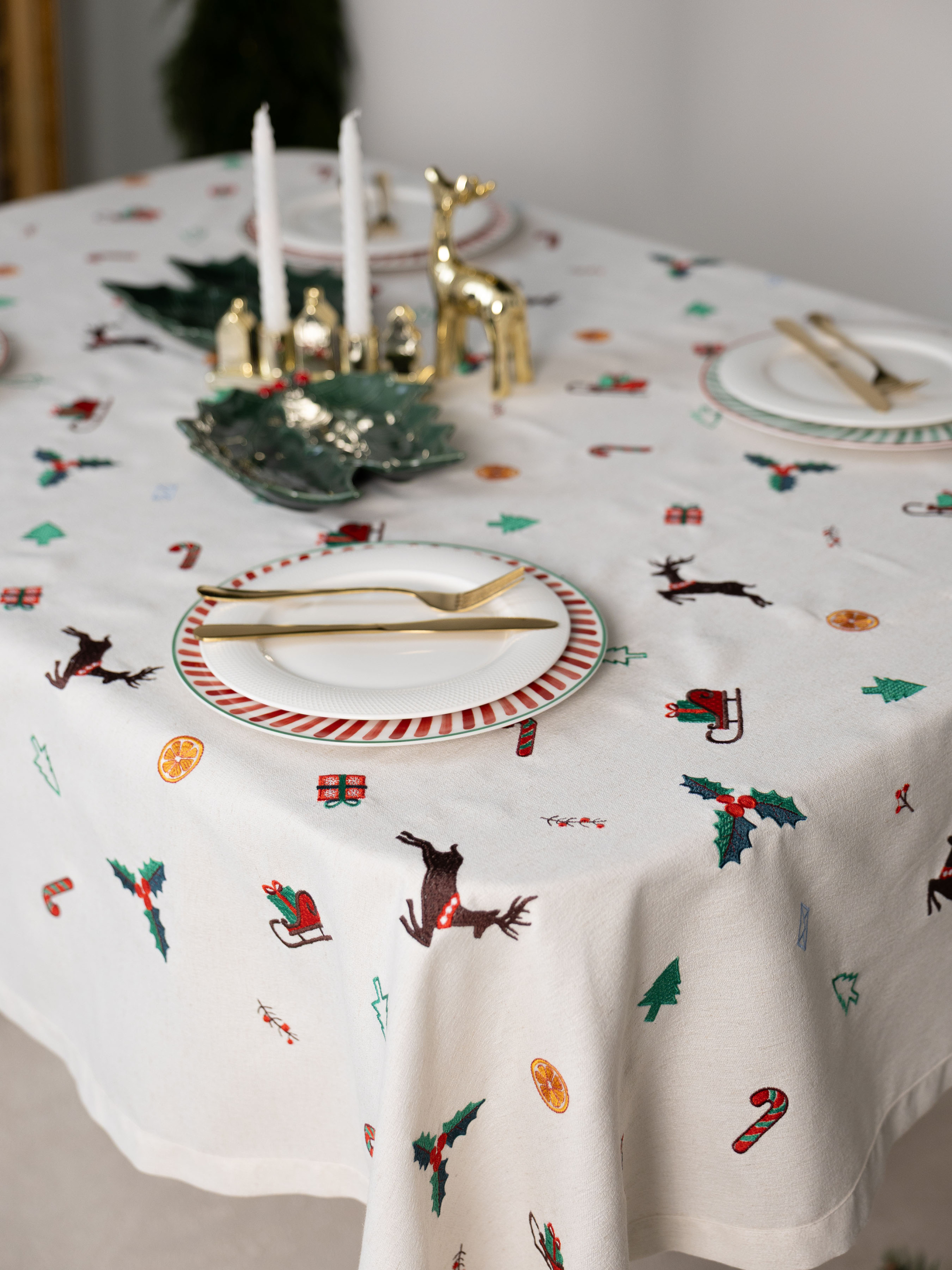 Скатертина «Різдвяна мелодія» огортає дім атмосферою свята й тепла. Її вишуканий орнамент із зимових символів — граційних оленів, ялинкових прикрас, солодких льодяників, ароматних скибок апельсина та святкових санчат — створює ніжну різдвяну історію, що оживає на кожному сантиметрі тканини. Скатертина дозволяє оформити стіл так, щоб кожна спільна трапеза перетворювалася на особливу подію. Вона органічно поєднується з натуральним деревом, керамікою та теплим світлом свічок, формуючи гармонічну композицію, що додає простору затишку й урочистості. Матеріал із 75% поліестеру, 22% бавовни та 3% льону поєднує приємну фактуру, довговічність і легкість у догляді. «Різдвяна мелодія» — це стильний акцент, який наповнює дім святковим настроєм і робить кожну зустріч за столом трішки чарівнішою.