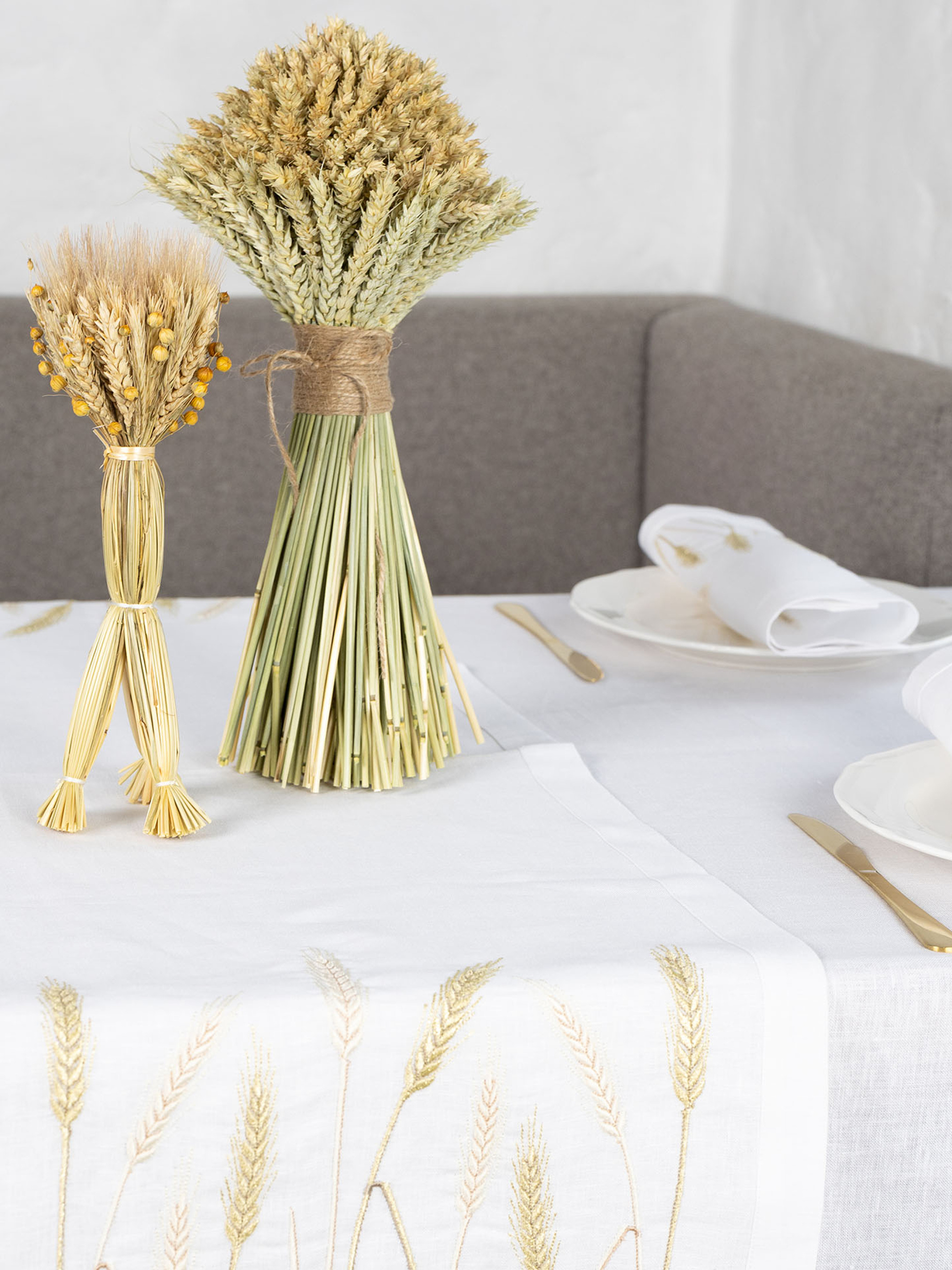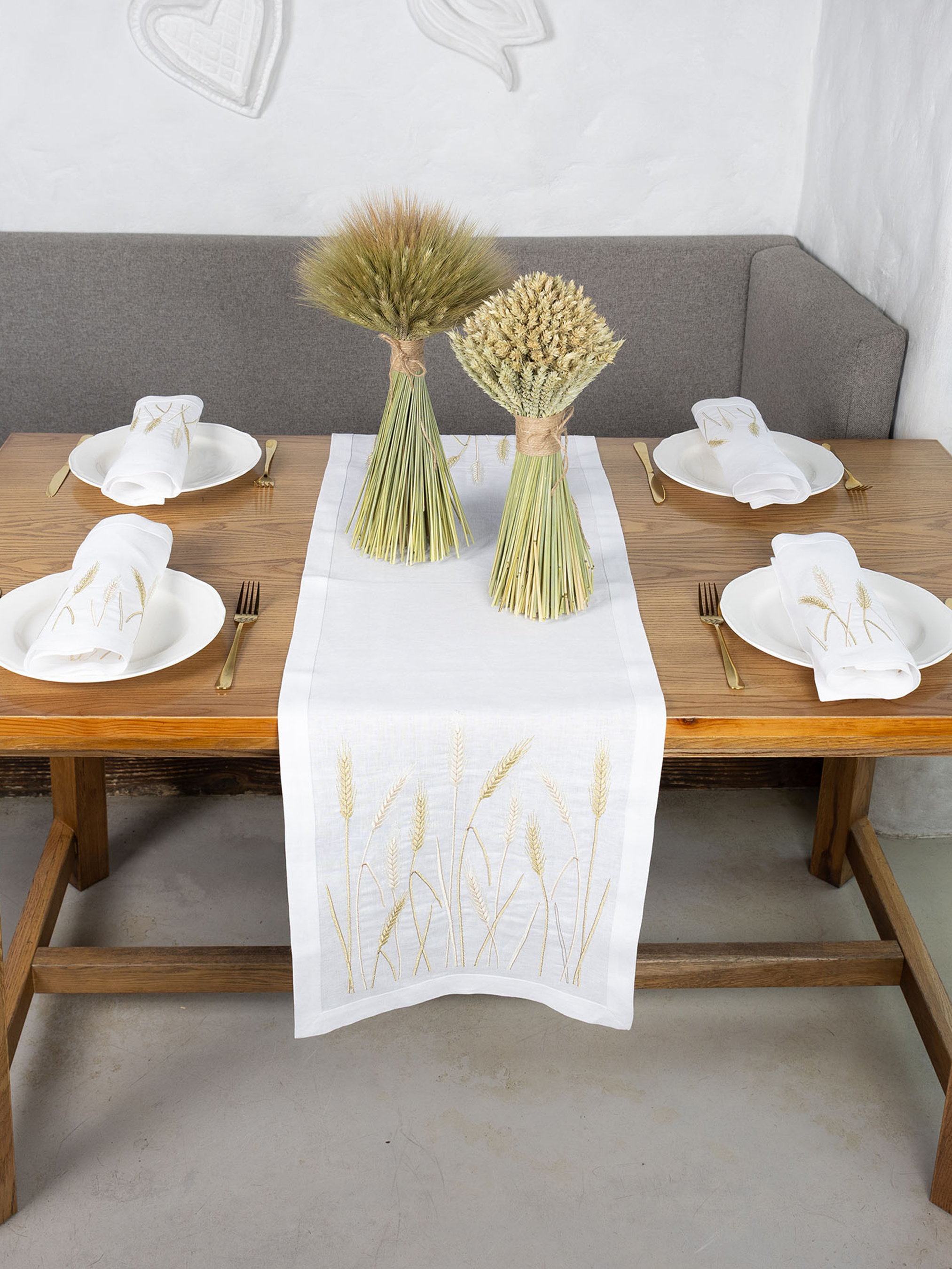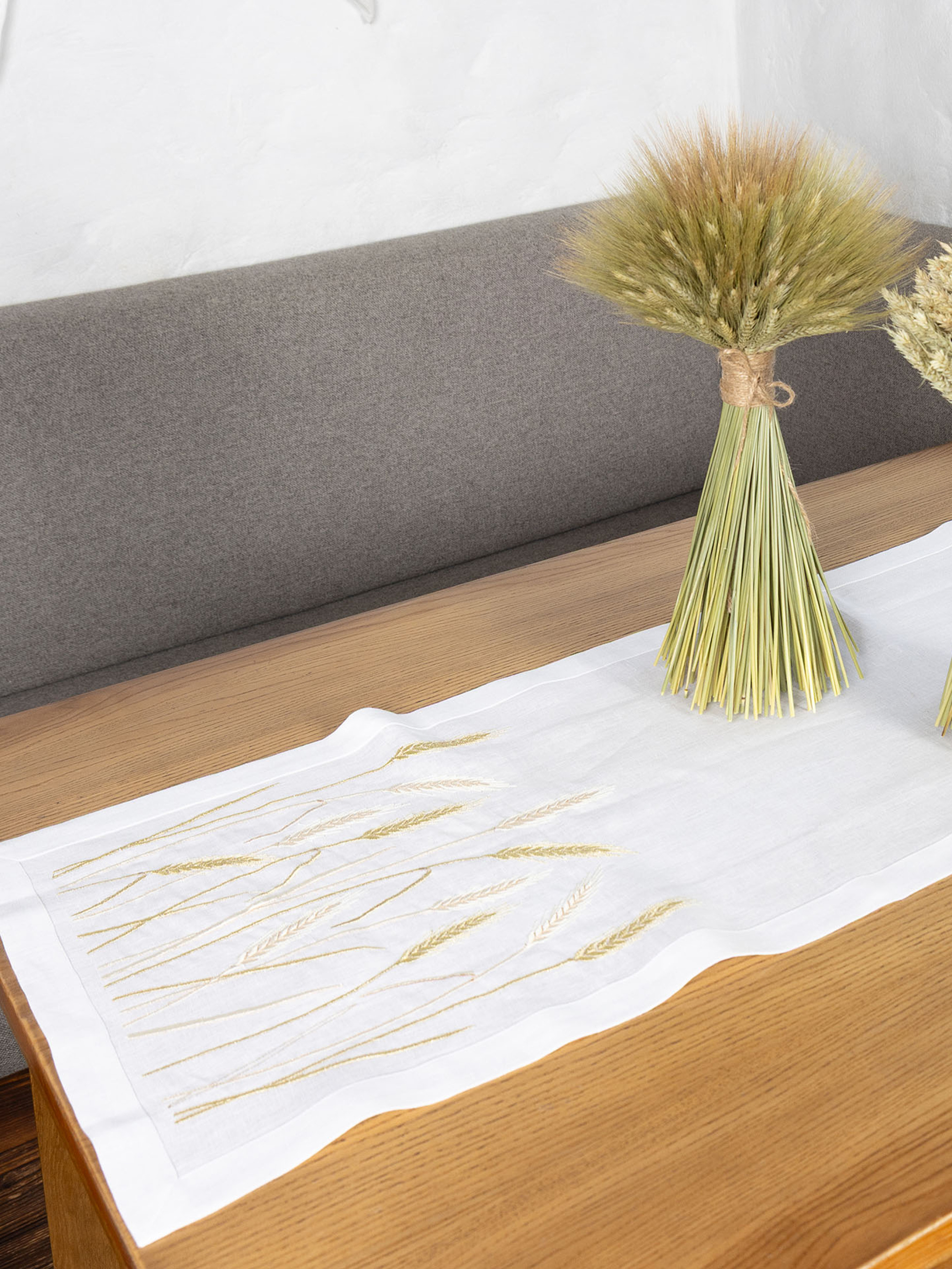 Вишита доріжка «Пшеничне поле» – це унікальний аксесуар для вашого столу. Вона створена зі 100% льону, таке полотно слугуватиме вам довгі роки та не втрачатиме первинного вигляду. Його волокна володіють надзвичайними властивостями, вони зносостійкі та міцні. Біле полотно гармонійно поєднується з золотистою та срібною вишивкою. Пшеничні колоски щедро встеляють краї доріжки та приваблюють добробут в домі власника. А ще, ви можете поєднати доріжку, скатертину, серветки з цієї ж колекції та зробити унікальний подарунок для своїх рідних. Обирайте дизайнерський столовий текстиль від «Едельвіка» та дивуйте гостей витонченим смаком.