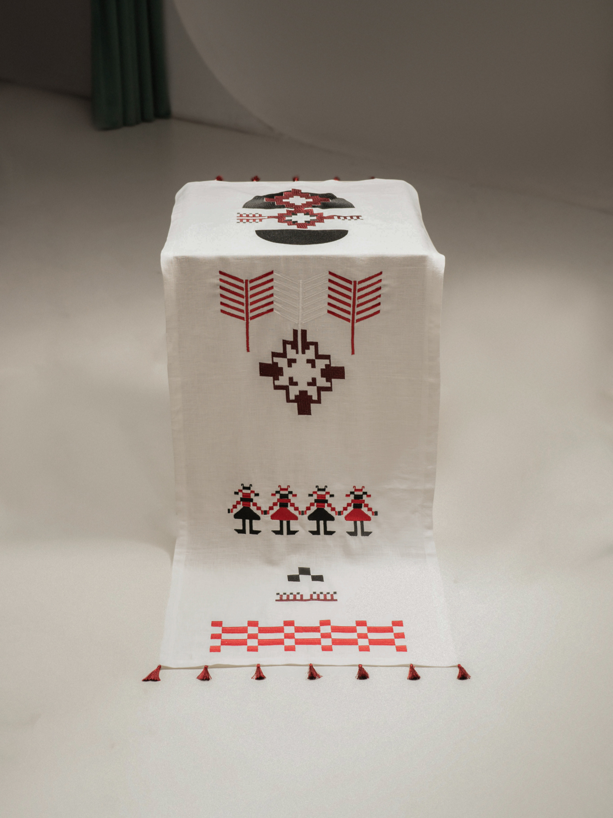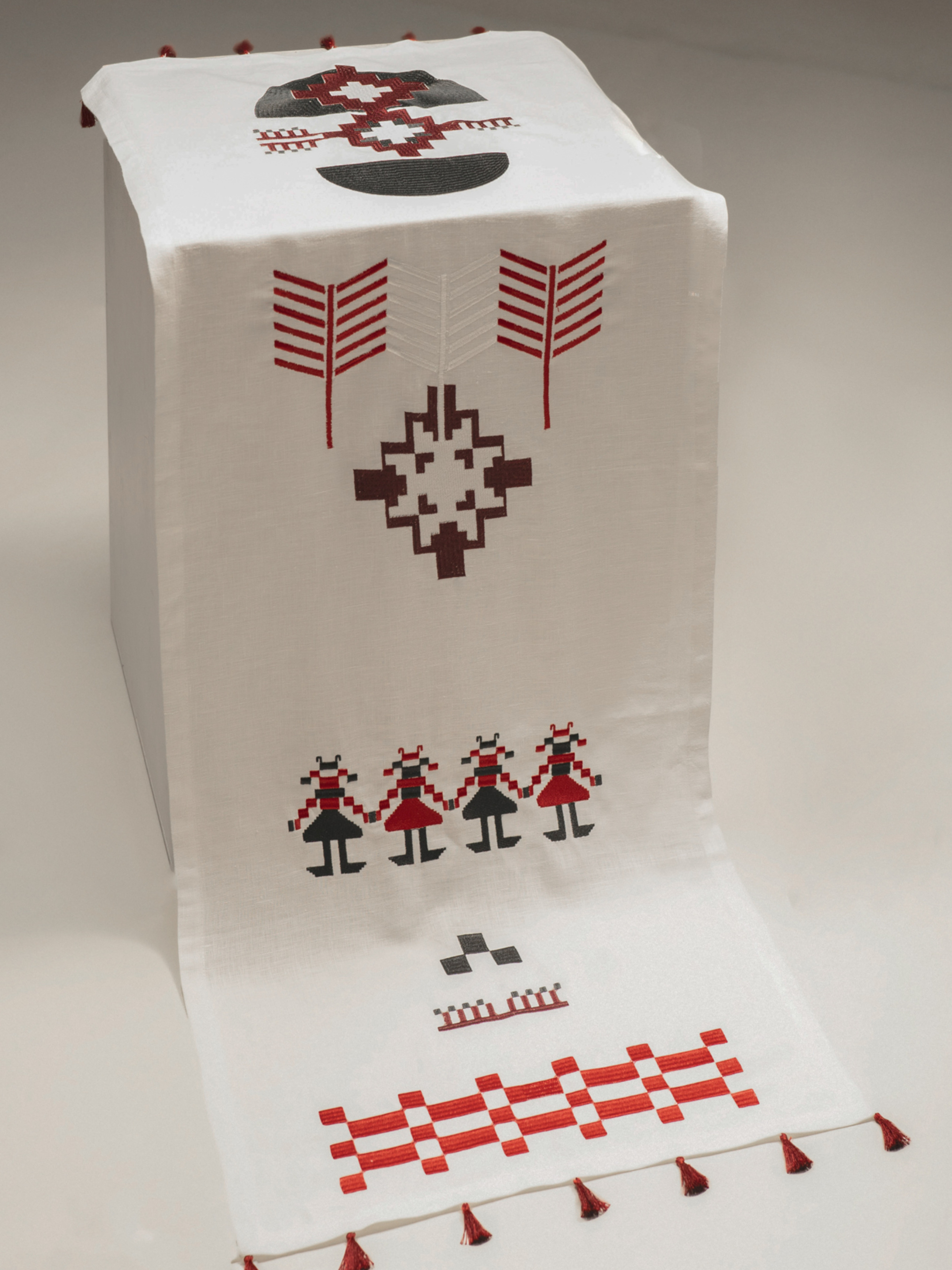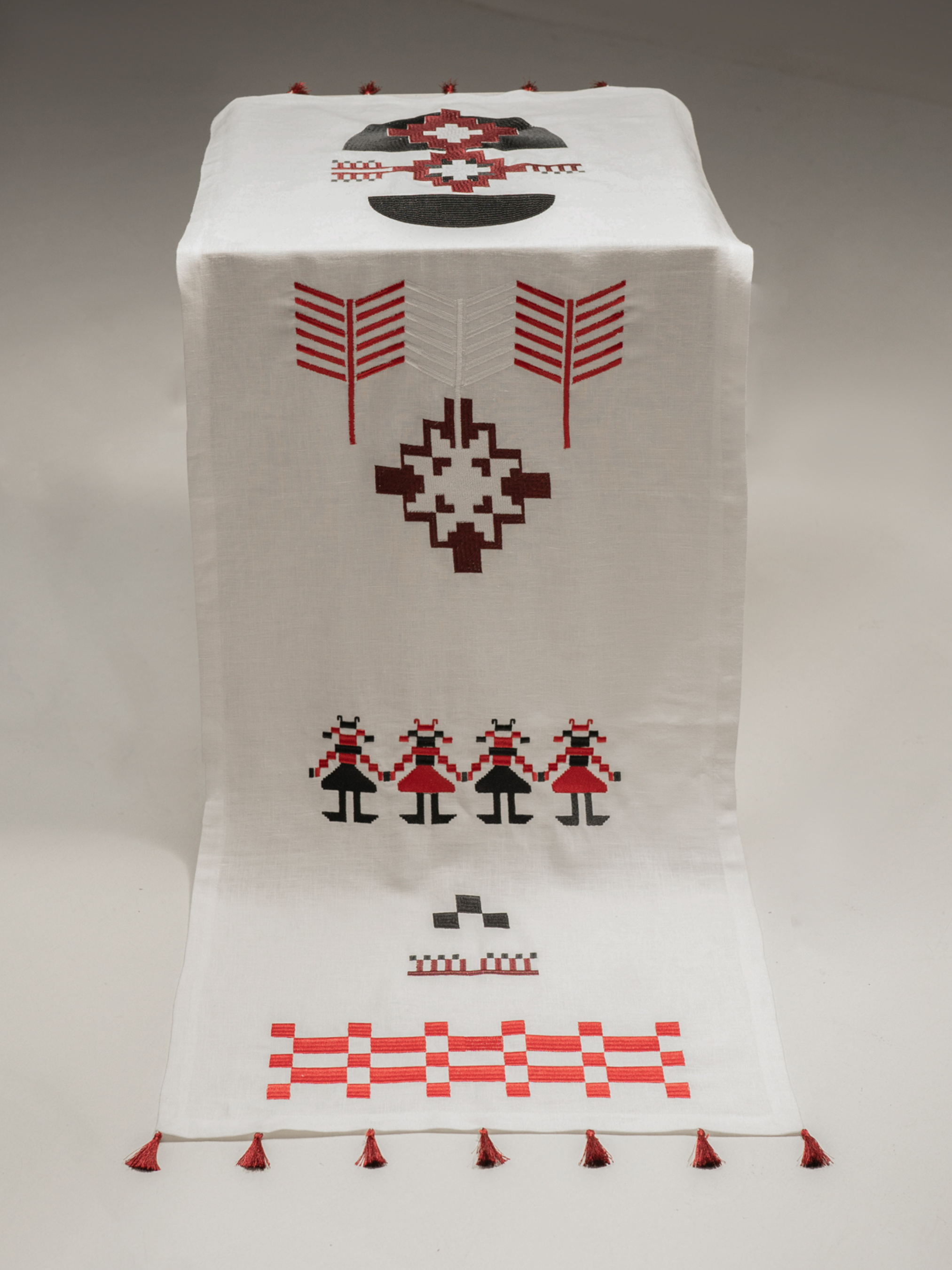 Доріжка на стіл (ранер) з льону з вишивкою Матеріал 100% льон, Колір: молоко - класичний білий Машинна вишивка гладдю чорними, червоними, білими та бордовими нитками З класичними куточками та декоративними китицями в тон на кутках Колекція виготовляється за передзамовленням, термін відправки залежить від кількості штук. Орієнтовний термін виготовлення 7-10 днів. Абстрактна вишивка з китицями на кутках, різноманітні символи зі старовинних рушників, переосмисленні та стилізовані на сучасний лад. Усюди присутня многокутова зірочка, яка знаменує 4 пори роки, зимова сніжинка та ялинка, як символи Різдвяних свят. Також можна побачити зображення берегинь - стилізовані жіночі постаті, які тримають за руки одна одну, берегиня – захисниця людей від усякого зла, «хатня» богиня, яка оберігає оселю. Також є трендовий елемент, з якого починається композиція - ""шахматна дошка"", квадрати чорних та червоних кольорів. Ідея композиційного розташування в тому, що є симетрія по вертикалі, але вся композиція має динаміку завдяки окремим деталям по краям. Концепція поєднання старовинних традицій України та сучасних елементів - являє собою основу та коріння даної колекції, створеною спеціально для бренду ""Gnizdo"