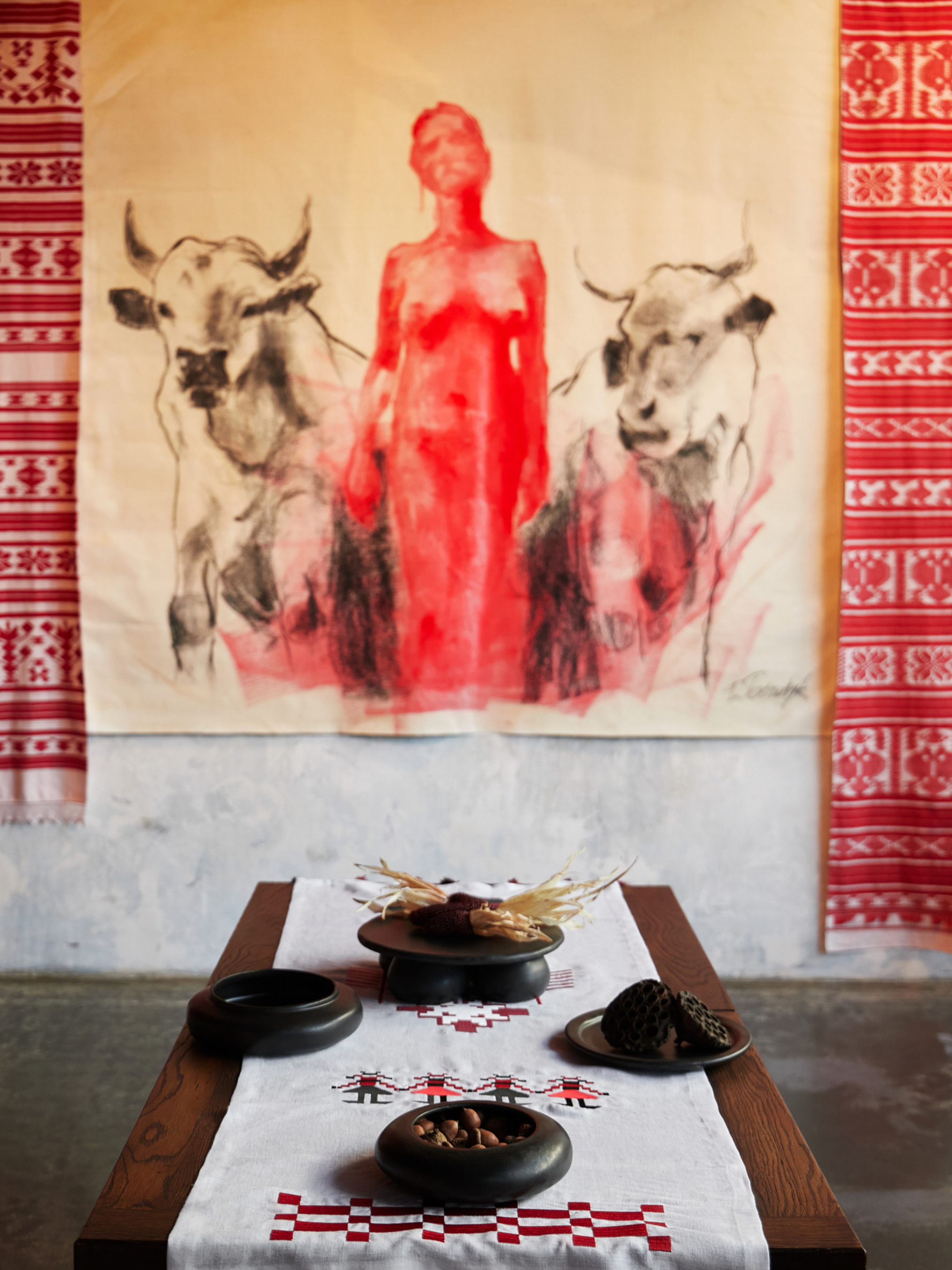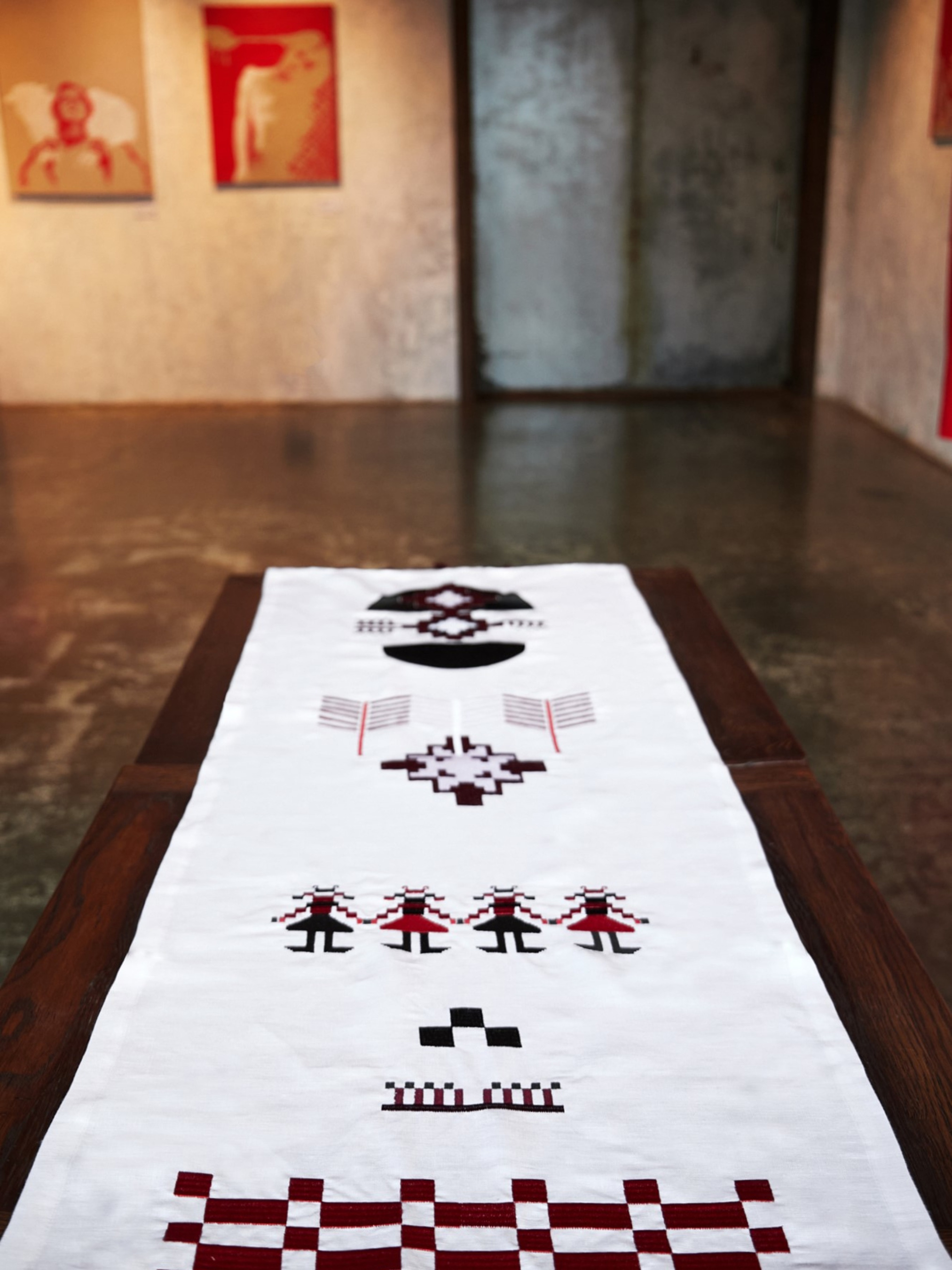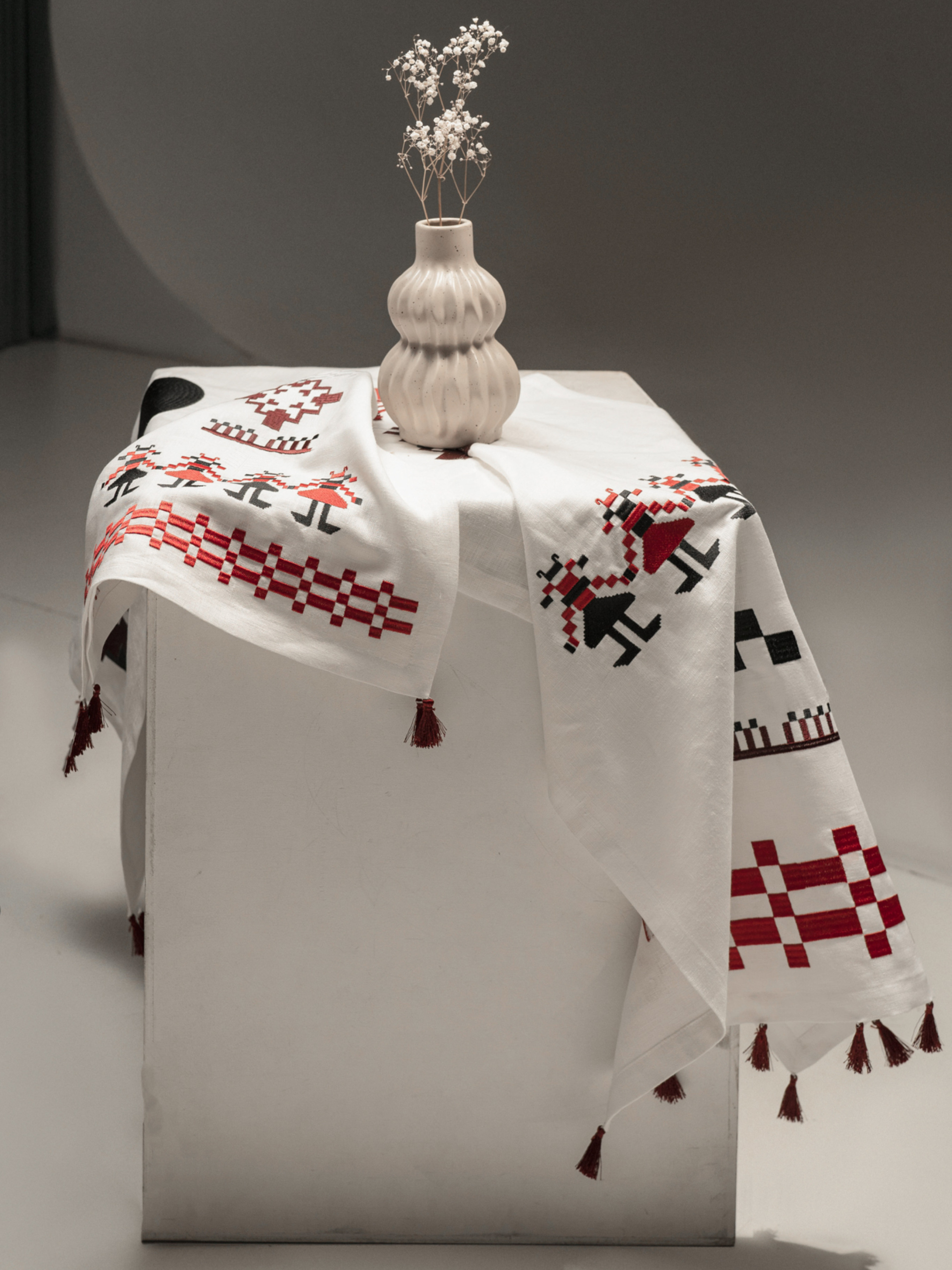 Доріжка на стіл (ранер) з льону з вишивкою Матеріал 100% льон, Колір: молоко - класичний білий Машинна вишивка гладдю чорними, червоними, білими та бордовими нитками З класичними куточками та декоративними китицями в тон на кутках Колекція виготовляється за передзамовленням, термін відправки залежить від кількості штук. Орієнтовний термін виготовлення 7-10 днів. Абстрактна вишивка з китицями на кутках, різноманітні символи зі старовинних рушників, переосмисленні та стилізовані на сучасний лад. Усюди присутня многокутова зірочка, яка знаменує 4 пори роки, зимова сніжинка та ялинка, як символи Різдвяних свят. Також можна побачити зображення берегинь - стилізовані жіночі постаті, які тримають за руки одна одну, берегиня – захисниця людей від усякого зла, «хатня» богиня, яка оберігає оселю. Також є трендовий елемент, з якого починається композиція - ""шахматна дошка"", квадрати чорних та червоних кольорів. Ідея композиційного розташування в тому, що є симетрія по вертикалі, але вся композиція має динаміку завдяки окремим деталям по краям. Концепція поєднання старовинних традицій України та сучасних елементів - являє собою основу та коріння даної колекції, створеною спеціально для бренду ""Gnizdo"