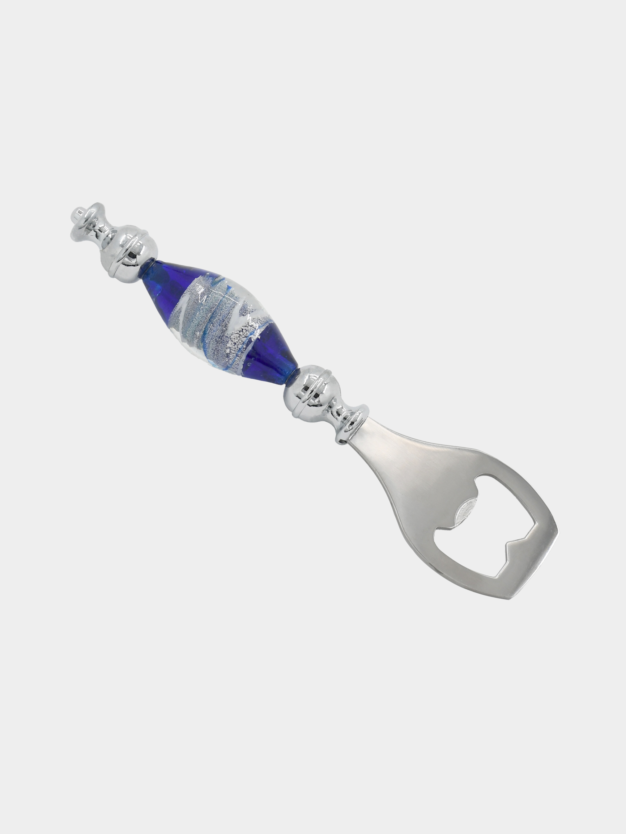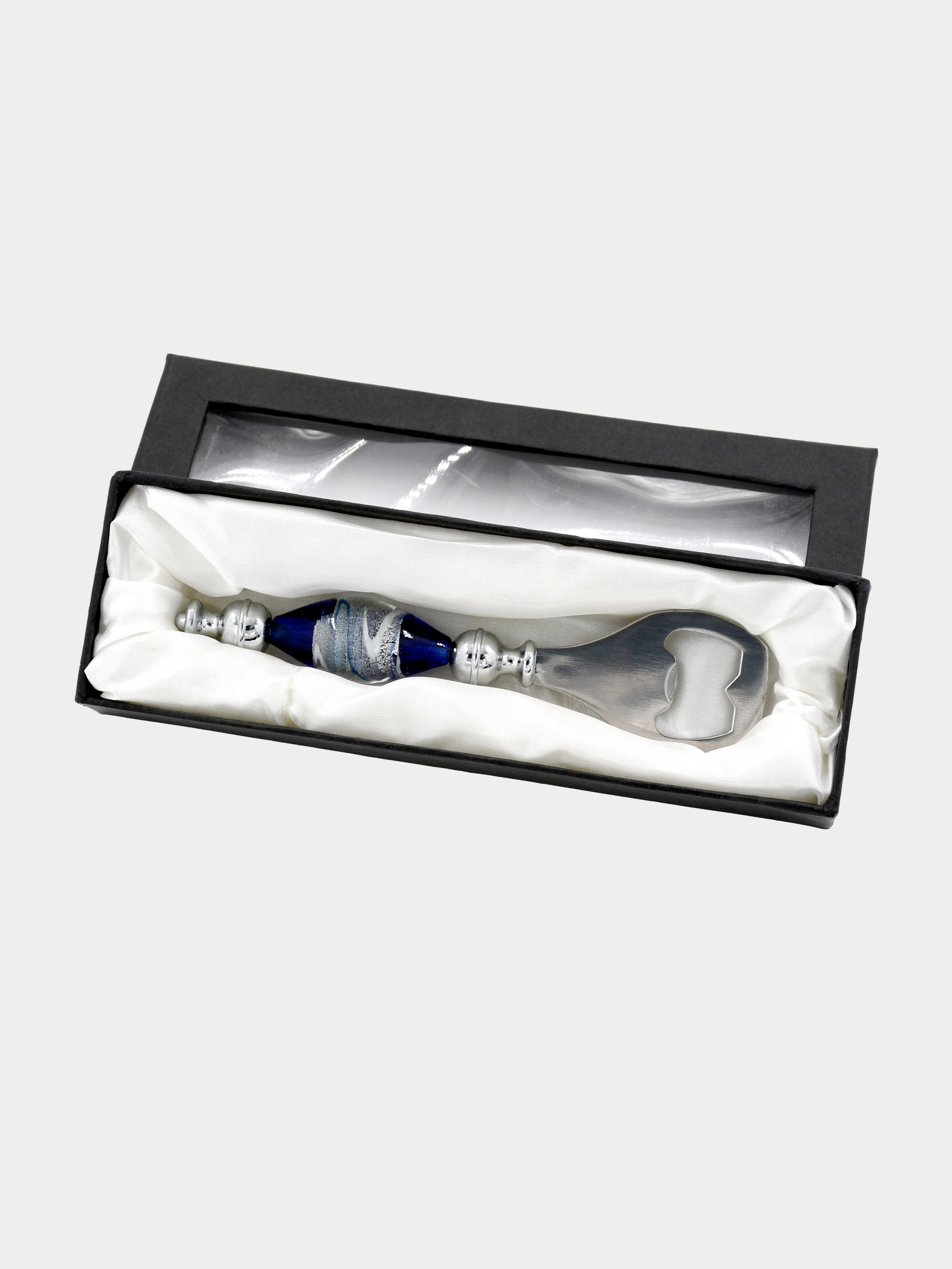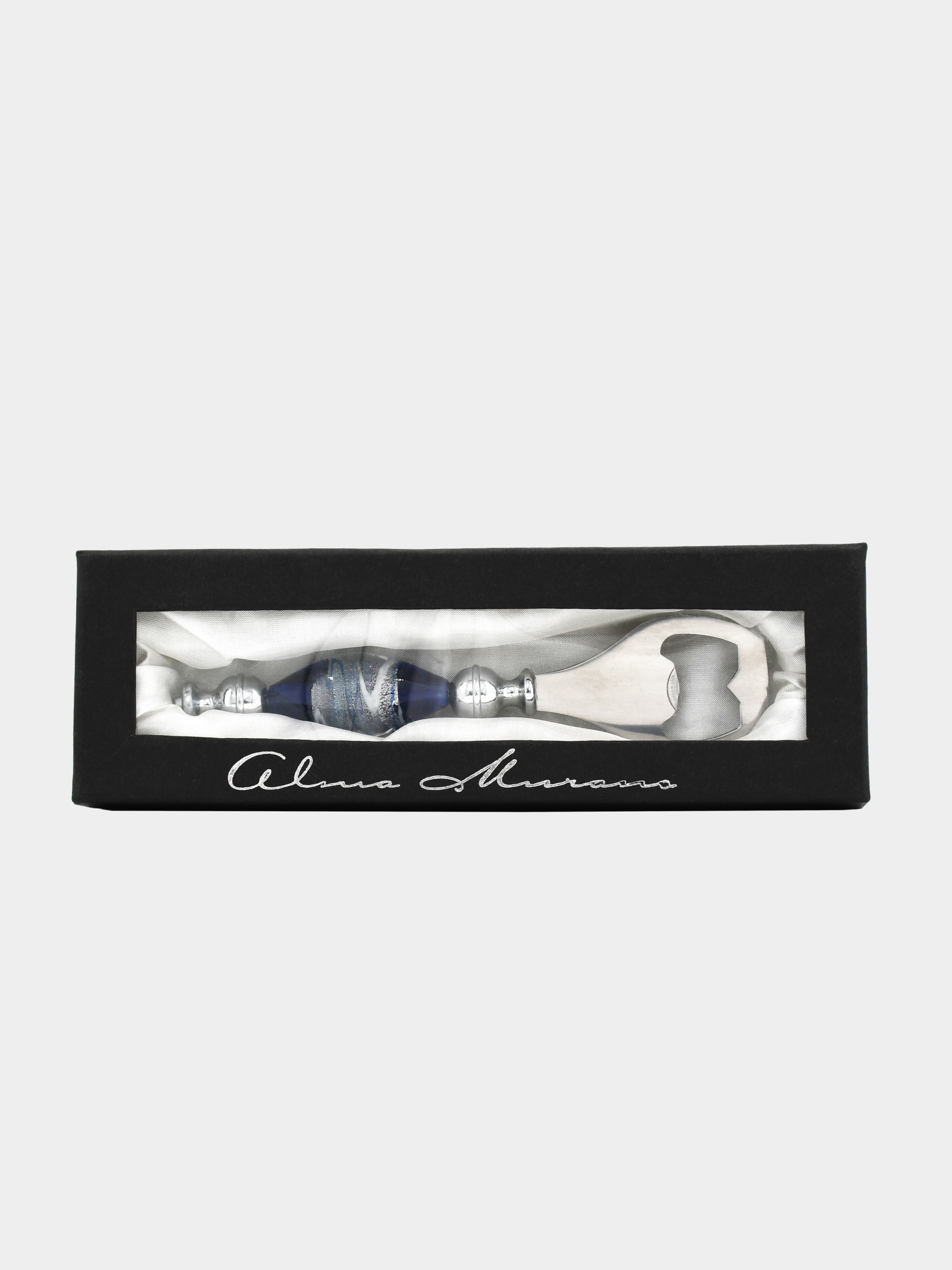Відкривачка в подарунковій коробці. Матеріал виготовлення: метал (нержавіюча сталь), скло (стилізація під мурано), шовк (внутрішня обробка подарункової коробки). ПЕРЕВАГИ: • Багатий вибір відкривачок, пробок для пляшок, штопорів і десертних ложечок (колекція включає в себе вироби в різних колірних рішеннях і формах). • Всі вироби повністю функціональні. • Товар володіє фірмовою подарунковій упаковкою «Alma Murano» з внутрішньою обробкою коробки шовком, що надає цим виробам сувенірна подарункове напрямок. • Вироби колекції можуть стати відмінним подарунком як чоловікові, так і жінці. Завдяки різним декорів та формами, є можливість підібрати сувенір у вигляді відкривачки, пробки для пляшок, штопора, набір десертних ложечок для будь-якої людини.