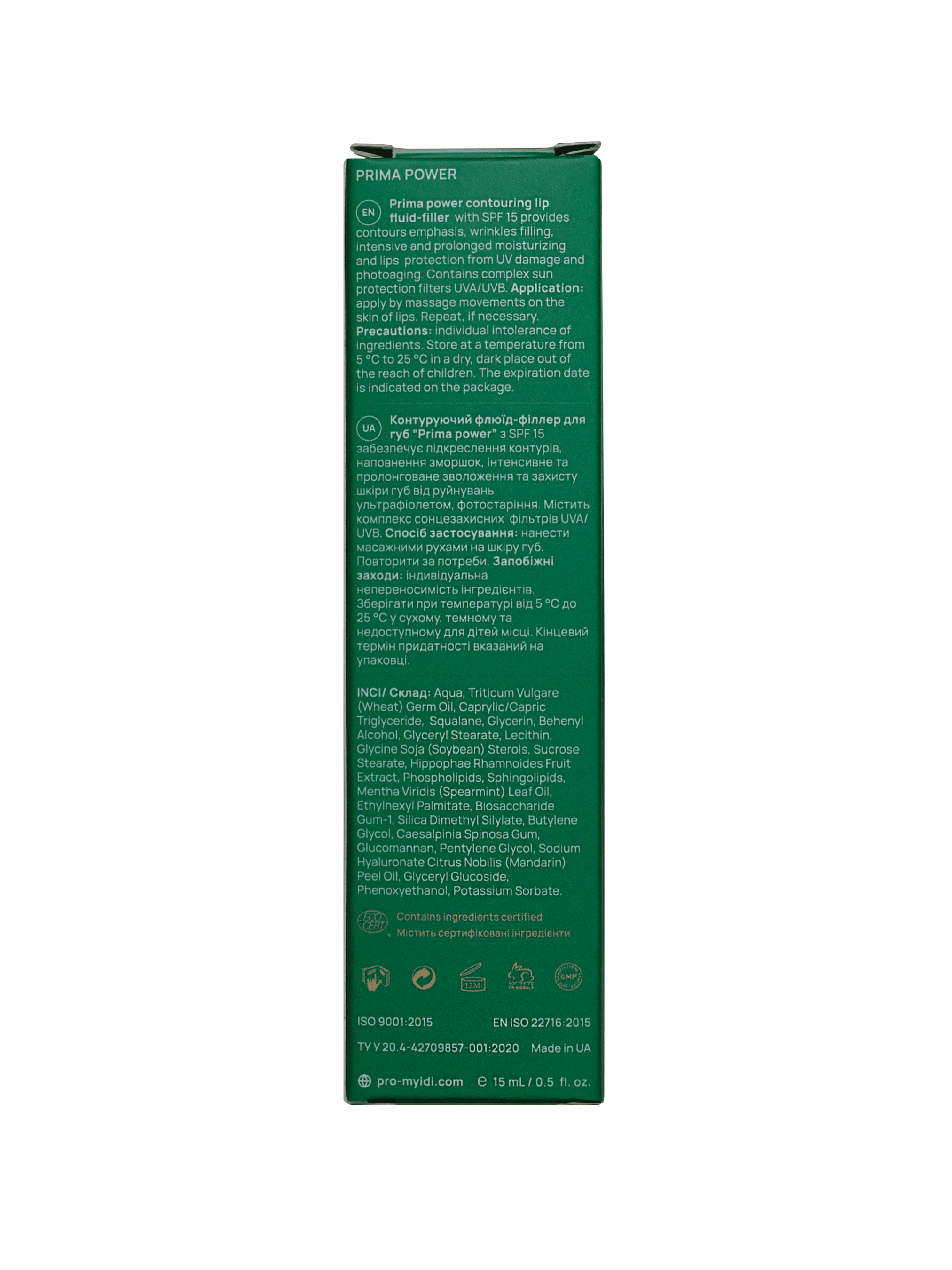 Контуруючий флюїд-філлер для губ “Prima power” з SPF 15: • забезпечує підкреслення контурів губ; • заповнює зморшки та зволожує; • забезпечує інтенсивне та пролонговане зволоження; • збільшує об’єм губ; • захищає шкіру губ від руйнувань ультрафіолетом та фотостаріння; • містить комплекс сонцезахисних фільтрів UVA/UVB. Контуруючий флюїд-філлер для губ “Prima power” з SPF 15 – це безпечна альтернатива косметологічним маніпуляціям. Він моментально зволожує, додає об’єм завдяки заповненню зморшок губ, підкреслює природний відтінок, захищає від ультрафіолету та надає їм доглянутий вигляд. Ефективна формула Контуруючого флюїд-філлеру для губ “Prima power” з SPF 15 містить у складі унікальну запатентовану технологію Filling Spheres, яка отримана шляхом зшивання молекул гіалуронової кислоти та завдяки цьому дозволяє отримати миттєвий ефект як від інвазивних процедур. Ефект збільшення досягається за рахунок: • комплексу Hyaluronic Filling Spheres – відбувається наповнення дрібних зморшок на крайній каймі губ і безпосередньо на поверхні губ, відповідно губи виглядають більш наповненими; • переливу блиску, що надає візуального ефекту збільшення губ. Peptide Vinci 02™ IS ( Hexapeptide-3) – це пептид, що складається з шести амінокислот. Частково пригнічує виділення ацетилхоліну, зменшує глибину зморшок, викликаних рухом мімічних м’язів обличчя, надає “ботоксоподібний ефект”. Клінічно доведено зменшення глибини, широти та мімічних зморшок вже через годину після нанесення. Ceramide Complex CLR™ K містить ліпіди у ламелярній формі. Суміш ліпідів, виділена з рослин, складається з фосфоліпідів та сфінголіпідів, які доглядають за сухою та потрісканою / обвітреною шкірою за допомогою структурних елементів, а також відновлює ліпідний бар'єр у роговому шарі епідермісу. Ферментована олія зародків пшениці сприяє збереженню та відновленню еластичності та пружності шкіри губ, знімає роздратування, відновлює водно-ліпідну мантію епідермісу, стимулює регенерацію. Особливо підходить для сухої, в’янучої, потрісканої шкіри губ, усуває лущення шкіри, свербіж. Сонцезахисні фільтри останнього покоління надійно захищають ніжну шкіру губ від передчасного старіння та втрати вологи. Контуруючий флюїд-філлер для губ “Prima power” з SPF 15 при регулярному використанні має накопичувальний ефект та надає природного об’єму і чіткої привабливої форми. Також ваші губи будуть мати зволожений та молодий вигляд. Він не липне, не скочується та не розтікається.