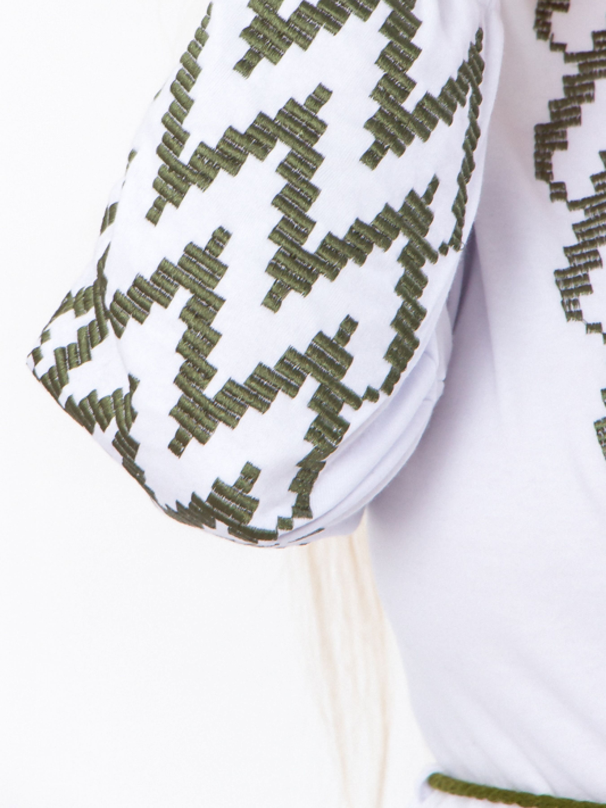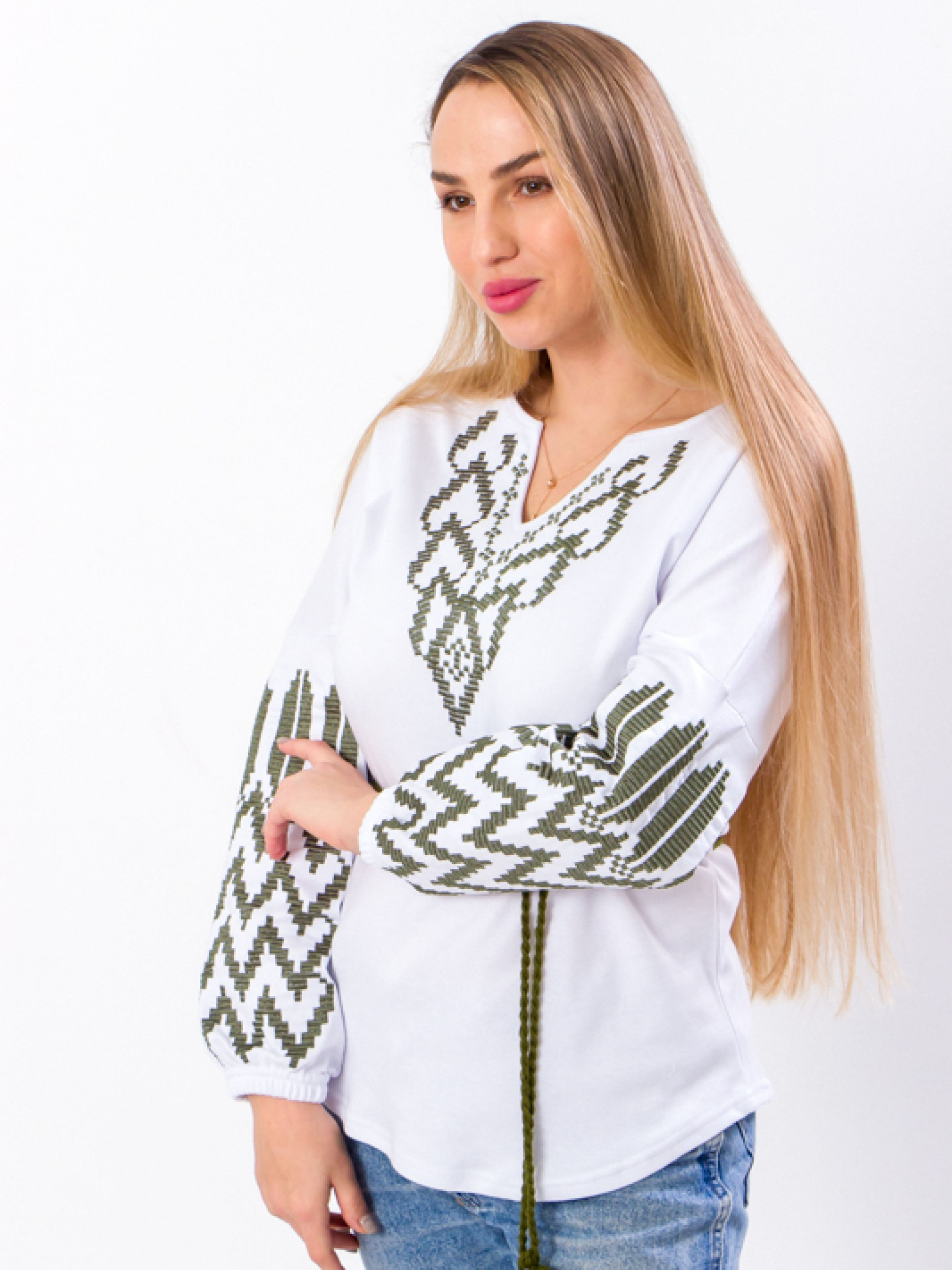 Полотно: інтерлок білий Склад полотна: 100% бавовна Розмір: 44-54 Вишиванка - класичний вид одягу характерний для українського народу. Приголомшливої краси орнамент на білому тлі точно не залишиться непоміченими. Блуза в стилі української вишиванки підкреслить вашу природну красу. Дуже добре підходить як під джинси так і в якості доповнення до суворого робочого дрес-коду. Модель з довгим рукавом. Виконана з білого інтерлока. Матеріал має приємну на дотик ніжну текстуру його поверхня гладка між лицьовою стороною і виворотом немає різниці. Крій сорочки традиційний - вільний. Вишиванка на талії стягується за допомогою червоної шнурівки з пензликами. Цей класичний орнамент що несе глибокий сенс і духовний заряд буде модним у всі часи.