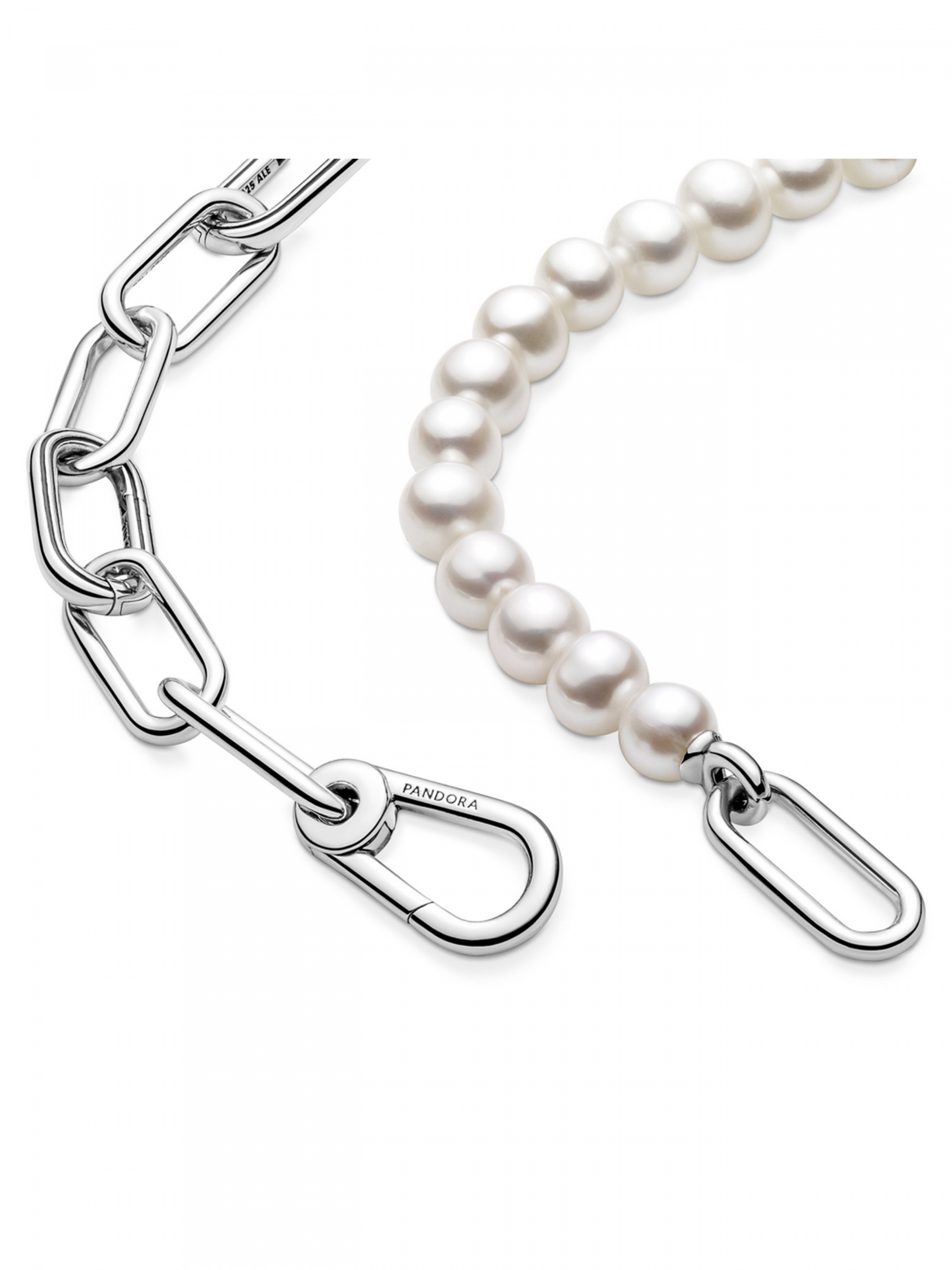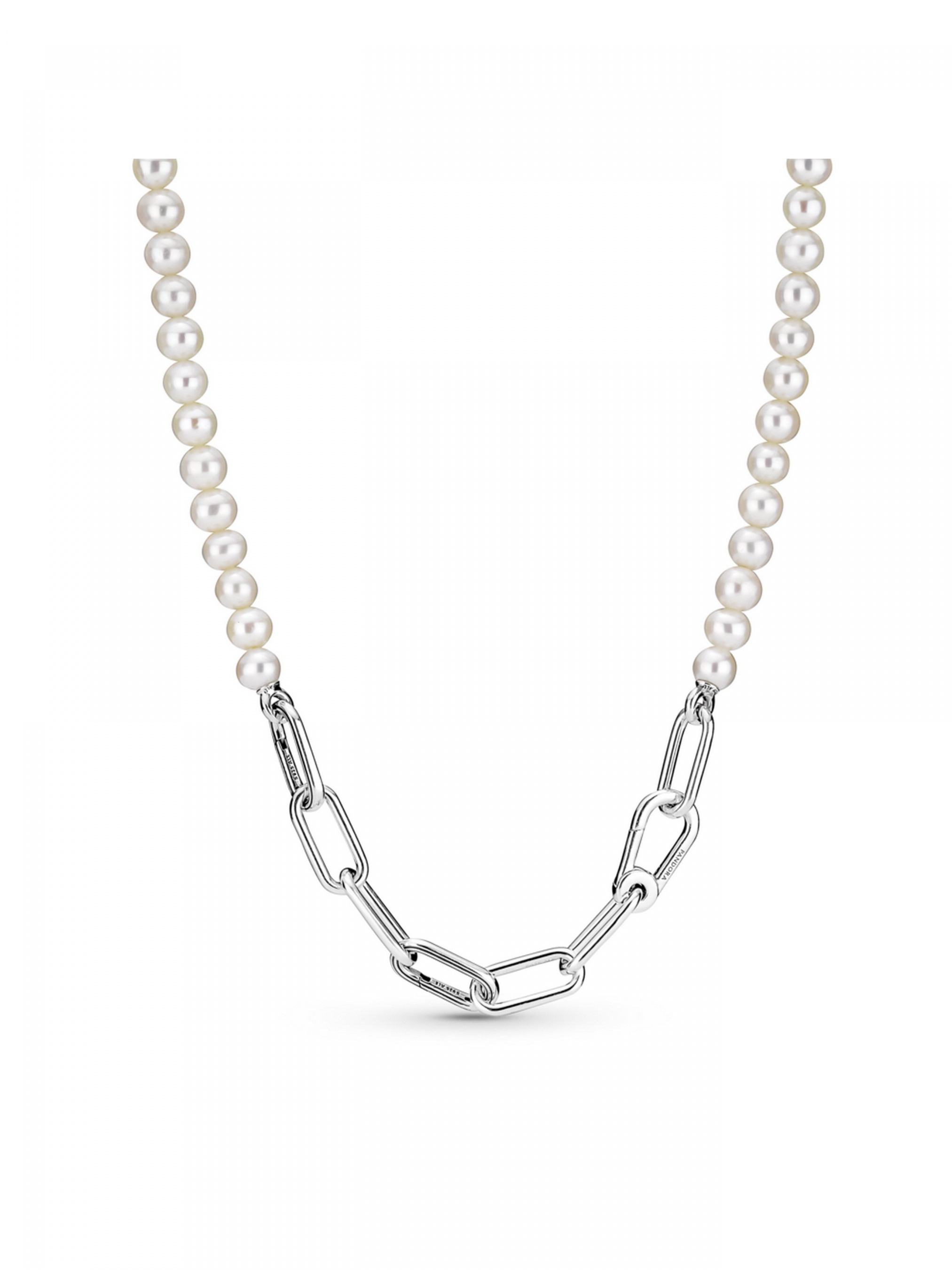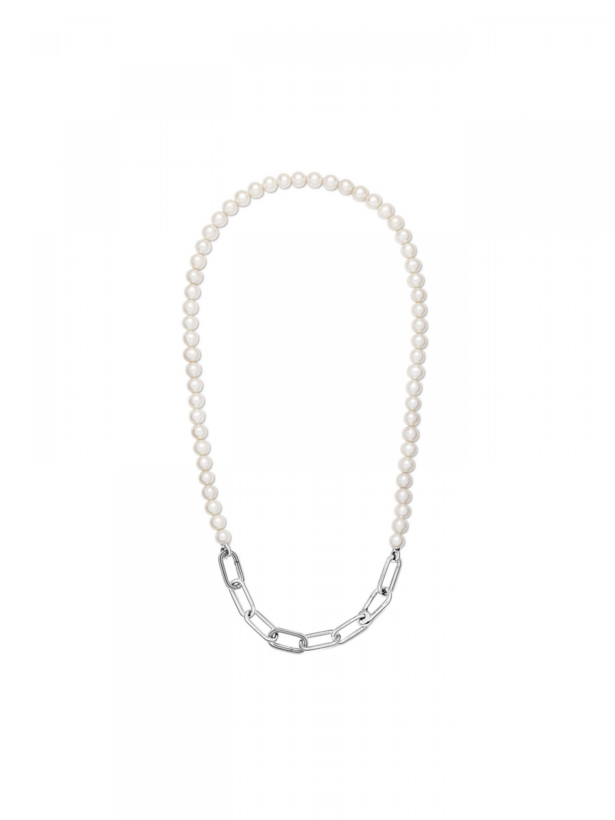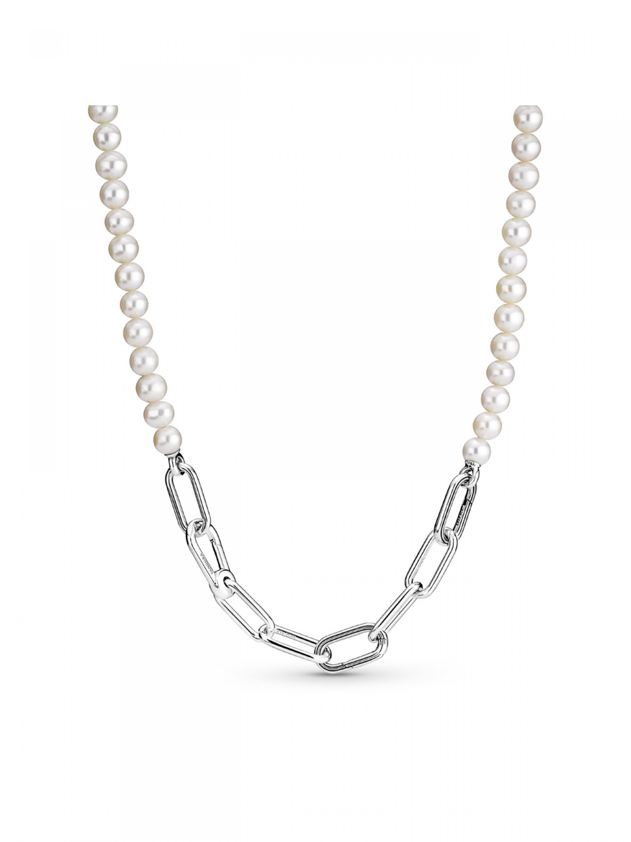 Намисто з прісноводними культивованими перлами Pandora ME — це класична прикраса з перлами у новій інтерпретації, що відкриває безмежні можливості для персоналізації дизайну. Намисто доповнено двома рельєфними з'єднувачами, що відкриваються. Між ними та застібкою-карабіном розташований рядочок прісноводних культивованих перлів, що зачаровує своєю красою. Спочатку персоналізуйте дизайн ланцюжка: один набір з'єднаних між собою ланок для стилізації можна замінити на одну подвійну ланку для стилізації або одну ланку для стилізації, при цьому ви можете, за необхідності, відкоригувати довжину ланцюжка. Персоналізований ланцюжок із ланок можна доповнити змістовними медальйонами, закріпивши їх на ланках для стилізації та з'єднувачах, і міні-підвісками, які кріпляться на з'єднувачах для стилізації, що відкриваються.