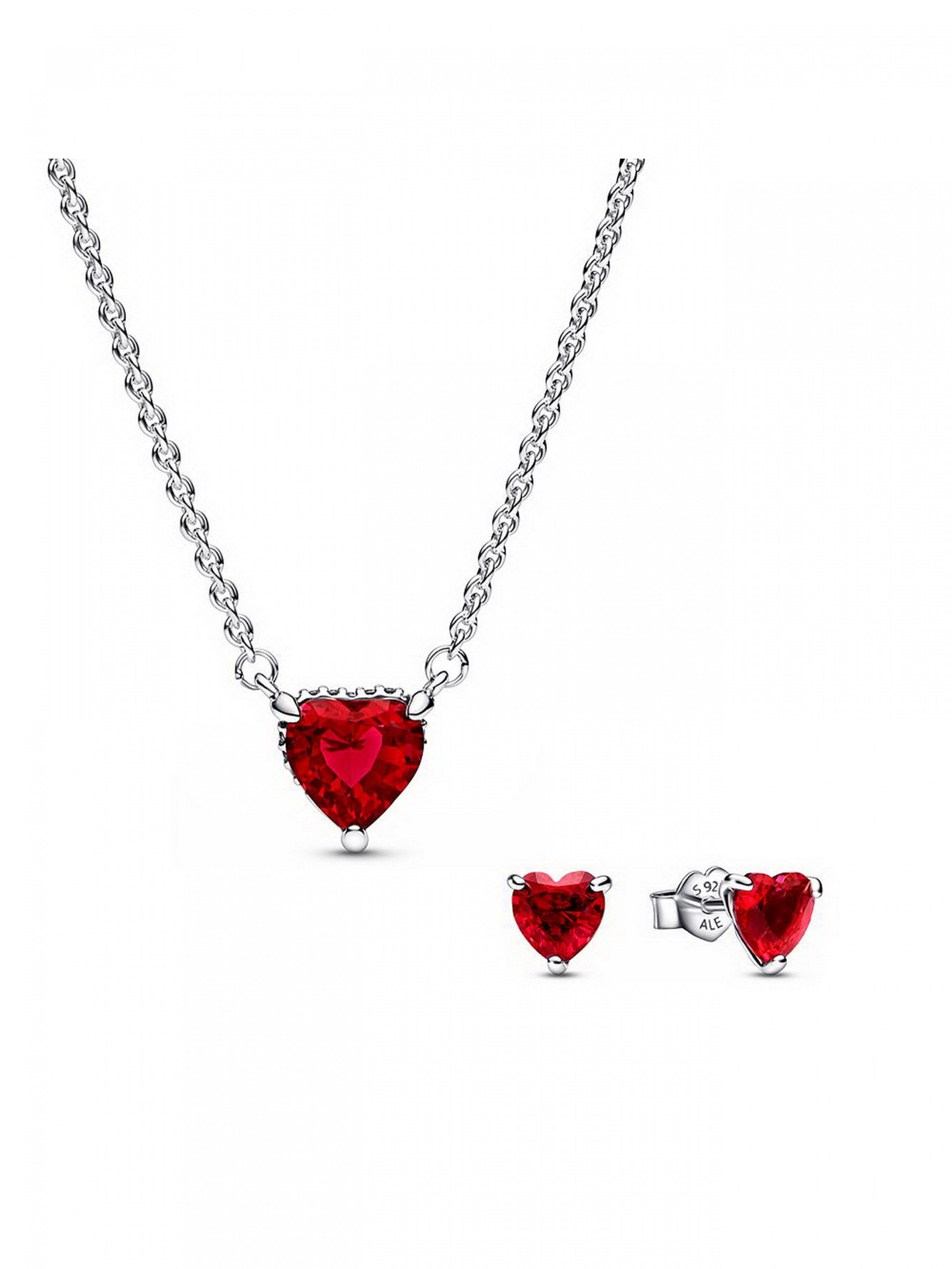 Даруйте сяйво усієї вашої любові з подарунковим комплектом "Червоне серце". До комплекту увійшли намисто "Блискуче серце з ореолом" та сережки "Червоне серце". Намисто-кольє має форму ланцюжка зі срібла 925-ї проби, який можна регулювати по довжині залежно від розміру декольте. Доповнює намисто фіксована підвіска зі штучного кристала червоного кольору у формі серця. Підвіску розміщено на срібній основі, яку вручну інкрустований рядочком паве по контуру, що додає особливого сяйва прикрасі. Застібка намиста прикрашена невеликим круглим камінцем кубічного оксиду цирконію та логотипом Pandora. Кожну сережку інкрустовано червоним штучним кристалом у формі серця, що виблискує у срібній закріпці з трьома крапанами.