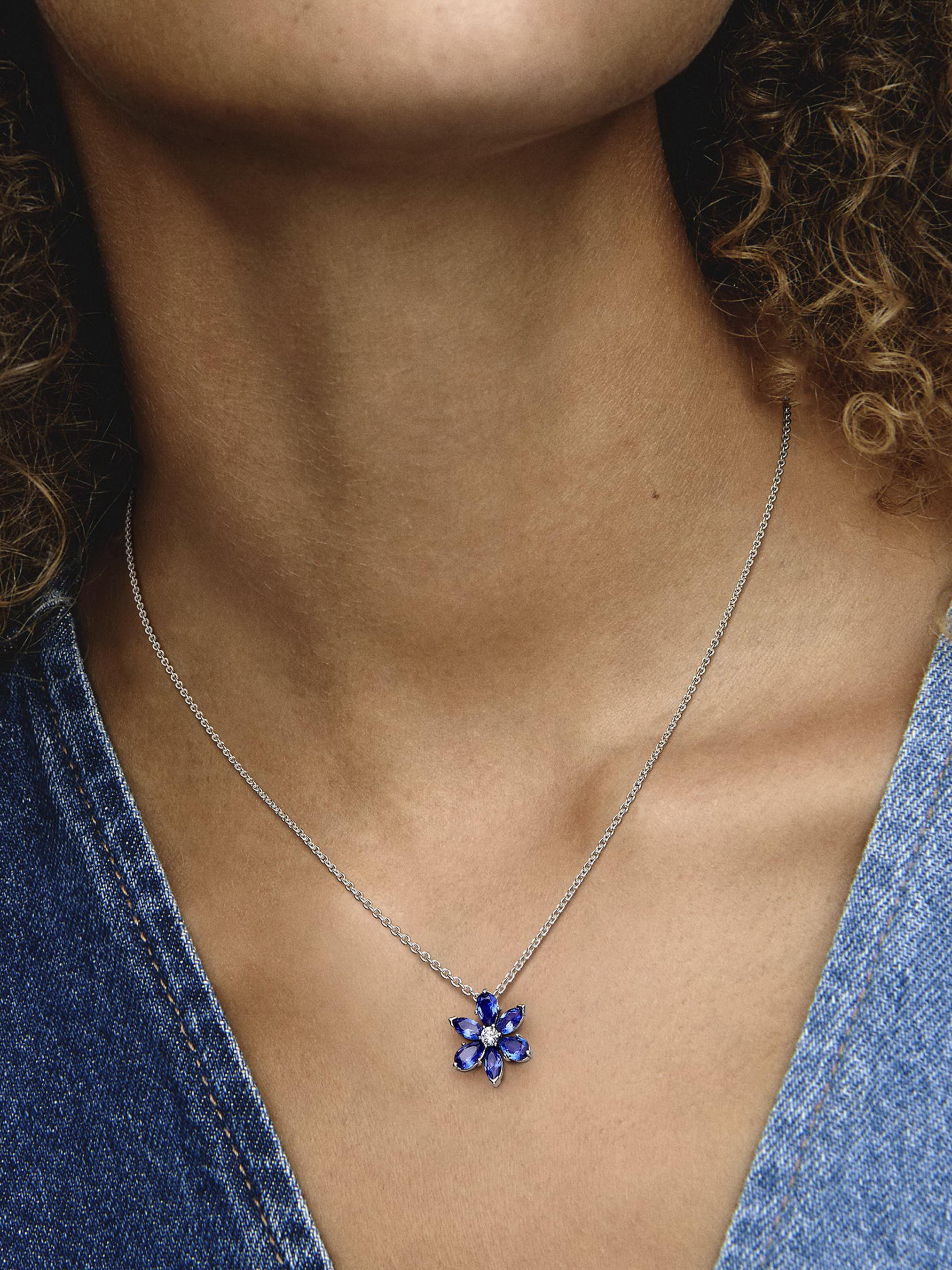 Надихайтесь природним сяянням з намистом "Сяючий гербарій". Це намисто зі срібла 925-ї проби з вишуканими синіми штучними кристалами у формі квітки натхненне квітучими деревами та полями квітів. Кулон з грушоподібними та маркізоподібними камінцями кубічного оксиду цирконію у формі квітки додасть особливого блиску будь-якому стилю. Поєднуйте різноманітні метали (або різноколірні камені) разом, щоб створити образ, який символізуватиме яскраву красу природи.