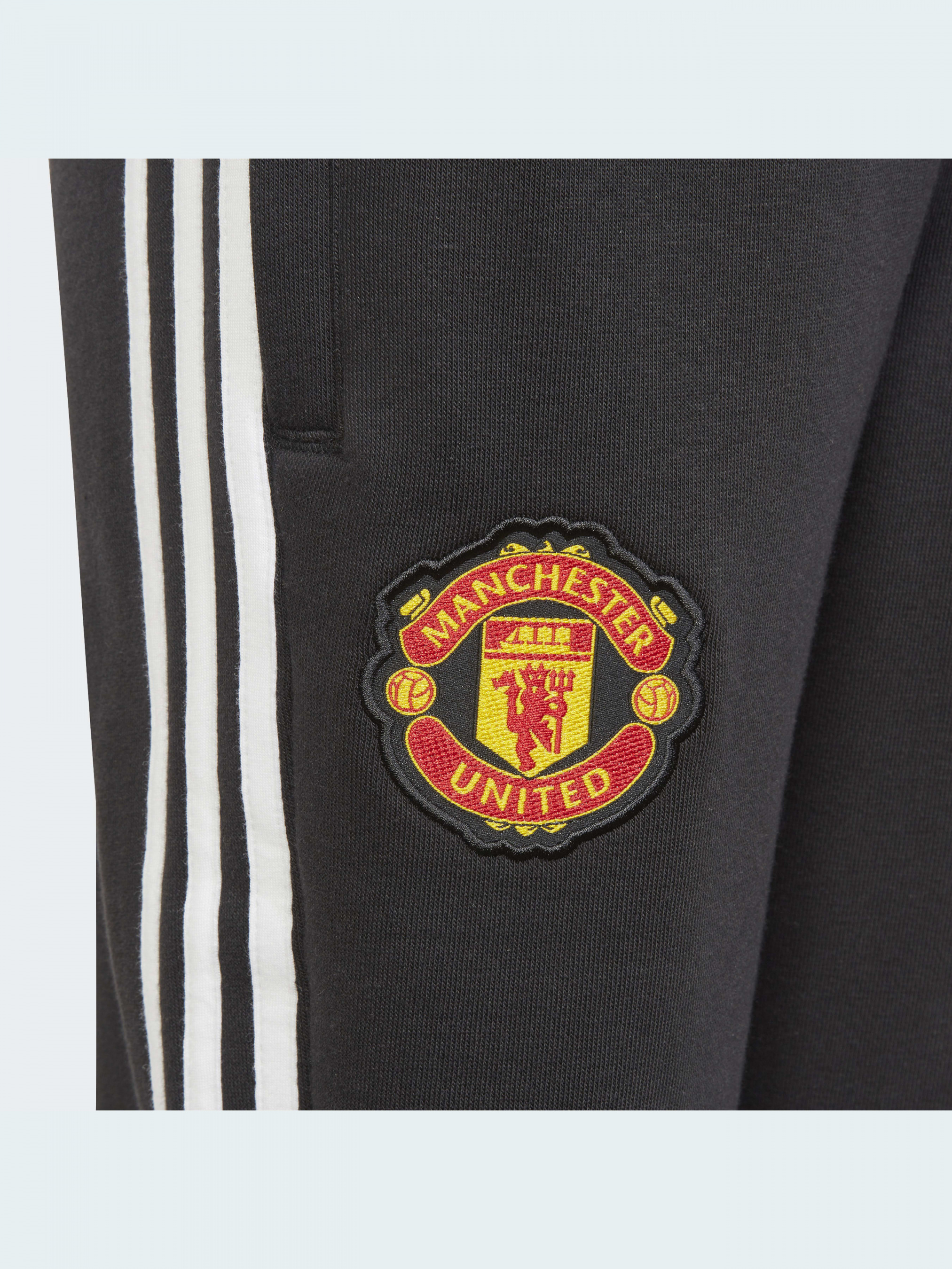Ці чорні футбольні штани adidas прикрашені фірмовою емблемою Манчестер Юнайтед. М'який футер дарує комфорт, поки ти вболіваєш за улюблену команду. Звужений донизу крій і рифлені манжети допомагають маневрувати на полі. Купуючи наш бавовняний одяг, ти підтримуєш більш екологічне вирощування та обробку бавовни. Модель виконана із перероблених матеріалів в рамках наших зобов'язань по скороченню пластикових відходів.