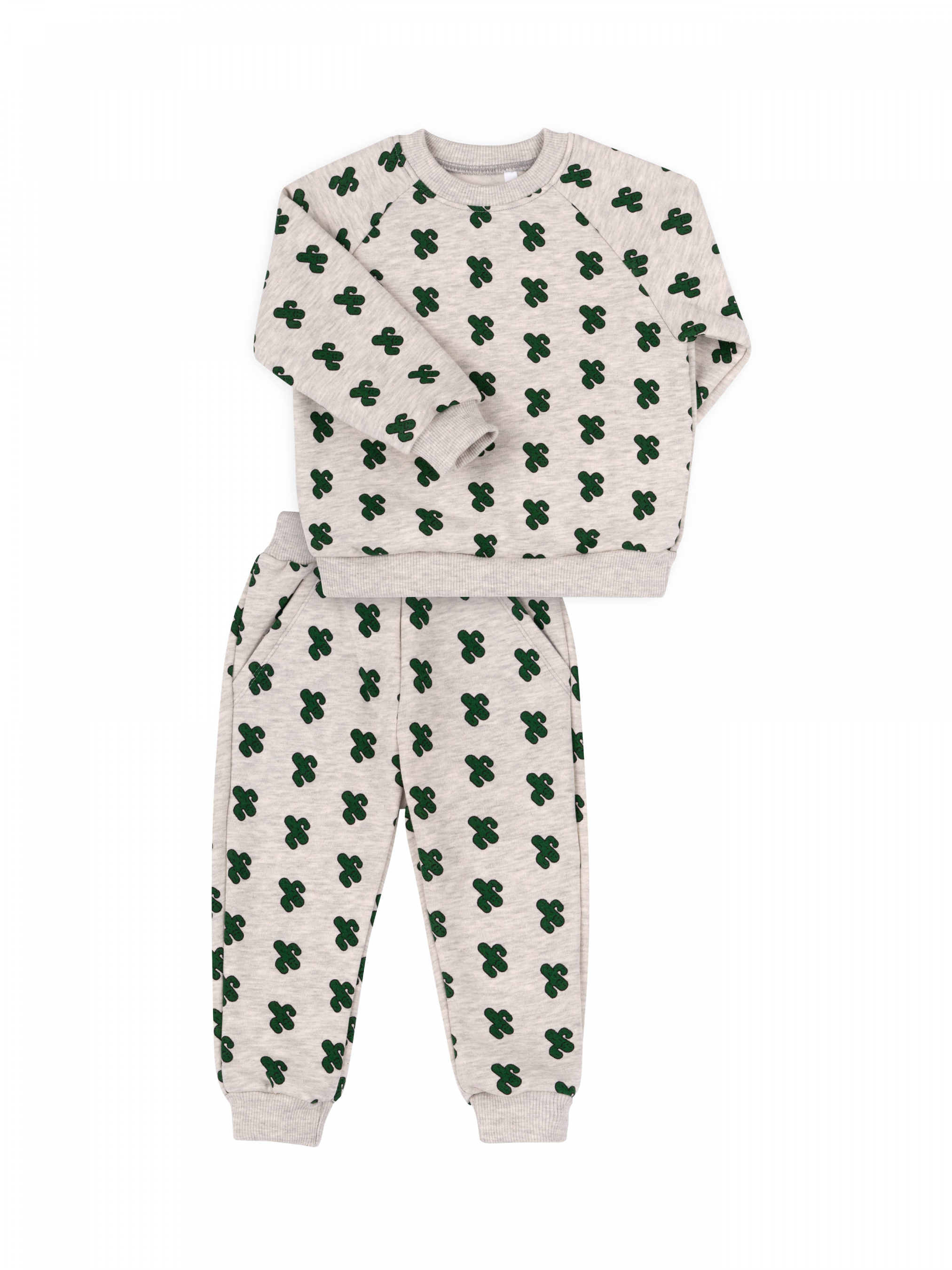 Костюм з трикотажу утепленого флісом. Джемпер середньої довжини. Рукав реглан, довгий, на манжеті. Горловина, низ джемпера та манжет рукава оброблені качкорсою. Штани прямого крою з кишенями, манжети та пояс з качкорси.
