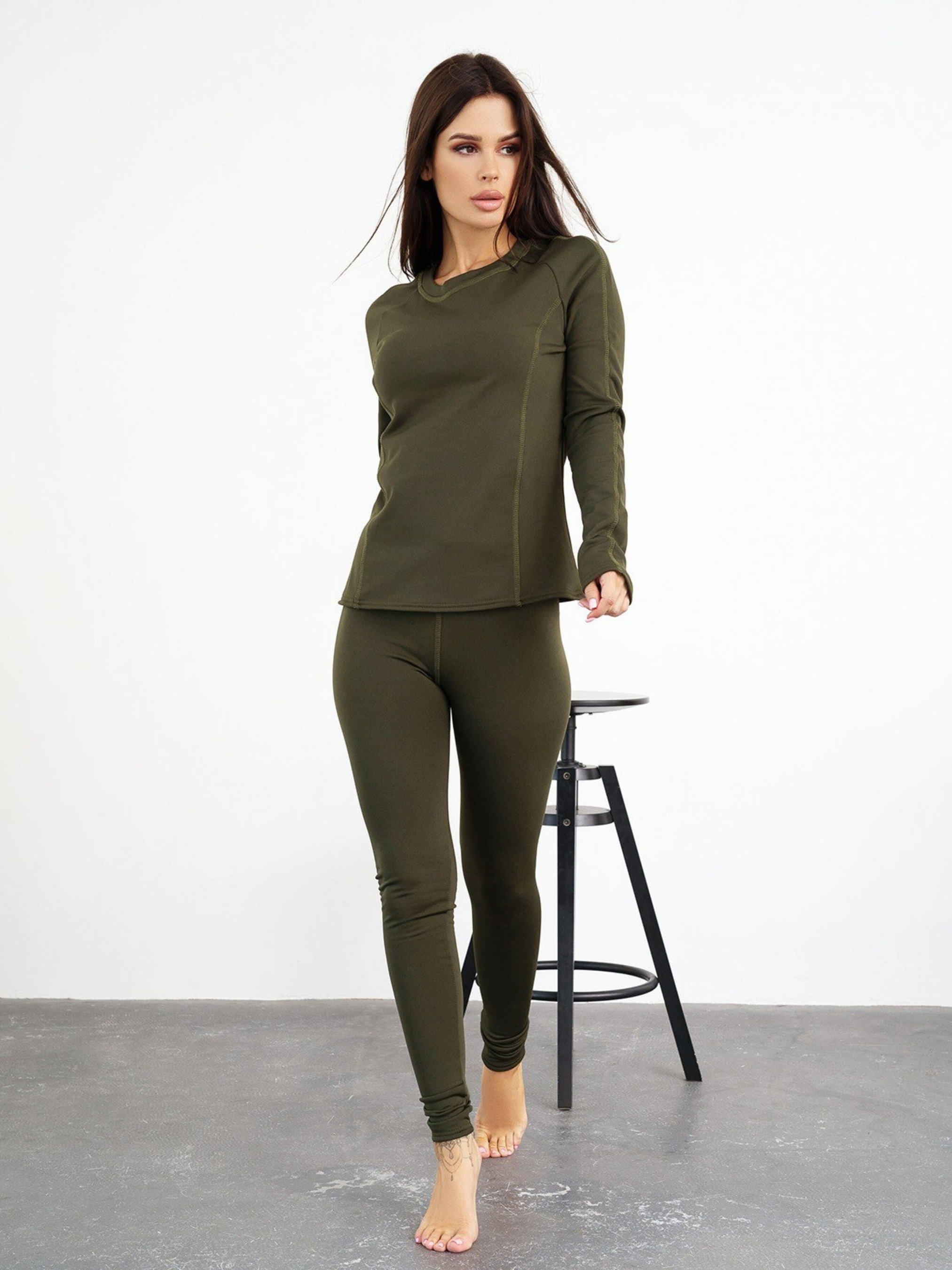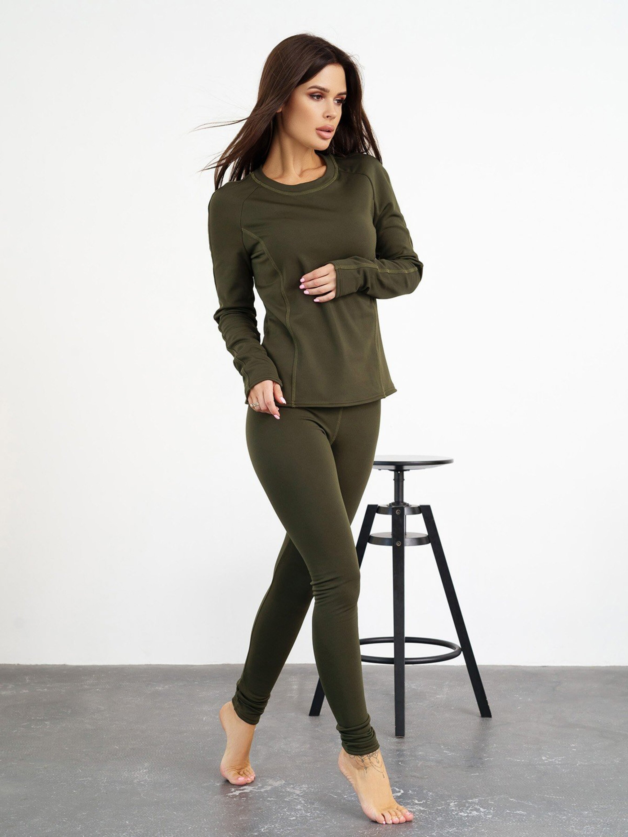 Комплект термобілизни з декоративними швами виконаний з еластичного мікродайвінгу з начосом кольору хакі. Верх з круглою горловиною та прямим кроєм оснащений довгими рукавами-реглан. Низ комплекту прямого облягаючого крою з високою посадкою та поясною гумкою. Склад: 79% поліестер, 21% еластан. Матеріал: Мікродайвінг з начосом.Напівобхват: Кофта: Груди: S (43), M (45), L (47), XL (49), Довжина виробу - 60, Рукав - 58, Штани: Талія: S (28-34 ), M (30-36), L (32-38), XL (34-40), Стегна: S (37), M (39), L (41), XL (43), Довжина виробу - 102, Довжина по внутрішньому шву - 79,Тканина: Висока еластичність
