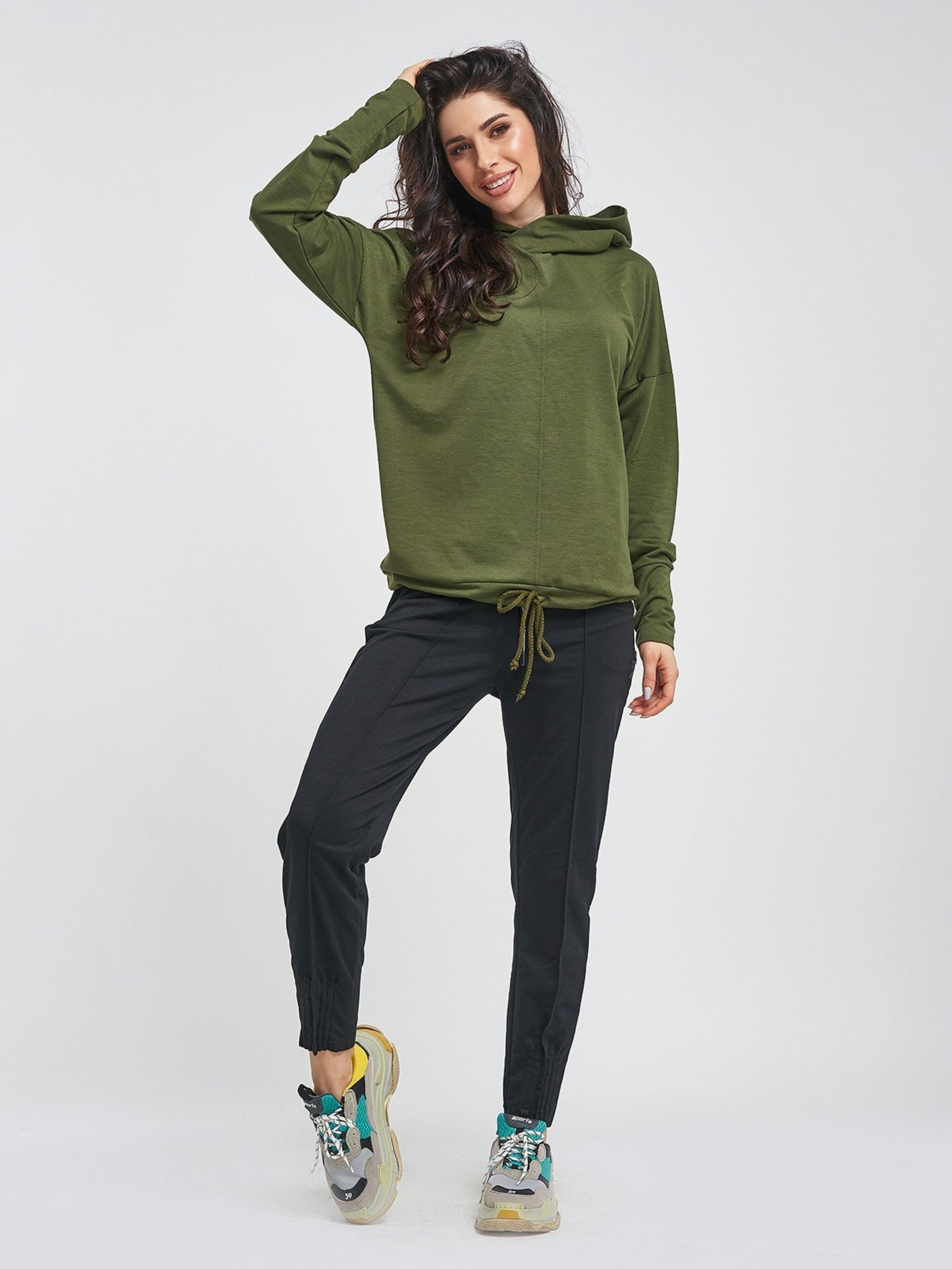 Чорні присборені спортивні штани зі стрілками. Чорні спортивні штани виконані з двухнітного трикотажу. Модель вільного присбореного до низу крою з необробленим швами нижнім зрізом і фіксованими стрілками. Штани з бічними і задніми кишенями, еластичною стрічкою на поясі і декоративними вставками. Склад: 50% бавовна, 50% поліестер. Матеріал: Двонитка. Штани : Талія S (64-74), M (68-78), L (72-82), XL (76-86), Стегна S (98), M (102), L (106), XL (110) ), Внутрішній шов - 72. Тканина: Середня еластичність.