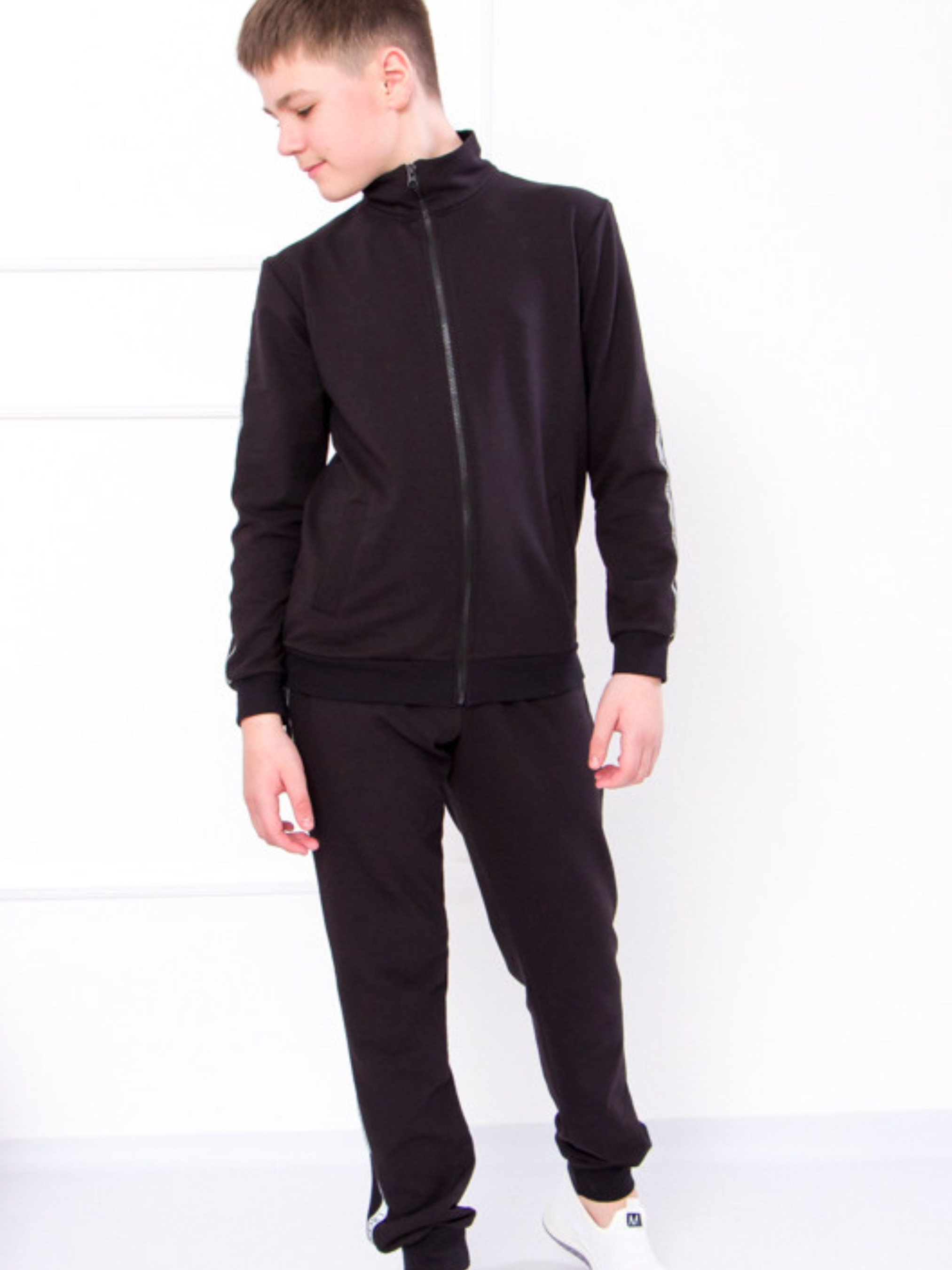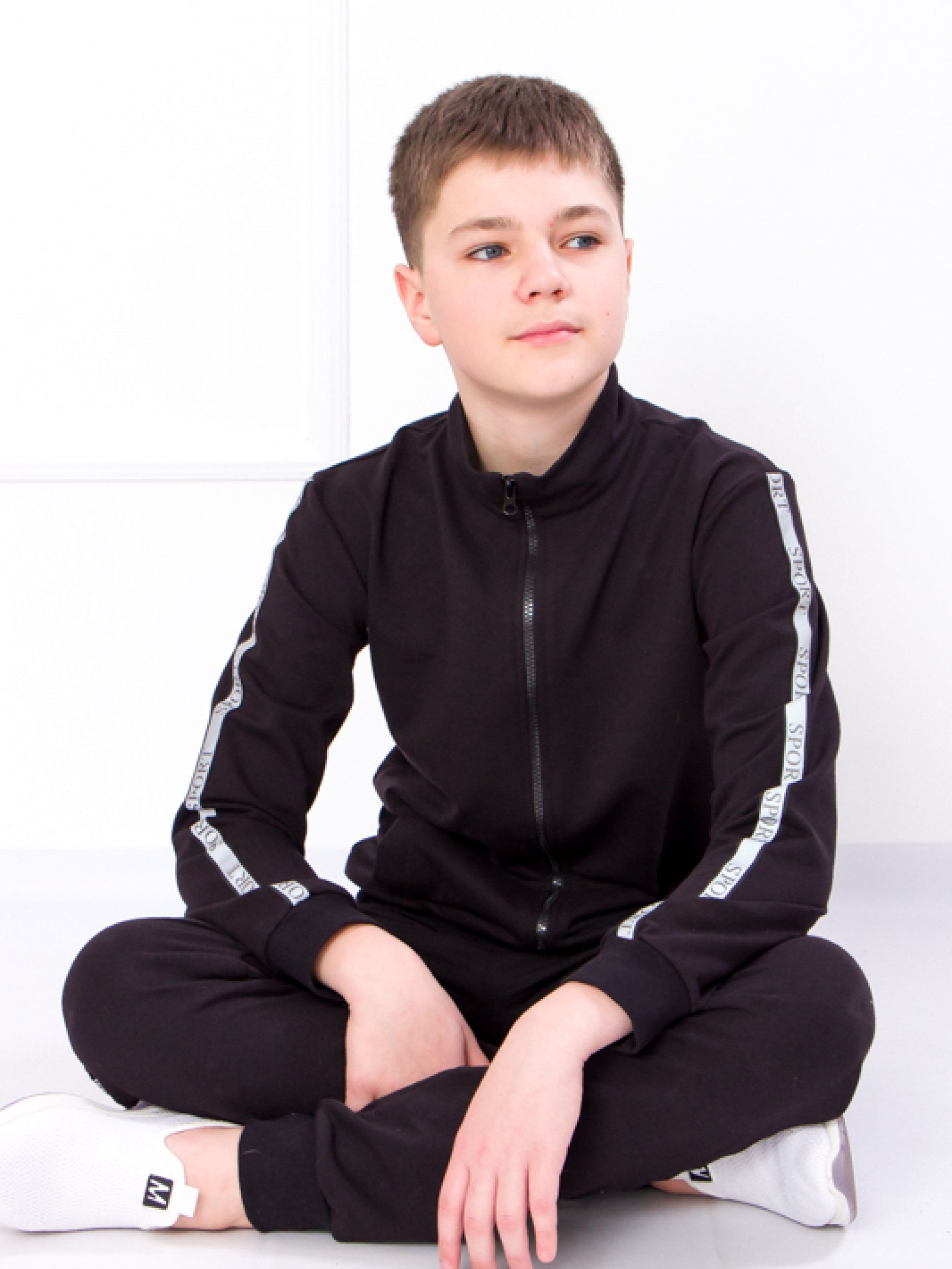 Полотно: двонитка однотонна Склад полотна: 80% бавовни 20% поліестру Зріст: 134-146158-164 Спортивний костюм створений дизайнерами відомого бренду Носи Своє призначений для хлопчика. Представлений комплект ідеально підходить як для шкільних уроків фізкультури так і для занять в секціях. Комплект складається з олімпійки і штанів. Низ рукава олімпійки оснащені практичними манжетами вони щільно прилягають до тіла і не пропускають холодне повітря. Довгі завужені штани міцно фіксуються на лінії талії за допомогою широкої еластичної резинки. Виріб декорований світловідбиваючим лампасом. Важливо що він не сковує рухів тому ніщо не завадить фізичним вправам. Такий матеріал тримає форму і не розтягується навіть в результаті тривалої експлуатації і численних пранів. Серед його переваг і те що він пропускає повітря відводить вологу. Догляд: прати вручну або за допомогою пральної машини при температурі до 30 градусів. Не застосовувати віджимання. Прасувати з виворітного боку через тонку тканину.