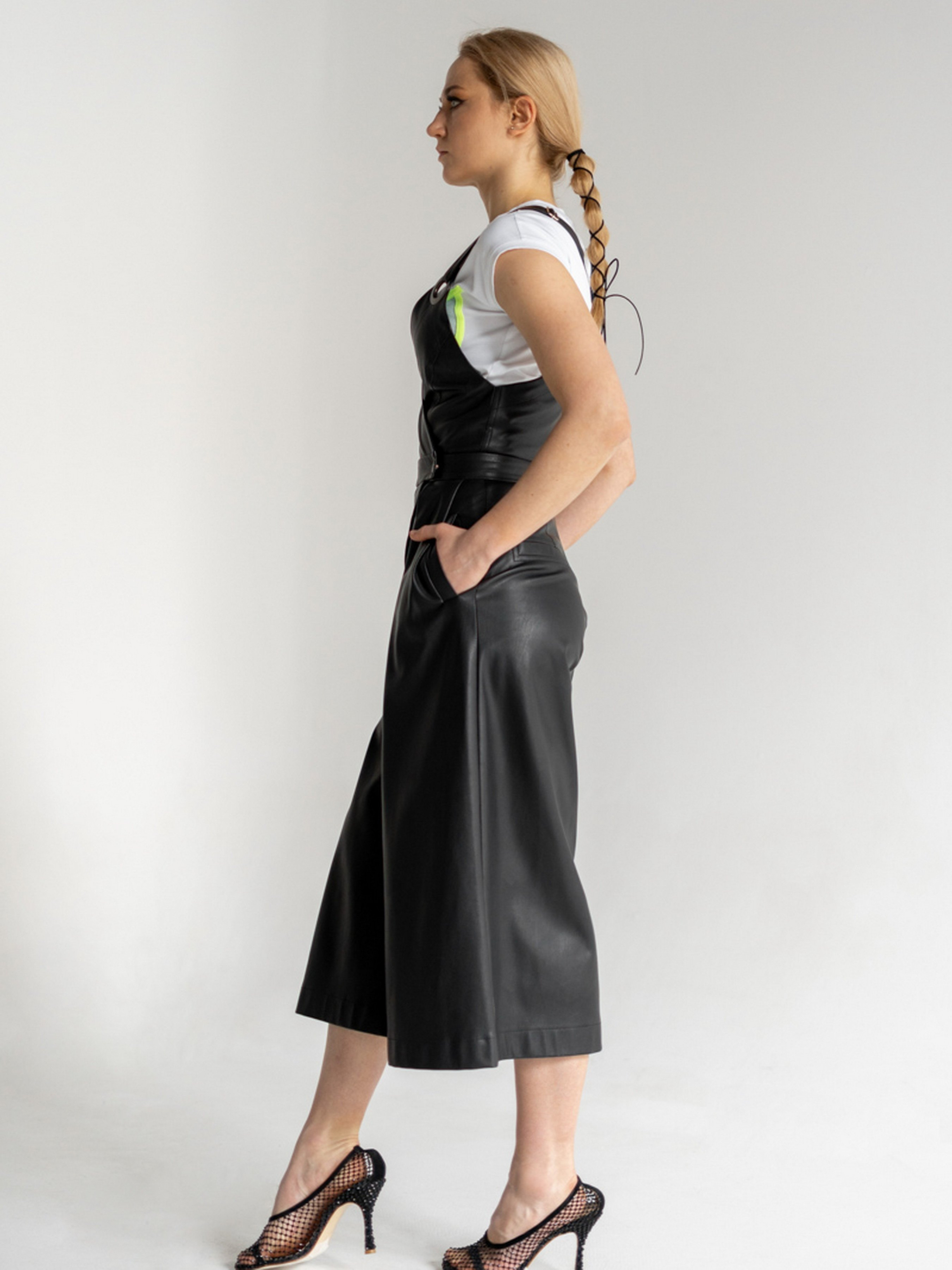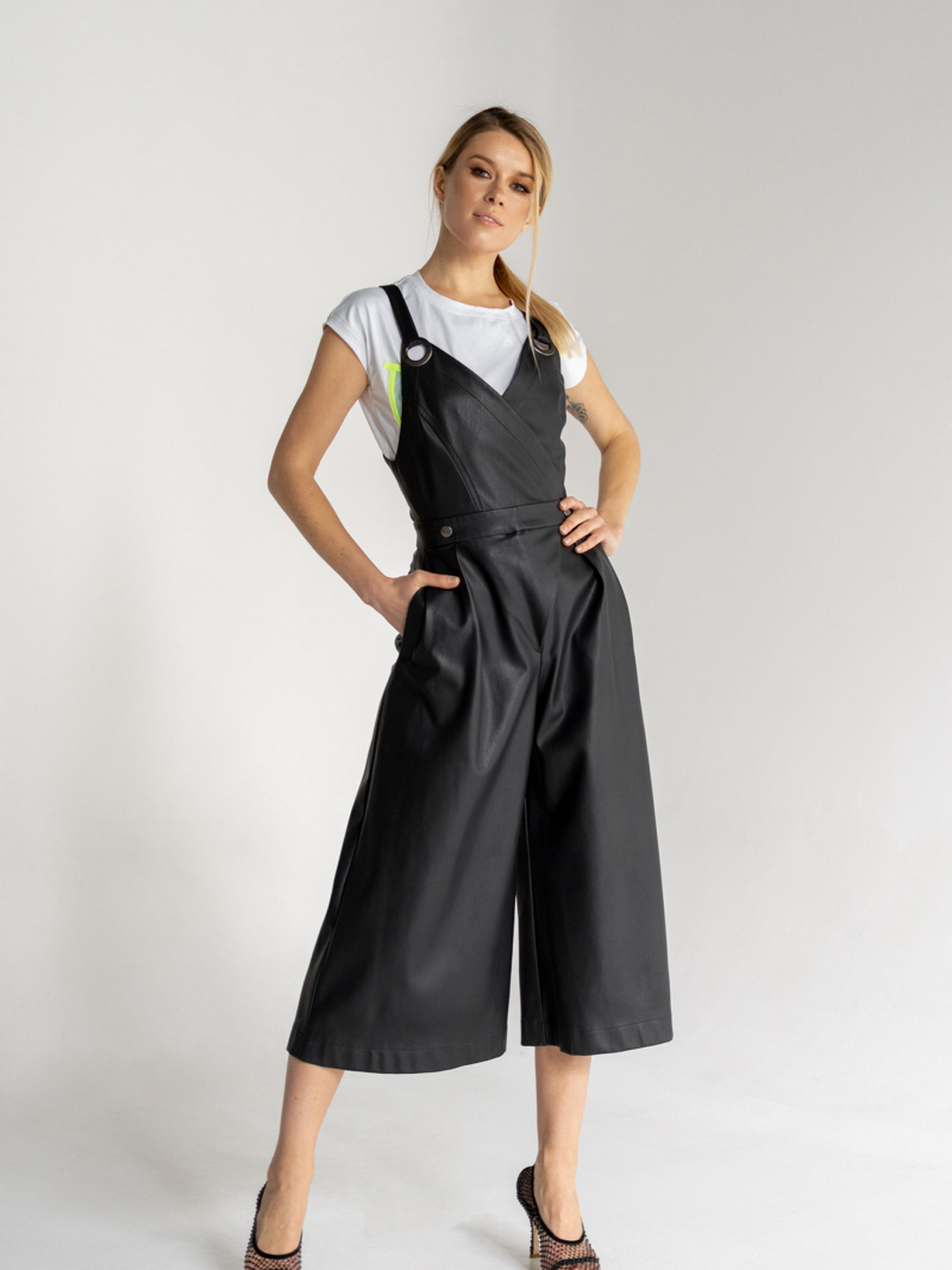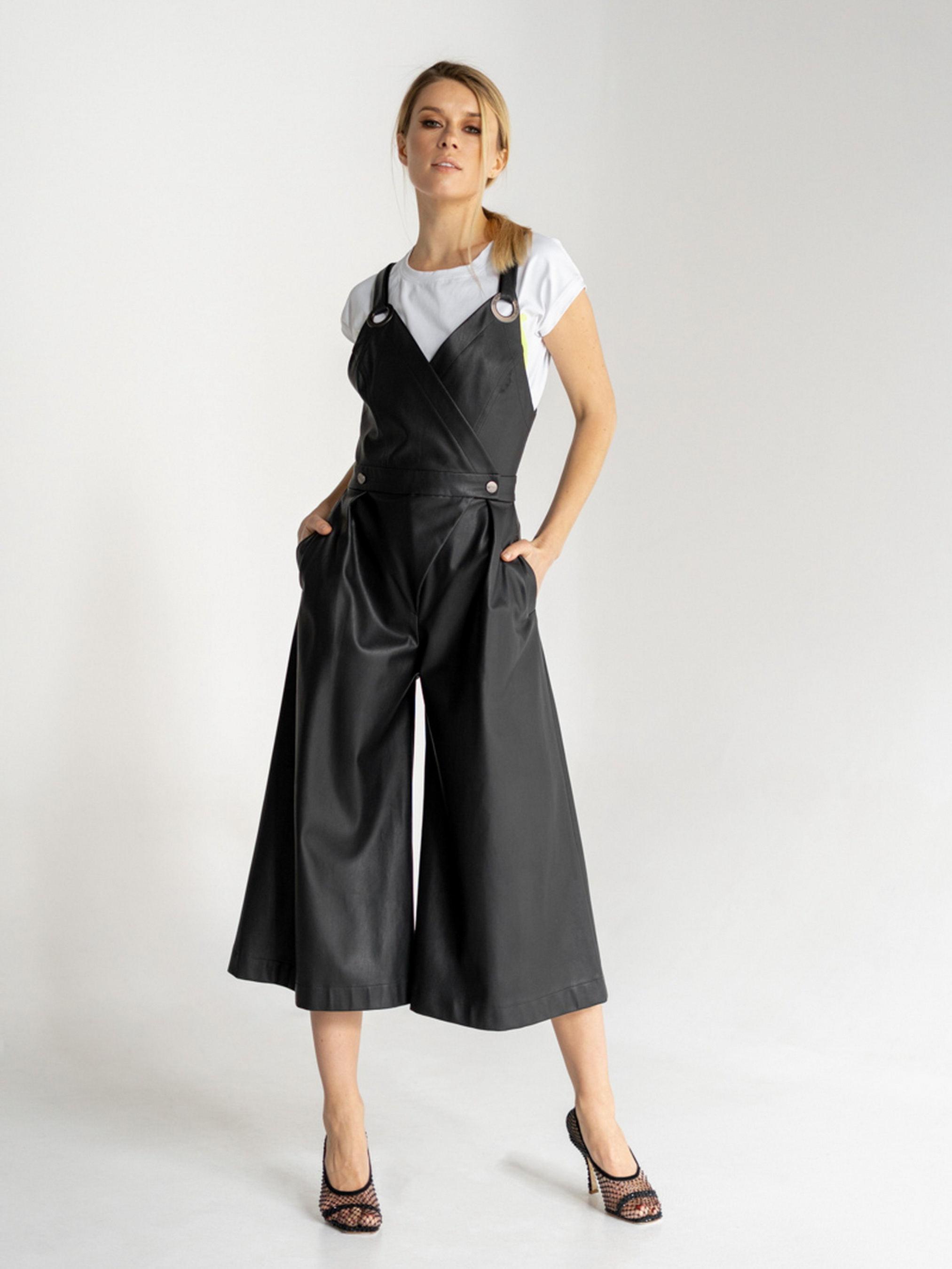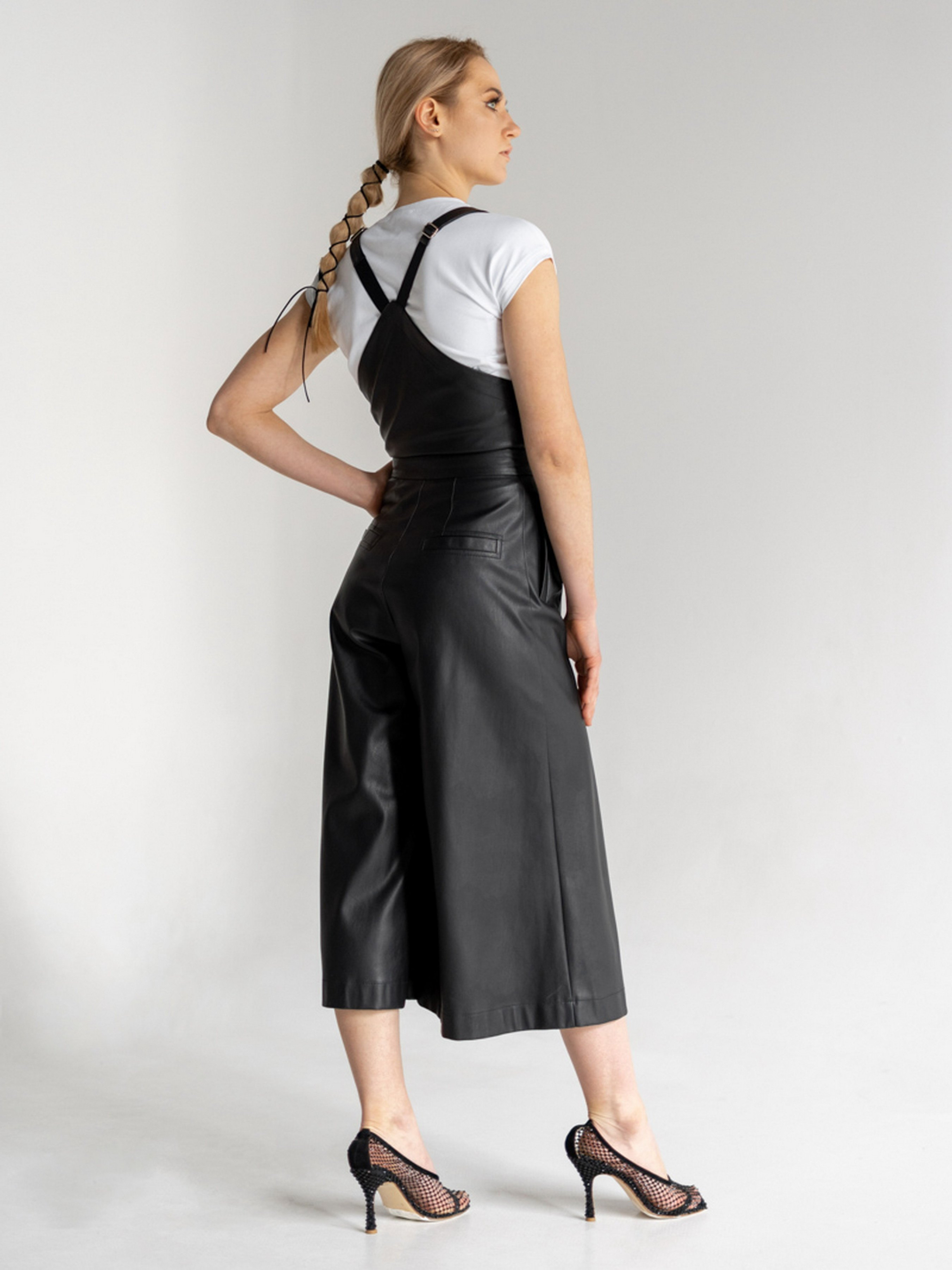 Комбінезон з екошкіри. Бретелі з бархатної резинки. Довжина брюк від талії - 89 см.