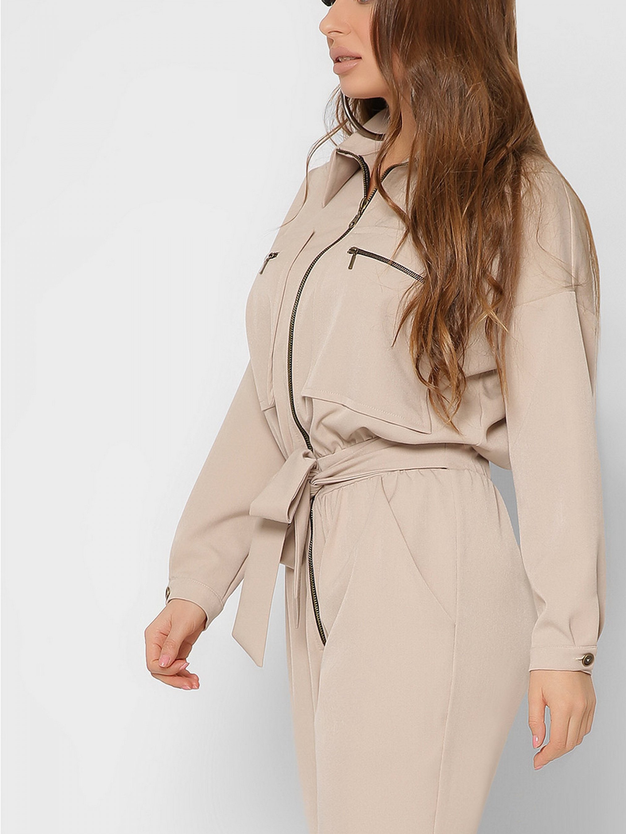 Модний жіночий комбінезон для романтичного і повсякденного способу. Модель має стояче-відкладний комір, рукав з манжетою на гудзику, звужений низ і вільний верх. 4 кишені: два накладних із застібкою на блискавці вгорі, два прорізних на брюках. На талії еластична гумка і тканинний пояс в комплекті. Застібається виріб на блискавку.