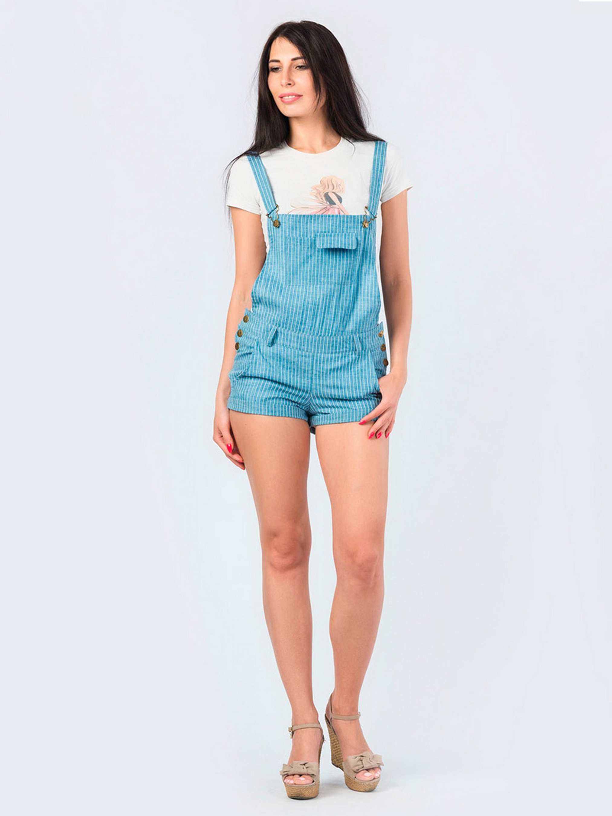 Легкий літній комбінезон ідеально виглядає на стрункій фігурі. Він являє собою шорти, відмінно прилягають до нижньої частини тіла. А також передній і задній рівних частин, що підтримують бретелями. Попереду внизу моделі знаходяться бічні кишені, що робить її більш зручною і практичною. Комбінезон буде мати чудовий вигляд з футболками, мають різної довжини рукав. Для його пошиття виробник використовував комбіновану тканину, що складається в основному з натуральних волокон. До властивостей даного матеріалу з упевненістю можна віднести чудову вентиляцію повітря. Навіть в самий задушливий день в комбінезоні буде зовсім не жарко.