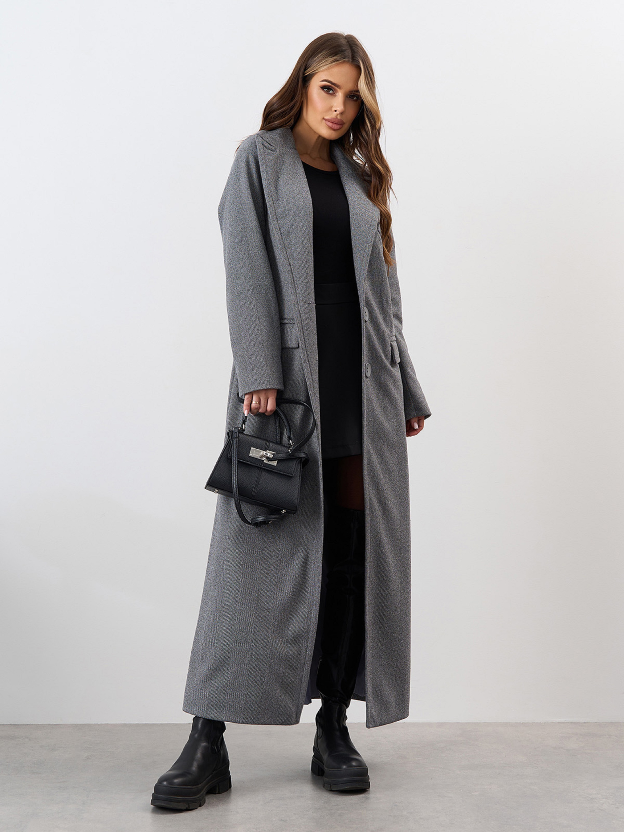 Сіре кашемірове пальто максі довжини. Напівобхват: Груди: S (48), M (50), L (52), XL (54), Талія: S (48), M (50), L (52), XL (54), Стегна: S (48), M (50), L (52), XL (54), Довжина виробу - 129, Рукав - 60, Тканина: Низької еластичності.