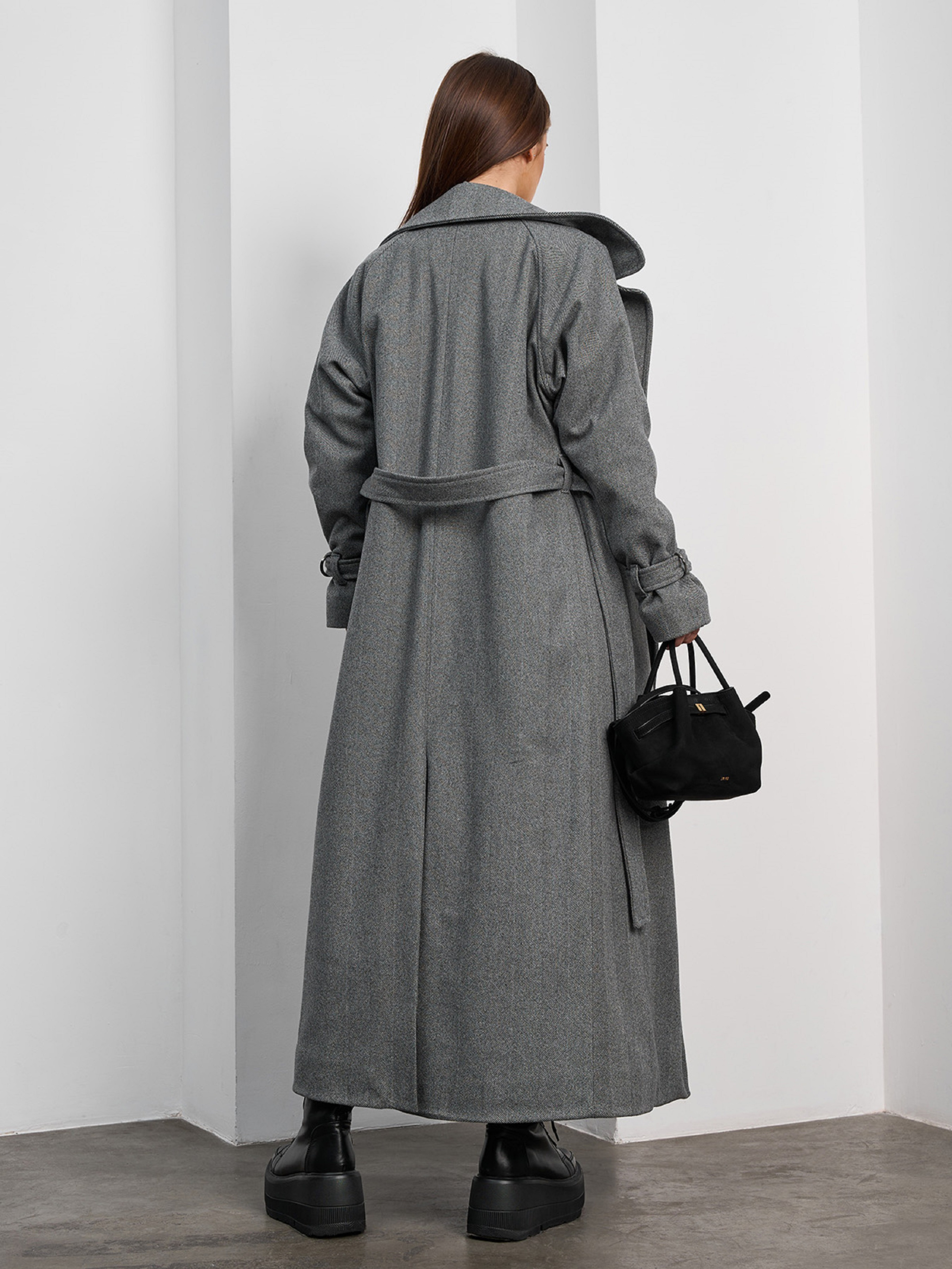 Довге тепле пальто із кашеміру сірого кольору з орнаментом ялинка на нижній синтепоновій підкладці. Пальто на гудзиках із прямим вільним кроєм та розрізом ззаду. Модель з кишенями та знімним поясом у тон. Напівобхват: Груди: S (56), M (58), L (60), XL (62), Талія: S (52), M (54), L (56), XL (58), Стегна: S (55), M (57), L (59), XL (61), Довжина виробу - 126, Рукав - 54, Тканина: Низької еластичності.