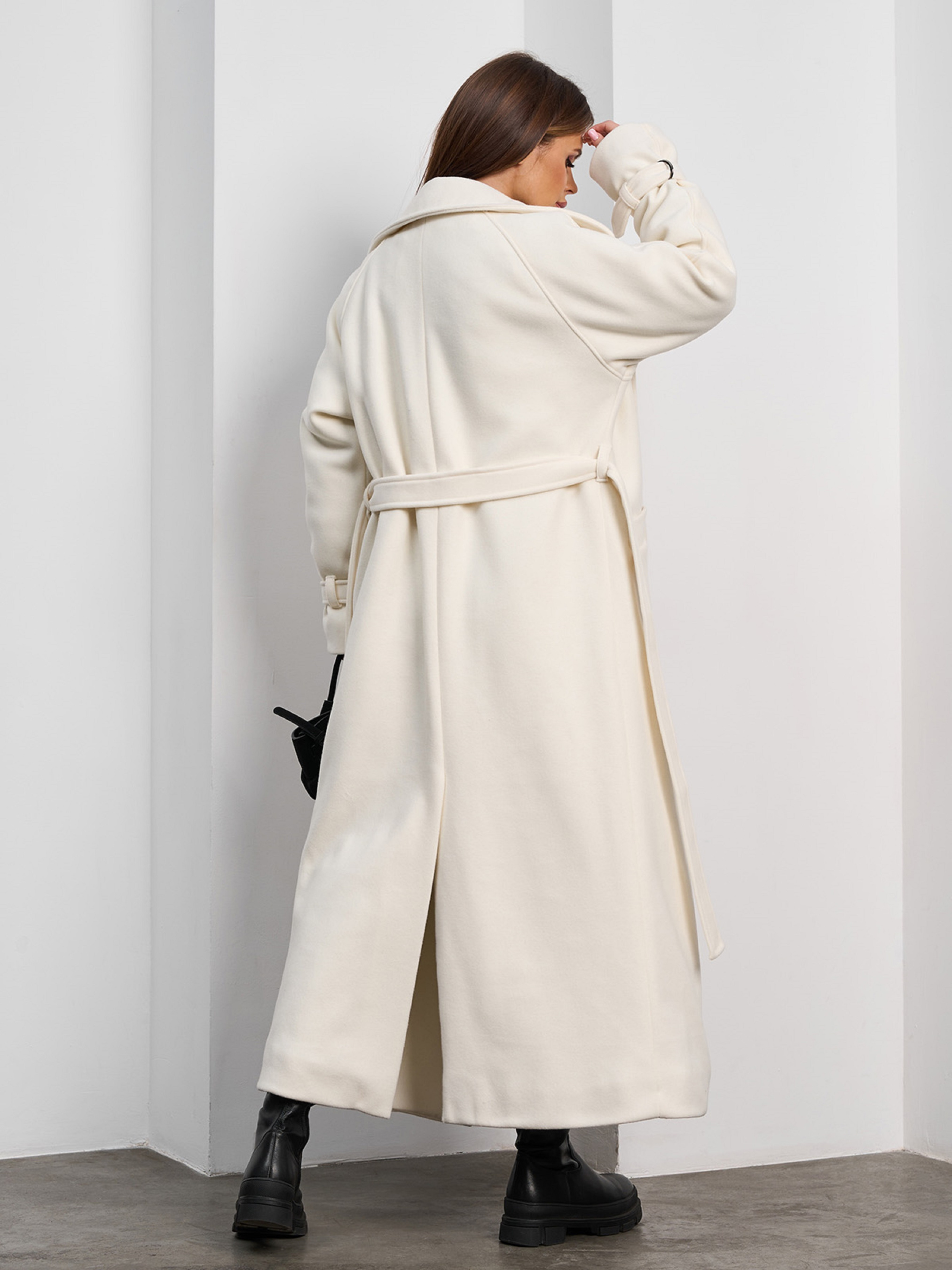 Молочне утеплене пальто з однотонного кашеміру на синтепоновому підкладі. Модель вільного прямого крою з хлястиками на довгих рукавах та кишенями. Пальто максі довжини з розрізом ззаду та класичним коміром. Пальто комплектується поясом. Напівобхват: Груди: S (56), M (58), L (60), XL (62), Талія: S (52), M (54), L (56), XL (58), Стегна: S (55), M (57), L (59), XL (61), Довжина виробу - 126, Рукав - 54, Тканина: Низької еластичності.