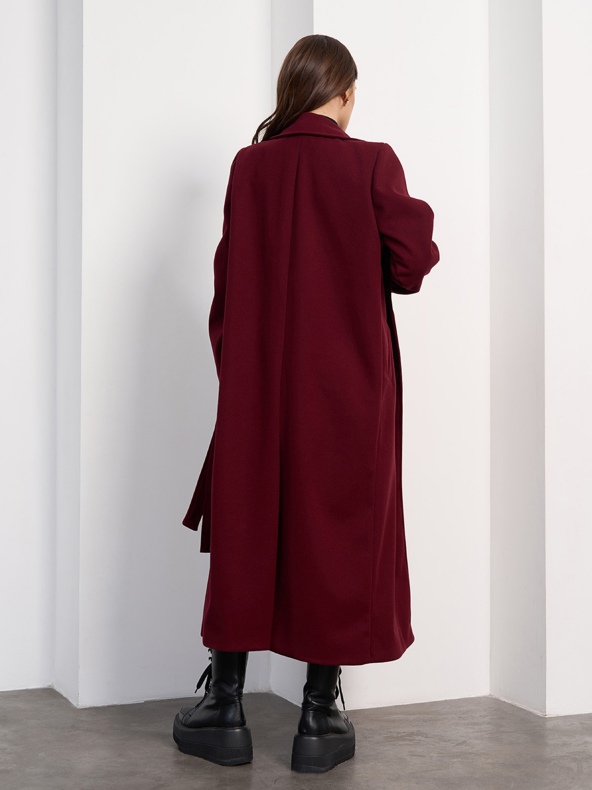 Двобортне міді пальто на ґудзиках, виконане з кашеміру темно-бордового кольору. Пальто з прямим кроєм, англійським коміром та поясом. Пальто з кишенями, нагрудною листочкою та нижньою підкладкою. Напівобхват: Груди: S (51), M (53), L (55), XL (57), XXL (59), 3XL (61), Талія: S (51), M (53), L (55), XL (57), XXL (59), 3XL (61), Стегна: S (51), M (53), L (55), XL (57), XXL (59), 3XL (61), Довжина виробу — 123, Рукав — 63, Тканина: Низької еластичності.