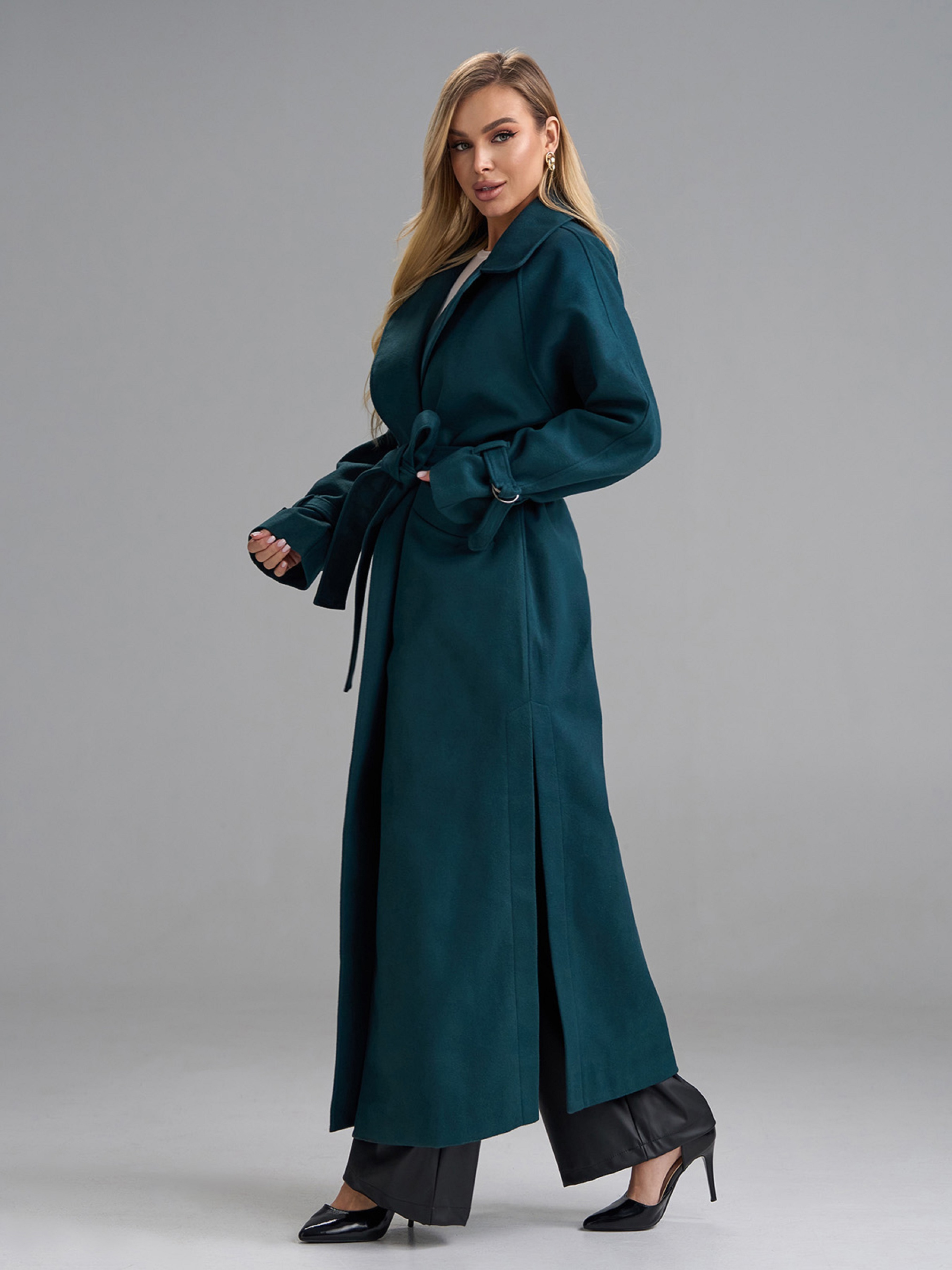 Бірюзове довге пальто з бічними розрізами, виконане з пальтової тканини. Пальто на запах із поясом та довгими рукавами з хлястиками. Пальто прямого крою з класичним коміром та кишенями. Пальто із текстильним підкладом. Напівобхват: Груди: S (59), M (61), L (63), XL (65), Талія: S (55), M (57), L (59), XL (61), Стегна: S (59), M (61), L (63), XL (65), Довжина виробу — 136, Рукав — 47, Тканина: Низької еластичності.