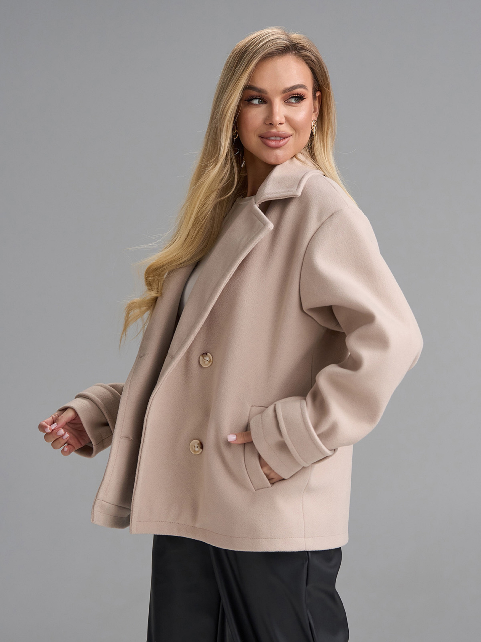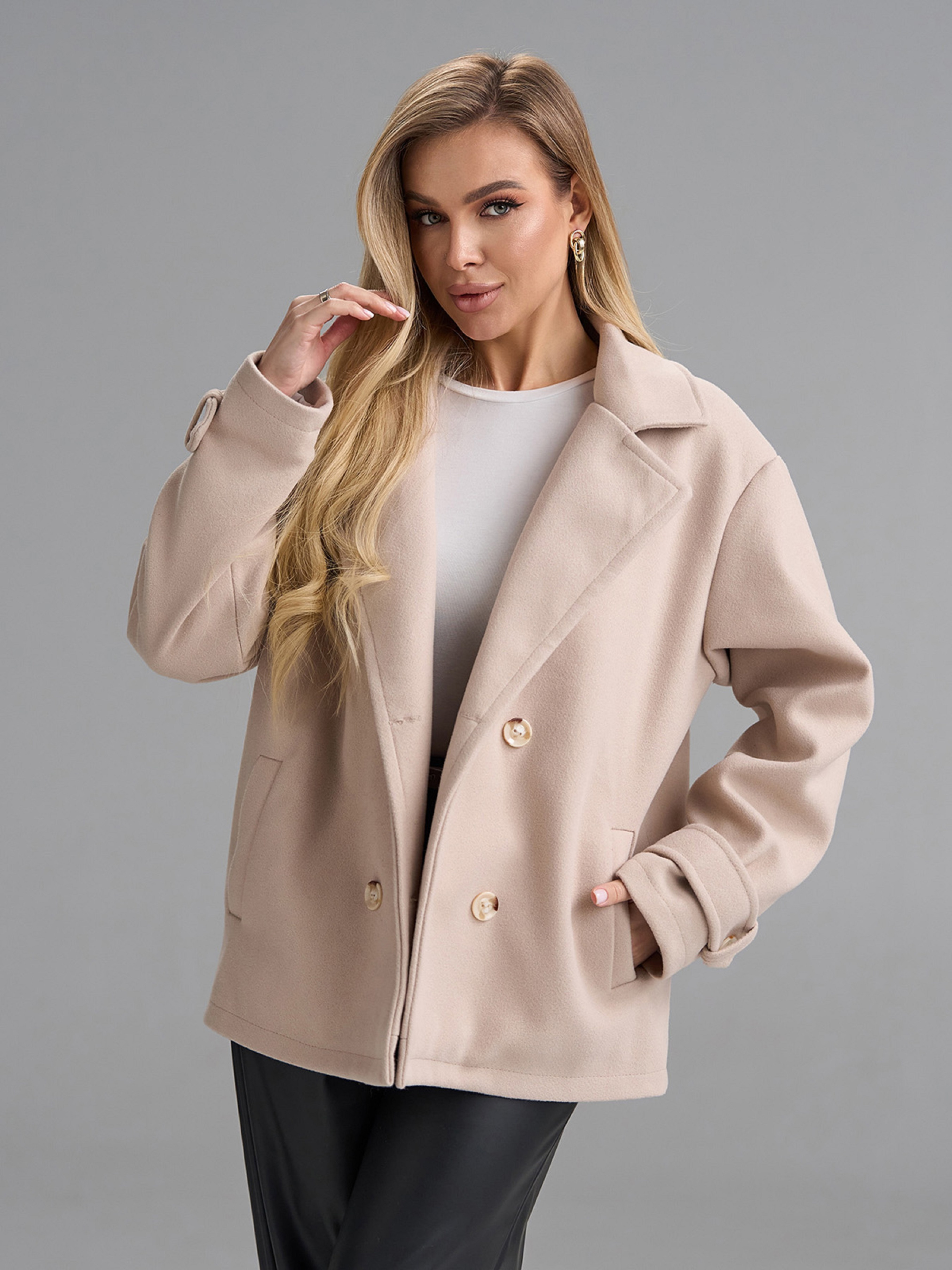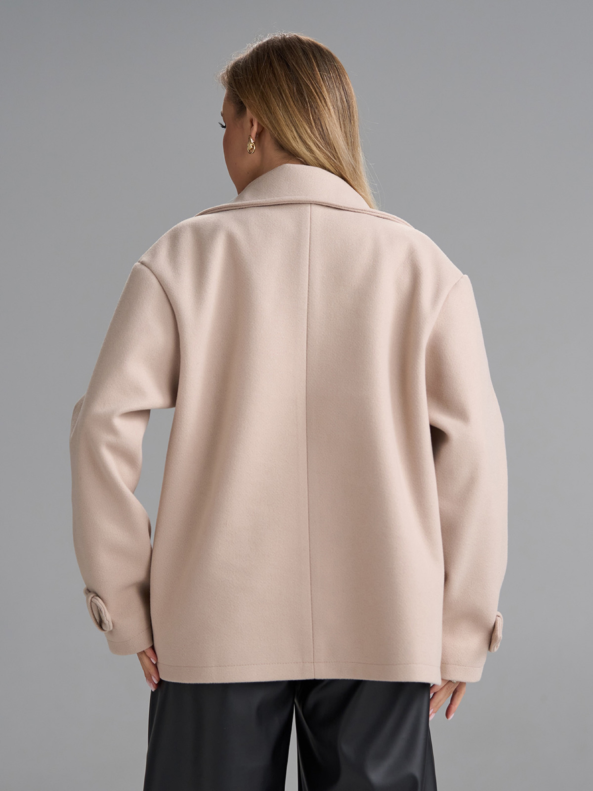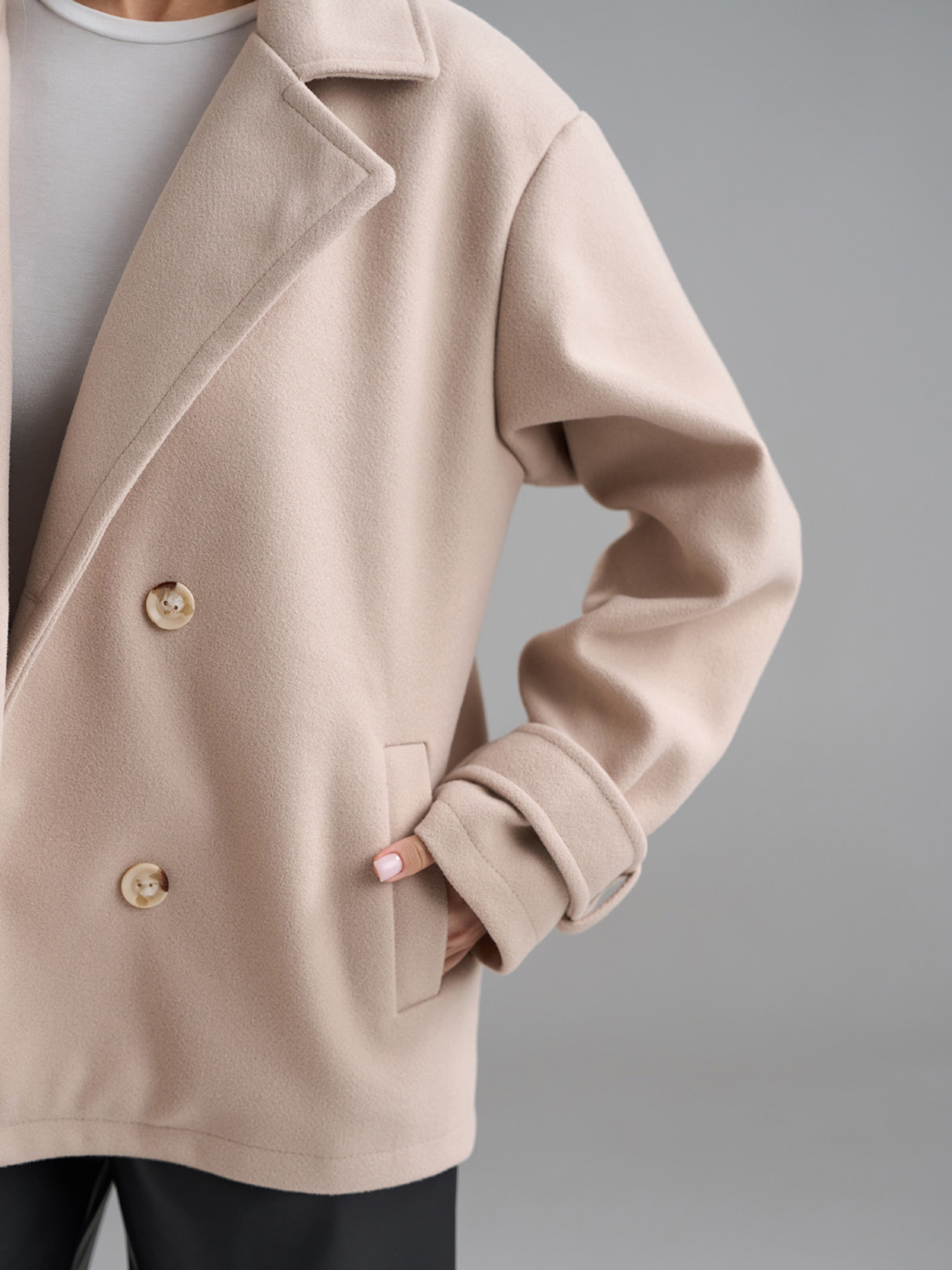 Двубортное укороченное пальто-пиджак из бежевого кашемира с текстильным подкладом. Изделие с двумя рядами пуговиц, английским воротником и карманами. Рукава декорированы хлястиками в районе манжет. Полуобхват: Грудь: S (55), M (57), L (59), XL (61), Длина изделия - 66-68*, Рукав - 58-60*, Ткань: Низкой эластичности.