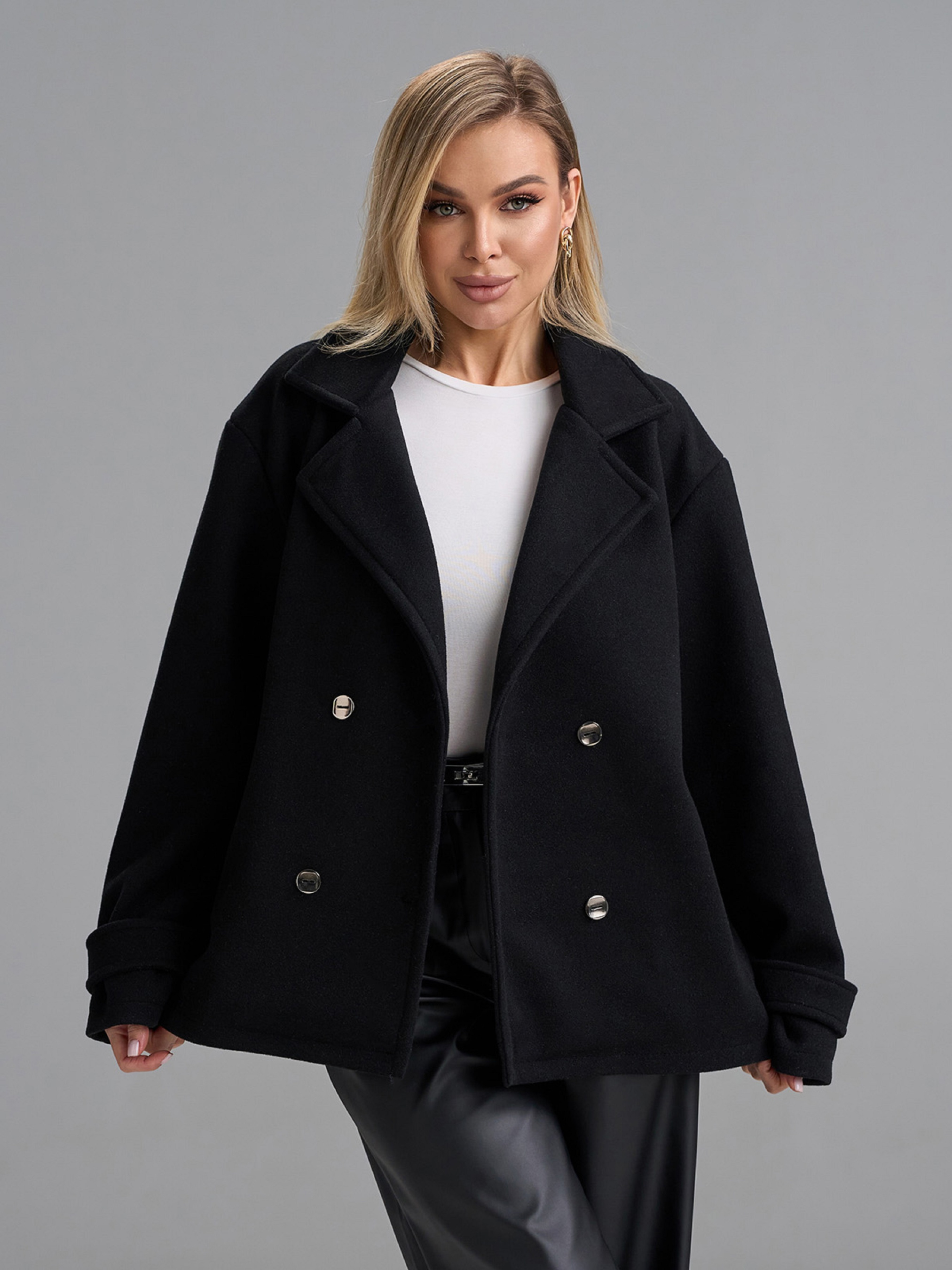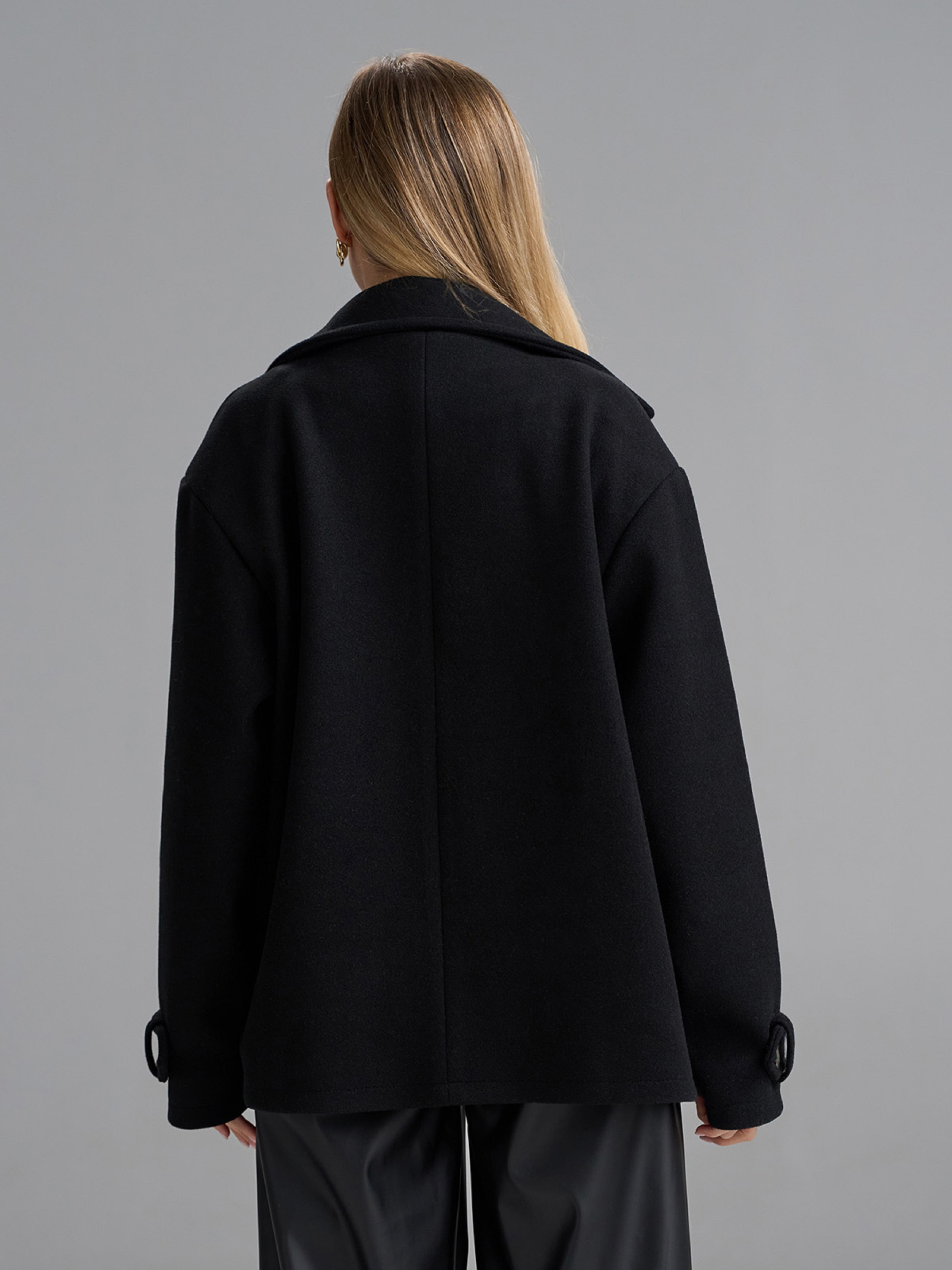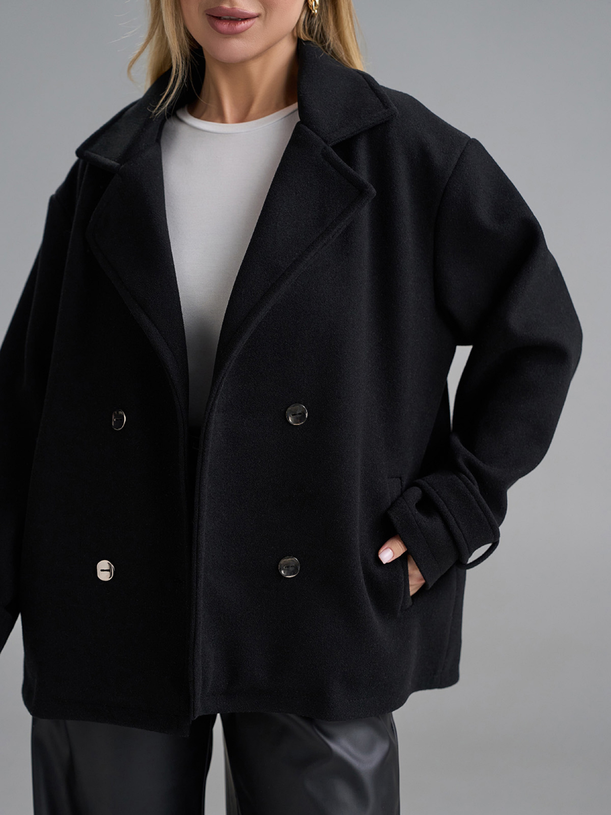 Двубортное укороченное пальто-пиджак из черного кашемира с текстильным подкладом. Изделие с двумя рядами пуговиц, английским воротником и карманами. Рукава декорированы хлястиками в районе манжет. Полуобхват: Грудь: S (55), M (57), L (59), XL (61), Длина изделия - 66-68*, Рукав - 58-60*, Ткань: Низкой эластичности.