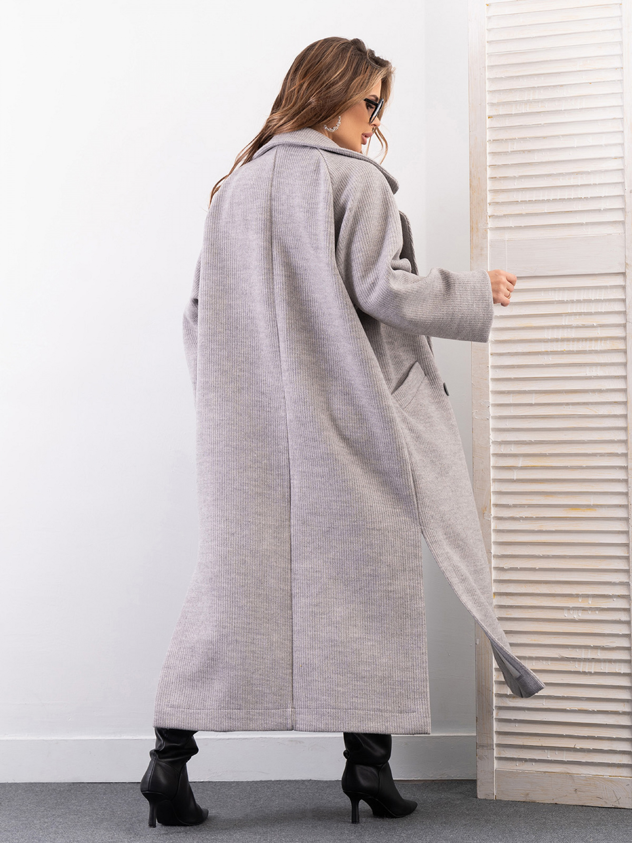 Сіре подовжене пальто з розрізами Напівобхват: Груди: S (58), M (60), L (62), XL (64), Талія: S (56), M (58), L (60), XL (62) , Стегна: S (56), M (58), L (60), XL (62), Довжина виробу - 121, Рукав - 56, Тканина: Низька еластичність.